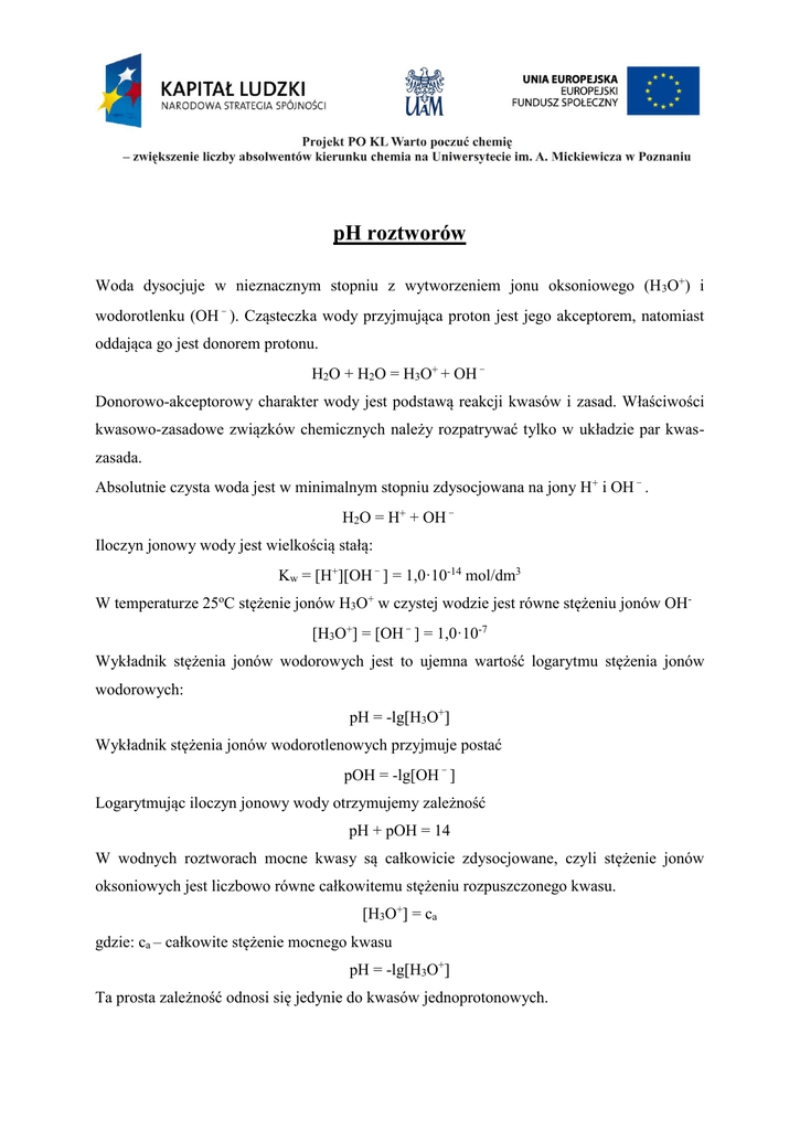 pH roztworów Woda dysocjuje w nieznacznym stopniu z wytworzeniem jonu oksoniowego (H 3O+) i wodorotlenku (OH ). Cząsteczka wody przyjmująca proton jest jego akceptorem, natomiast oddająca go jest donorem protonu. H2O + H2O = H3O+ + OH Donorowo-akceptorowy charakter wody jest podstawą reakcji kwasów i zasad. Właściwości kwasowo-zasadowe związków chemicznych należy rozpatrywać tylko w układzie par kwaszasada. Absolutnie czysta woda jest w minimalnym stopniu zdysocjowana na jony H+ i OH . H2O = H+ + OH Iloczyn jonowy wody jest wielkością stałą: Kw = [H+][OH ] = 1,0·10-14 mol/dm3 W temperaturze 25oC stężenie jonów H3O+ w czystej wodzie jest równe stężeniu jonów OH[H3O+] = [OH ] = 1,0·10-7 Wykładnik stężenia jonów wodorowych jest to ujemna wartość logarytmu stężenia jonów wodorowych: pH = -lg[H3O+] Wykładnik stężenia jonów wodorotlenowych przyjmuje postać pOH = -lg[OH ] Logarytmując iloczyn jonowy wody otrzymujemy zależność pH + pOH = 14 W wodnych roztworach mocne kwasy są całkowicie zdysocjowane, czyli stężenie jonów oksoniowych jest liczbowo równe całkowitemu stężeniu rozpuszczonego kwasu. [H3O+] = ca gdzie: ca – całkowite stężenie mocnego kwasu pH = -lg[H3O+] Ta prosta zależność odnosi się jedynie do kwasów jednoprotonowych. W roztworach całkowicie zdysocjowanych mocnych zasad stężenie jonów wodorotlenkowych zależy od całkowitego stężenia rozpuszczonej zasady oraz od liczby jonów wodorotlenkowych powstających w czasie rozpuszczania jednej cząsteczki zasady. [OH ] = n cb gdzie: cb – całkowite stężenie mocnej zasady, n – współczynnik stechiometryczny równy liczbie jonów wodorotlenkowych utworzonych w wyniku dysocjacji jednej cząsteczki zasady pH = 14 + lg[OH ] Rozpatrując pH wodnych roztworów słabych kwasów, jako jedyną reakcję uwzględnia się dysocjację tych elektrolitów. HA + H2O = H3O+ + A Stężenie jonów oksoniowych obliczamy z uproszczonego wzoru, jeżeli ca/Ka˃400 [ H 3O ] K a ca pH roztworów słabych zasad określa się podobnie jak słabych kwasów [OH ] K b cb gdy cb/Kb˃400. Stopień dysocjacji (α) – jest to stosunek liczby cząsteczek zdysocjowanych (Nz) do liczby cząsteczek wprowadzonych do roztworu (Nw): Nz Nw Stosunek ten może być również wyrażony w procentach: Nz 100% Nw i wówczas informuje, jaki procent cząsteczek uległ rozpadowi na jony. W realnych obliczeniach chemicznych nie operujemy liczbami cząsteczek, ponieważ ich bezpośredni pomiar jest niemożliwy. Wielkości Nz i Nw zastępujemy w powyższym wzorze odpowiednio liczbą moli cząsteczek zdysocjowanych (nz) i liczbą moli cząsteczek wprowadzonych (nw). nz 100% nw Zadania 1. Obliczyć pH i pOH roztworu, w którym stężenie jonów wodorotlenowych wynosi 3,16·10-9 mol/dm3. 2. Obliczyć pH roztworu otrzymanego w wyniku zmieszania równych objętości dwóch roztworów HClO4, których pH wynoszą odpowiednio 2 i 4. 3. Do jakiej objętości należy rozcieńczyć 10cm3 roztworu Ba(OH)2 o stężeniu 2% i gęstości 1,0175g/cm3, aby pH po rozcieńczeniu wynosiło 11? 4. Do 100cm3 0,1000mol/dm3 HCl dodano 90cm3 0,1 mol/dm3 NaOH. Jakie jest pH roztworu? 5. Do 100cm3 0,1 mol/dm3 HCl dodano 60cm3 roztworu 0,15 mol/dm3 NaOH. Jakie jest pH roztworu? 6. Przygotowano roztwór kwasu octowego o c=0,2mol/dm3. Oblicz jego stopień dysocjacji α oraz pH roztworu. 7. 25ml roztworu słabego jednoprotonowego kwasu o stężeniu 0,4mol/l rozcieńczono wodą do 100ml, Ile razy wzrósł stopień dysocjacji tego kwasu? 8. 25ml 40-procentowego kwasu octowego (d=1,049g/ml) rozcieńczono wodą do 200ml. Następnie odpipetowano 10ml tego roztworu do kolby o pojemności 50ml i zawartość kolby uzupełniono wodą do kreski. Obliczyć pH uzyskanego roztworu kwasu oraz stopień dysocjacji kwasu. 9. Ile mililitrów wody destylowanej należy dodać do 10ml roztworu HNO 2 o stężeniu 0,5mol/l, aby pH roztworu po rozcieńczeniu wynosiło 2,50? 10. Jaką wartość ma stała dysocjacji kwasu chlorooctowego, jeżeli pH roztworu tego kwasu o stężeniu 1mol/l wynosi 1,42? 11. W 1 l wody destylowanej rozpuszczono 100mg benzyloaminy. Jakie jest pH roztworu? 12. Ile razy zwiększy się stopień dysocjacji metyloaminy, jeżeli 100ml roztworu tej zasady o pH=12 rozcieńczono wodą destylowaną do objętości 1 l?