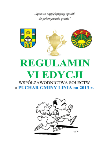 „Sport to najpiękniejszy sposób do pokonywania granic” REGULAMIN VI EDYCJI WSPÓŁZAWODNICTWA SOŁECTW o PUCHAR GMINY LINIA na 2013 r. 1. CEL • popularyzacja sportu, turystyki i rekreacji wśród dzieci, młodzieży i dorosłych z gminy Linia • możliwość aktywnego spędzania czasu w gronie rodzinny, znajomych i przyjaciół, • wyłonienie indywidualnych i drużynowych Mistrzów Gminy Linia w poszczególnych kategoriach wiekowych w poszczególnych dyscyplinach sportowych w 2013 r. • wyłonienie najbardziej usportowionych sołectw gminy Linia na 2013 r. • integracja mieszkańców gminy poprzez sport, rekreację, wspólne kibicowanie • integracja z osobami niepełnosprawnymi • wcielanie w życie zasad fair – play • promowanie postaw prozdrowotnych • promocja gminy Linia 2. ORGANIZATOR • Gminny Dom Kultury w Lini 3. WSPÓŁORGANIZATORZY • • • • • • • • • Urząd Gminy w Lini Gminne Stowarzyszenie LZS w Lini Klub Strzelecki „Gryf” w Słupsku Jednostki OSP w Lini, Strzepczu, Lewinie i Kętrzynie Rady Sołeckie, działacze terenowi Koło Gospodyń Wiejskich w Strzepczu Koło Gospodyń Wiejskich w Kętrzynie Szkoły z terenu gminy Sponsorzy indywidualni 4. HONOROWY PATRONAT • Wójt Gminy Linia • Przewodniczący Rady Gminy Linia - Łukasz Jabłoński - Czesław Hinz PATRONAT MEDIALNY: - Radio Kaszëbe, Dziennik Bałtycki, Kibol - www.sportowekaszuby.pl, Panorama Powiatu, Ekspress Powiatu, Klëka, www.gminalinia.com.pl, 5. TERMIN i MIEJSCE Puchar Gminy jest imprezą całoroczną. Termin i szczegółowe regulaminy poszczególnych zawodów będą przekazywane uczestnikom – działaczom, sołtysom, radnym na 10 dni przed rozegraniem danej konkurencji. Poszczególne konkurencje będą rozgrywane w sołectwach, które posiadają odpowiednie warunki do rozegrania danej konkurencji. Wyniki i komunikaty z odbytych zawodów będą dostępne na stronie internetowej gminy Linia, a także w Gminnym Domu Kultury w Lini. 6. SPOSÓB PRZEPROWADZANIA KONKURENCJI Jest on uzależniony od specyfiki konkurencji; ilości zawodników, drużyn i będzie podany bezpośrednio przed rozegraniem konkurencji – w dniu zawodów lub na zebraniach zwołanych na okoliczność przyjęcia zgłoszeń. 7. UCZESTNICTWO W zawodach wchodzących w skład Współzawodnictwa Sołectw o PUCHAR GMINY LINIA 2013 mogą startować: • mieszkańcy Gminy Linia – zameldowani na stałe bądź czasowo • mieszkańcy sezonowi – posiadający na terenie mieszkania bądź domki wypoczynkowe – zdobywając punkty dla danego sołectwa z możliwością wywalczania nagrody, musi być potwierdzenie sołtysa bądź okolicznych mieszkańców • byli mieszkańcy gminy z najbliższą rodziną ( żona, mąż, dzieci) – po uprzednim oświadczeniu sołtysa, bądź innych mieszkańców. W przypadku gdy dane sołectwo nie wystawia drużyny – zawodnik może reprezentować inne sołectwo i wówczas zdobywa dla niego punkty. Przed każdymi zawodami drużynowymi kierownicy ekip sołeckich winni złożyć u organizatora listy zgłoszeniowe – imię i nazwisko, datę urodzenia, miejsce zamieszkania i własnoręczny podpis. Listy zgłoszeniowe, bądź w osobnych przypadkach oświadczenia zdrowotne organizatorzy dostarczą w terminie wcześniejszym listownie , bądź bezpośrednio przed daną konkurencją. W dyscyplinach drużynowych każde sołectwo wystawia dowolną ilość drużyn, a tylko najlepsza zdobywa punkty dla sołectwa. W każdej dyscyplinie dla danego sołectwa punktuje tylko najwyżej sklasyfikowany zawodnik w danej konkurencji, danej kategorii wiekowej. Pozostali zawodnicy „zbierają” punkty indywidualnie. Warunkiem przyjęcia drużyny bądź zawodnika do danej konkurencji jest terminowe zgłoszenie się oraz w nielicznych przypadkach uiszczenie wpisowego w wysokości określonej przez organizatora zawodów. 8. DYSCYPLINY Sołectwa rywalizujące w PUCHARZE GMINY LINIA na 2013 rok rywalizować będą w 10 dyscyplinach sportowych – szczegółowy wykaz dyscyplin w załączniku nr 1. 9. PUNKTACJA Za zajęcie miejsca od I do XV w zawodach sportowych zaliczanych do punktacji Współzawodnictwa Sołectw o Puchar Gminy Linia – zawodnik, zawodniczka, drużyna, sołectwo otrzyma następującą ilość punktów: I – 20 pkt., II – 17 pkt., III -14 pkt., IV – 13 pkt., V – 11 pkt., VI – 9 pkt., VII – 7 pkt., VIII – 6 pkt., IX – 5 pkt., X – 4 pkt., XI – 3 pkt., XII – 2 pkt., XIII – 1 W końcowej punktacji Puchar Gminy na 2013 rok sołectwom zaliczone zostaną punkty z 10 konkurencji. W przypadku równej ilości punktów wyżej notowane będzie sołectwo, które ma większa ilość pierwszych lub kolejnych miejsc (ważnych w Pucharze Gminy) Ponadto będzie prowadzona punktacja na najwszechstronniejszego zawodnika/zawodniczkę w całorocznym Pucharze Gminy Linia na 2013 r. 10. NAGRODY Za miejsca od I do XIII wszystkie sklasyfikowane sołectwa otrzymują pamiątkowe dyplomy, a za miejsca I – III sołectwa otrzymują puchary i nagrody rzeczowe w postaci sprzętu sportowego w miarę możliwości finansowych organizatora. W poszczególnych dyscyplinach za zajęcie miejsc I – III zawodnicy i drużyny sołectwa otrzymują pamiątkowe dyplomy, medale i nagrody rzeczowe zgodnie z aktualnymi możliwościami organizatora. 11.SPRAWY FINANSOWE Koszty związane z organizacją zawodów ( nagrody, sędziowanie, regulamin, komunikat, korespondencja, ubezpieczenia startujących) i przeprowadzeniem poszczególnych dyscyplin pokrywa organizator. Koszty udziału zawodników, drużyn pokrywają sami uczestnicy lub delegujące ich Rady Sołeckie. 12.POSTANOWIENIE KOŃCOWE • prawo ostatecznej interpretacji niniejszego regulaminu przysługuje tylko i wyłącznie organizatorowi • organizator nie odpowiada za rzeczy zgubione oraz za wypadki powstałe w drodze na zawody jak i w drodze powrotnej • imprezy wchodzące w skład współzawodnictwa będą ubezpieczone przez organizatora, (w ramach 