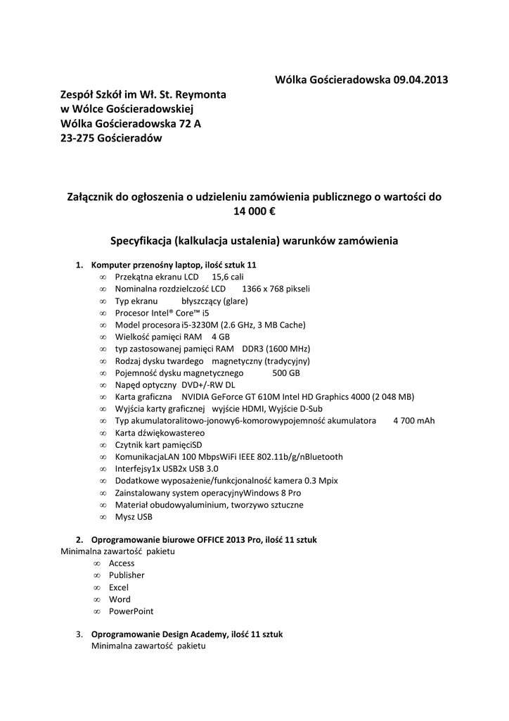 Wólka Gościeradowska 09.04.2013 Zespół Szkół im Wł. St. Reymonta w Wólce Gościeradowskiej Wólka Gościeradowska 72 A 23-275 Gościeradów Załącznik do ogłoszenia o udzieleniu zamówienia publicznego o wartości do 14 000 € Specyfikacja (kalkulacja ustalenia) warunków zamówienia 1. Komputer przenośny laptop, ilość sztuk 11 • Przekątna ekranu LCD 15,6 cali • Nominalna rozdzielczość LCD 1366 x 768 pikseli • Typ ekranu błyszczący (glare) • Procesor Intel® Core™ i5 • Model procesora i5-3230M (2.6 GHz, 3 MB Cache) • Wielkość pamięci RAM 4 GB • typ zastosowanej pamięci RAM DDR3 (1600 MHz) • Rodzaj dysku twardego magnetyczny (tradycyjny) • Pojemność dysku magnetycznego 500 GB • Napęd optyczny DVD+/-RW DL • Karta graficzna NVIDIA GeForce GT 610M Intel HD Graphics 4000 (2 048 MB) • Wyjścia karty graficznej wyjście HDMI, Wyjście D-Sub • Typ akumulatoralitowo-jonowy6-komorowypojemność akumulatora 4 700 mAh • Karta dźwiękowastereo • Czytnik kart pamięciSD • KomunikacjaLAN 100 MbpsWiFi IEEE 802.11b/g/nBluetooth • Interfejsy1x USB2x USB 3.0 • Dodatkowe wyposażenie/funkcjonalność kamera 0.3 Mpix • Zainstalowany system operacyjnyWindows 8 Pro • Materiał obudowyaluminium, tworzywo sztuczne • Mysz USB 2. Oprogramowanie biurowe OFFICE 2013 Pro, ilość 11 sztuk Minimalna zawartość pakietu • Access • Publisher • Excel • Word • PowerPoint 3. Oprogramowanie Design Academy, ilość 11 sztuk Minimalna zawartość pakietu • • • AutoCAD AutoCAD Architecture AutoCAD Civil 3D 4. Tablica interaktywna, ilość 2 sztuki • Przekątna tablicy 216 cm (85 cali) • Przekątna obszaru roboczego 202 cm (79 cali) • Przekątna powierzchni projekcyjnej 193 cm (76 cali) • Proporcje obrazu 4:3 • Technologia Pozycjonowania w podczerwieni • Sposób obsługi Dotykowy: dowolnym piórem lub palcem • Komunikacja z komputerem / zasilanie Za pośrednictwem portu USB Funkcje oprogramowania (minimalne): W pełni polska wersja językowa. Tryb DUAL – możliwość pracy dwóch osób jednocześnie na całej powierzchni tablicy. Podręczne, edytowalne menu kontekstowe. Zdrapka – narzędzie umożliwiające tworzenie ćwiczeń interaktywnych poprzez zasłanianie wybranych elementów prezentacji cyfrową farbą i jej późniejsze usuwanie przy pomocy specjalnej szpachelki. Narzędzia do geometrii – cyrkiel, linijka, ekierka, kątomierz umożliwiające pomiar długości odcinków i wartości kątów przy pomocy specjalnych znaczników. Możliwość zmiany wielkości narzędzi pomiarowych bez zmiany ich skali. Przechwytywanie obrazów umożliwiające błyskawiczne„wycięcie” elementu graficznego o dowolnym kształcie z zawartości strony www, zdjęcia, filmu itd. i wstawienie go do prezentacji. Praca na warstwach graficznych, blokowanie obiektów na poszczególnych warstwach, grupowanie obiektów, definiowanie przeźroczystości. Rozpoznawanie pojedynczych liter oraz wyrazów napisanych odręcznie i przekształcenie ich na czcionkę komputerową.Inteligentny długopis: automatyczne rozpoznawanie odręcznie narysowanych figur geometrycznych. Możliwość wstawiania figur geometrycznych oraz trójwymiarowych brył. Kamera ekranu rejestrująca wszystkie czynności wykonywane na tablicy tzn. pisanie, zaznaczanie, rysowanie, wstawianie zdjęć itd. i zapisująca je w formacie filmu avi. Możliwość umieszczenia w menu programu własnych skrótów do zewnętrznych programów.Wstawianie tabel i umieszczanie w poszczególnych komórkach tabeli wartości liczbowych. Możliwość zmiany grubości i koloru linii tabeli.Wstawianie wykresów słupkowych i kołowychInterfejs HID dzięki któremu tablica jest gotowa do pracy zaraz po podłączeniu jej do komputera bez instalowania jakichkolwiek sterowników. Możliwość tworzenia quizów i zadań interaktywnych z funkcją sprawdzania poprawności odpowiedzi.Łatwe wstawianie plików graficznych do prezentacji poprzez mechanizm przeciągnij i upuść bezpośrednio z okna eksploratora plików lub z pulpitu. Standardowe wyposażenie: 3 pióra w kolorach: czerwonym, niebieskim i czarnym oraz wymazywacz umieszczone w uchwytach magnetycznych inteligentnej ramy, rozpoznającej kolor podniesionego pióra lub funkcję wymazywania. Kabel USB A-A długości 5 mPrzedłużacz kabla USB długości 5 m. Instrukcja obsługi w języku polskim. Uchwyt montażowy ścienny. 5. Projektor multimedialny, ilość 2 sztuki • Technologia wyświetlaniaDLP • Rozdzielczość1024 x 768 (XGA) • Minimalna jasność 2800 ANSI Lumenów • Minimalny kontrast 13000:1 • ObiektywF2.6-2.78, f=10.2-12.24 mm • Minimalna przekątna obrazu 38 '' • • • • • • • • • • • • • • • • • • Maksymalna przekątna obrazu 300 '' Minimalna odległość ekranu0.9 m Proporcje obrazu4:3 Trwałość lampy 3500 h Trwałość lampy (ECO) 5000 h Kompatybilność ze standardami wideo480i, 480p, 576i, 576p, 720p, 1080i, 1080pNTSC, PAL, SECAM Złącza wejścia / wyjściaComputer in (D-sub 15pin) x 1(Share with component) Monitor out (D-sub 15pin) x 1 HDMI x 1 Composite Video in (RCA) x 1 S-Video in (Mini DIN 4pin) x 1 Audio in (Mini Jack) x 1 Audio L/R in (RCA) x 1 Audio out (Mini Jack) x 1 Speaker 10W x 1 USB (Type A) x 1 (USB Reader & Wireless Display) USB (Type mini B) x 1 (Download&page/down) RS232 (DB-9pin) x 1 IR Receiver x2 (Front+Top) Akcesoria w zestawiePilot/Baterie Przewód Zasilający Instrukcja Użytkownika Kabel VGA(D-sub 15pin) Uchwyt sufitowy do montażu projektora Kabel zasilający 5 m Kabel VGA 5 m Kabel HDMI 5 m 6. Komputer przenośny laptop, ilość 2 sztuki • Przekątna ekranu LCD 15,6 cali • Nominalna rozdzielczość LCD 1366 x 768 pikseli • Typ ekranu błyszczący (glare) (podświetlenie LED) • Procesor Intel® Core™ i3 • Model procesora i3-3120M (2.5 GHz, 3 MB Cache) • Wielkość pamięci RAM 4 GB • Rodzaj dysku twardego magnetyczny (tradycyjny) • Pojemność dysk