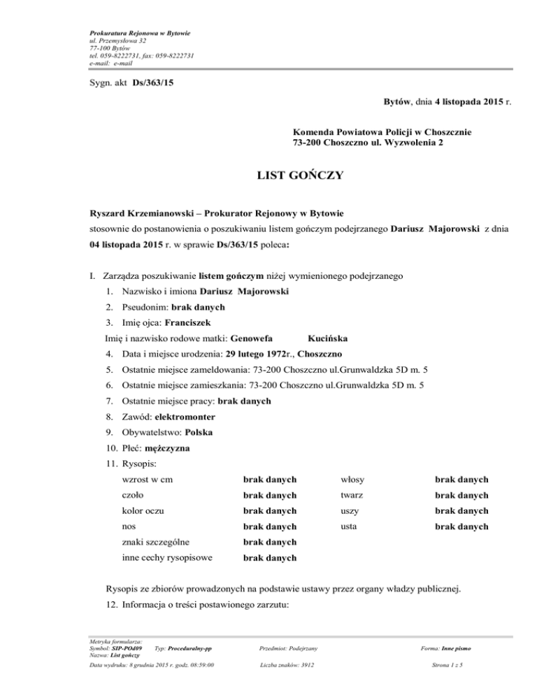 Prokuratura Rejonowa w Bytowie ul. Przemysłowa 32 77-100 Bytów tel. 059-8222731, fax: 059-8222731 e-mail: e-mail Sygn. akt Ds/363/15 Bytów, dnia 4 listopada 2015 r. Komenda Powiatowa Policji w Choszcznie 73-200 Choszczno ul. Wyzwolenia 2 LIST GOŃCZY Ryszard Krzemianowski – Prokurator Rejonowy w Bytowie stosownie do postanowienia o poszukiwaniu listem gończym podejrzanego Dariusz Majorowski z dnia 04 listopada 2015 r. w sprawie Ds/363/15 poleca: I. Zarządza poszukiwanie listem gończym niżej wymienionego podejrzanego 1. Nazwisko i imiona Dariusz Majorowski 2. Pseudonim: brak danych 3. Imię ojca: Franciszek Imię i nazwisko rodowe matki: Genowefa Kucińska 4. Data i miejsce urodzenia: 29 lutego 1972r., Choszczno 5. Ostatnie miejsce zameldowania: 73-200 Choszczno ul.Grunwaldzka 5D m. 5 6. Ostatnie miejsce zamieszkania: 73-200 Choszczno ul.Grunwaldzka 5D m. 5 7. Ostatnie miejsce pracy: brak danych 8. Zawód: elektromonter 9. Obywatelstwo: Polska 10. Płeć: mężczyzna 11. Rysopis: wzrost w cm brak danych włosy brak danych czoło brak danych twarz brak danych kolor oczu brak danych uszy brak danych nos brak danych usta brak danych znaki szczególne brak danych inne cechy rysopisowe brak danych Rysopis ze zbiorów prowadzonych na podstawie ustawy przez organy władzy publicznej. 12. Informacja o treści postawionego zarzutu: Metryka formularza: Symbol: SIP-POd09 Nazwa: List gończy Typ: Proceduralny-pp Data wydruku: 8 grudnia 2015 r. godz. 08:59:00 Przedmiot: Podejrzany Forma: Inne pismo Liczba znaków: 3912 Strona 1 z 5 Sygnatura sprawy: Ds/363/15 Prokuratura Rejonowa w Bytowie Dnia: 4 listopada 2015 - w okresie od 14 czerwca 2010 roku do 1 września 2015 roku w Brzeźnie Szlacheckim gm. Lipnica uporczywie uchylał się od wykonania ciążącego na nim obowiązku opieki przez niełożenie na utrzymanie syna Łukasza Olszewskiego alimentów orzeczonych wyrokiem Sądu Rejonowego w Choszcznie z dnia 30.11.1998 r. w sprawie III RC 398/98 i podwyższonych wyrokiem Sądu Rejonowego w Choszcznie z dnia 30.04.2013 r. w sprawie VIII RC 32/13, przez co naraził go na niemożność zaspokojenia podstawowych potrzeb życiowych, tj. o przestępstwo z art. 209 § 1 kk 13. Data i sygnatura postanowienia o tymczasowym aresztowaniu: Sąd Rejonowego w Bytowie postanowieniem z dnia 29 października 2015 r. sygn. akt II Kp 63/15. II. Rozpowszechnianie listu gończego nastąpi przez rozesłanie do jednostek Policji. III. Fotografia poszukiwanego - brak Wzywa się każdego, kto zna miejsce pobytu poszukiwanego do zawiadomienia o tym najbliższej jednostki Policji lub prokuratora (art. 280 § 1 pkt 4 kpk). Ostrzega się, że za ukrywanie poszukiwanego lub dopomaganie jej w ucieczce grozi kara pozbawienia wolności do lat 5 (art. 239 § 1 kk). Udziela się zapewnienia o utrzymaniu tajemnicy co do osoby informującej (art. 280 § 2 kpk). m.p. ...................................................................................... (podpis prokuratora) Załączniki: - odpis postanowienia o tymczasowym aresztowaniu. - nakaz przyjęcia do najbliższego aresztu śledczego. . .................................................................................. (podpis prokuratora) Metryka formularza: Symbol: SIP-POd09 Nazwa: List gończy Typ: Proceduralny-pp Data wydruku: 8 grudnia 2015 r. godz. 08:59:00 Przedmiot: Podejrzany Liczba znaków: 3912 Forma: Inne pismo Strona 2 z 5