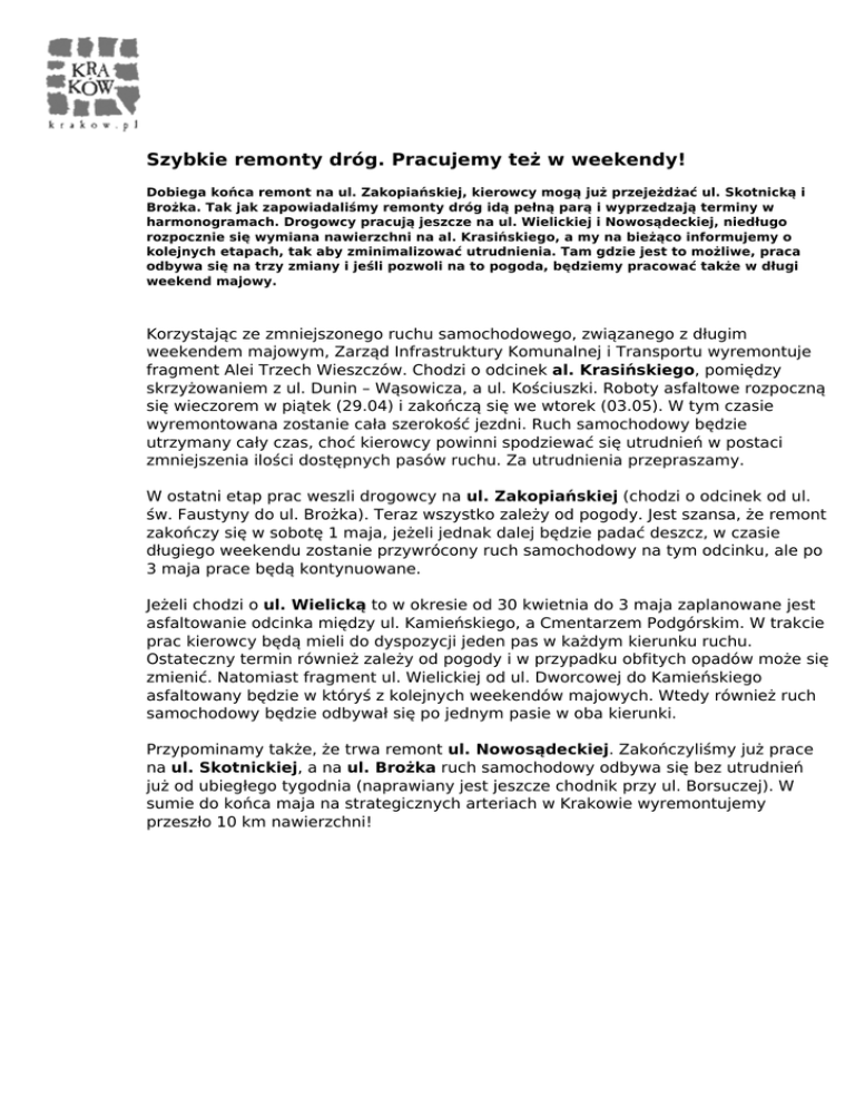 Szybkie remonty dróg. Pracujemy też w weekendy! Dobiega końca remont na ul. Zakopiańskiej, kierowcy mogą już przejeżdżać ul. Skotnicką i Brożka. Tak jak zapowiadaliśmy remonty dróg idą pełną parą i wyprzedzają terminy w harmonogramach. Drogowcy pracują jeszcze na ul. Wielickiej i Nowosądeckiej, niedługo rozpocznie się wymiana nawierzchni na al. Krasińskiego, a my na bieżąco informujemy o kolejnych etapach, tak aby zminimalizować utrudnienia. Tam gdzie jest to możliwe, praca odbywa się na trzy zmiany i jeśli pozwoli na to pogoda, będziemy pracować także w długi weekend majowy. Korzystając ze zmniejszonego ruchu samochodowego, związanego z długim weekendem majowym, Zarząd Infrastruktury Komunalnej i Transportu wyremontuje fragment Alei Trzech Wieszczów. Chodzi o odcinek al. Krasińskiego, pomiędzy skrzyżowaniem z ul. Dunin – Wąsowicza, a ul. Kościuszki. Roboty asfaltowe rozpoczną się wieczorem w piątek (29.04) i zakończą się we wtorek (03.05). W tym czasie wyremontowana zostanie cała szerokość jezdni. Ruch samochodowy będzie utrzymany cały czas, choć kierowcy powinni spodziewać się utrudnień w postaci zmniejszenia ilości dostępnych pasów ruchu. Za utrudnienia przepraszamy. W ostatni etap prac weszli drogowcy na ul. Zakopiańskiej (chodzi o odcinek od ul. św. Faustyny do ul. Brożka). Teraz wszystko zależy od pogody. Jest szansa, że remont zakończy się w sobotę 1 maja, jeżeli jednak dalej będzie padać deszcz, w czasie długiego weekendu zostanie przywrócony ruch samochodowy na tym odcinku, ale po 3 maja prace będą kontynuowane. Jeżeli chodzi o ul. Wielicką to w okresie od 30 kwietnia do 3 maja zaplanowane jest asfaltowanie odcinka między ul. Kamieńskiego, a Cmentarzem Podgórskim. W trakcie prac kierowcy będą mieli do dyspozycji jeden pas w każdym kierunku ruchu. Ostateczny termin również zależy od pogody i w przypadku obfitych opadów może się zmienić. Natomiast fragment ul. Wielickiej od ul. Dworcowej do Kamieńskiego asfaltowany będzie w któryś z kolejnych weekendów majowych. Wtedy również ruch samochodowy będzie odbywał się po jednym pasie w oba kierunki. Przypominamy także, że trwa remont ul. Nowosądeckiej. Zakończyliśmy już prace na ul. Skotnickiej, a na ul. Brożka ruch samochodowy odbywa się bez utrudnień już od ubiegłego tygodnia (naprawiany jest jeszcze chodnik przy ul. Borsuczej). W sumie do końca maja na strategicznych arteriach w Krakowie wyremontujemy przeszło 10 km nawierzchni! Powered by TCPDF (www.tcpdf.org)