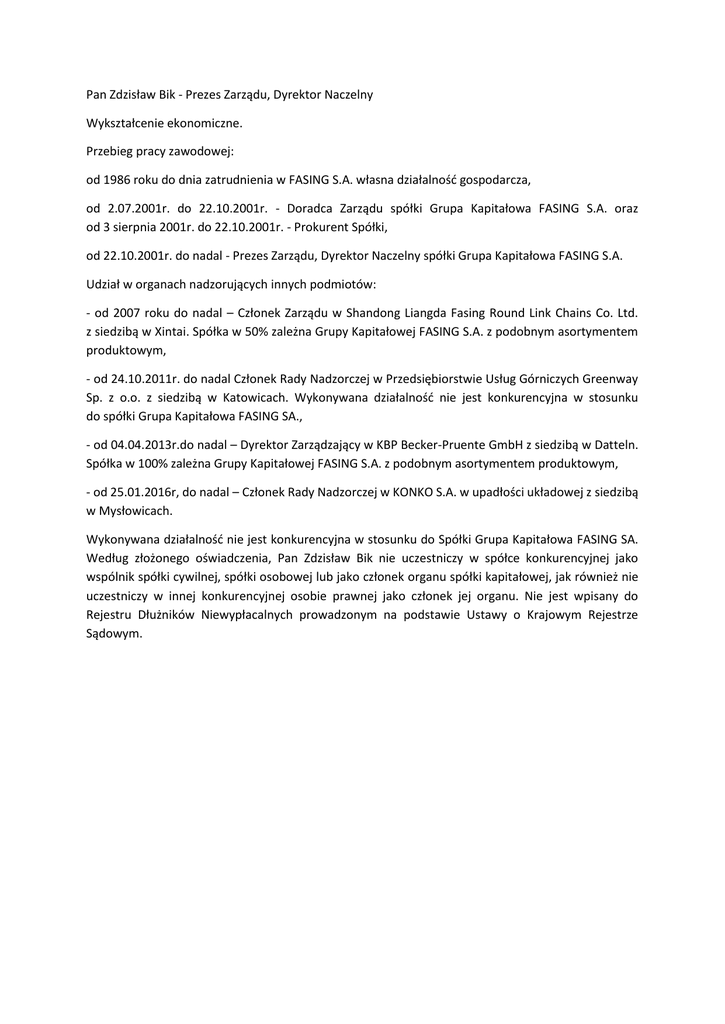 Pan Zdzisław Bik - Prezes Zarządu, Dyrektor Naczelny Wykształcenie ekonomiczne. Przebieg pracy zawodowej: od 1986 roku do dnia zatrudnienia w FASING S.A. własna działalność gospodarcza, od 2.07.2001r. do 22.10.2001r. - Doradca Zarządu spółki Grupa Kapitałowa FASING S.A. oraz od 3 sierpnia 2001r. do 22.10.2001r. - Prokurent Spółki, od 22.10.2001r. do nadal - Prezes Zarządu, Dyrektor Naczelny spółki Grupa Kapitałowa FASING S.A. Udział w organach nadzorujących innych podmiotów: - od 2007 roku do nadal – Członek Zarządu w Shandong Liangda Fasing Round Link Chains Co. Ltd. z siedzibą w Xintai. Spółka w 50% zależna Grupy Kapitałowej FASING S.A. z podobnym asortymentem produktowym, - od 24.10.2011r. do nadal Członek Rady Nadzorczej w Przedsiębiorstwie Usług Górniczych Greenway Sp. z o.o. z siedzibą w Katowicach. Wykonywana działalność nie jest konkurencyjna w stosunku do spółki Grupa Kapitałowa FASING SA., - od 04.04.2013r.do nadal – Dyrektor Zarządzający w KBP Becker-Pruente GmbH z siedzibą w Datteln. Spółka w 100% zależna Grupy Kapitałowej FASING S.A. z podobnym asortymentem produktowym, - od 25.01.2016r, do nadal – Członek Rady Nadzorczej w KONKO S.A. w upadłości układowej z siedzibą w Mysłowicach. Wykonywana działalność nie jest konkurencyjna w stosunku do Spółki Grupa Kapitałowa FASING SA. Według złożonego oświadczenia, Pan Zdzisław Bik nie uczestniczy w spółce konkurencyjnej jako wspólnik spółki cywilnej, spółki osobowej lub jako członek organu spółki kapitałowej, jak również nie uczestniczy w innej konkurencyjnej osobie prawnej jako członek jej organu. Nie jest wpisany do Rejestru Dłużników Niewypłacalnych prowadzonym na podstawie Ustawy o Krajowym Rejestrze Sądowym.