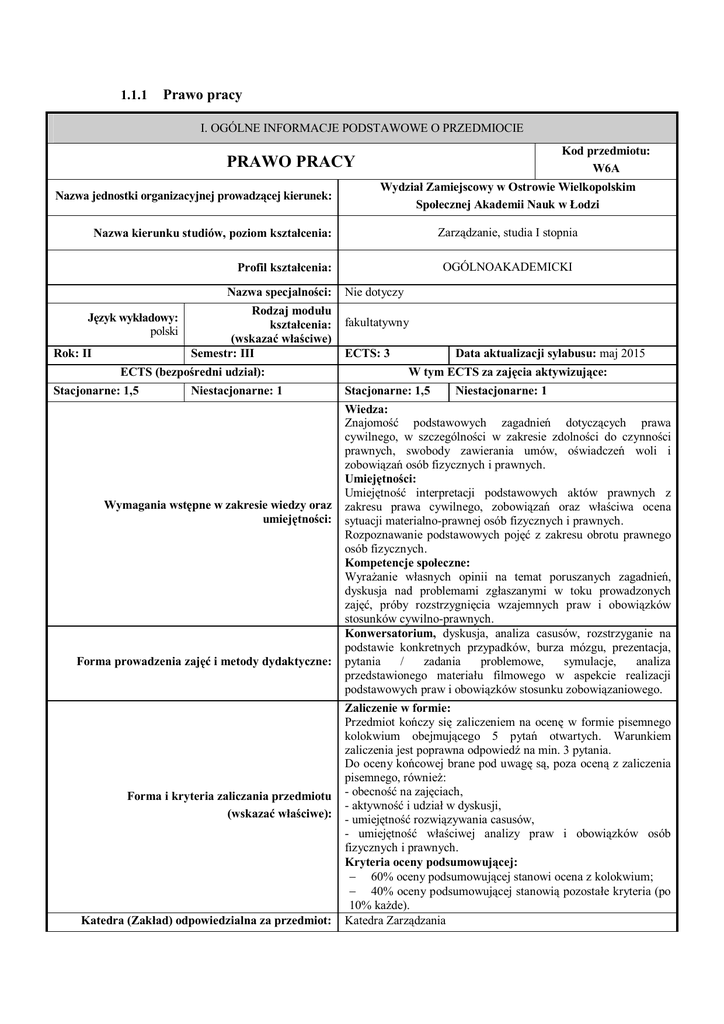 1.1.1 Prawo pracy I. OGÓLNE INFORMACJE PODSTAWOWE O PRZEDMIOCIE Kod przedmiotu: W6A PRAWO PRACY Nazwa jednostki organizacyjnej prowadzącej kierunek: Wydział Zamiejscowy w Ostrowie Wielkopolskim Społecznej Akademii Nauk w Łodzi Zarządzanie, studia I stopnia Nazwa kierunku studiów, poziom kształcenia: OGÓLNOAKADEMICKI Profil kształcenia: Język wykładowy: polski Rok: II Nazwa specjalności: Rodzaj modułu kształcenia: (wskazać właściwe) Semestr: III ECTS (bezpośredni udział): Stacjonarne: 1,5 Niestacjonarne: 1 Wymagania wstępne w zakresie wiedzy oraz umiejętności: Forma prowadzenia zajęć i metody dydaktyczne: Forma i kryteria zaliczania przedmiotu (wskazać właściwe): Katedra (Zakład) odpowiedzialna za przedmiot: Nie dotyczy fakultatywny ECTS: 3 Data aktualizacji sylabusu: maj 2015 W tym ECTS za zajęcia aktywizujące: Stacjonarne: 1,5 Niestacjonarne: 1 Wiedza: Znajomość podstawowych zagadnień dotyczących prawa cywilnego, w szczególności w zakresie zdolności do czynności prawnych, swobody zawierania umów, oświadczeń woli i zobowiązań osób fizycznych i prawnych. Umiejętności: Umiejętność interpretacji podstawowych aktów prawnych z zakresu prawa cywilnego, zobowiązań oraz właściwa ocena sytuacji materialno-prawnej osób fizycznych i prawnych. Rozpoznawanie podstawowych pojęć z zakresu obrotu prawnego osób fizycznych. Kompetencje społeczne: Wyrażanie własnych opinii na temat poruszanych zagadnień, dyskusja nad problemami zgłaszanymi w toku prowadzonych zajęć, próby rozstrzygnięcia wzajemnych praw i obowiązków stosunków cywilno-prawnych. Konwersatorium, dyskusja, analiza casusów, rozstrzyganie na podstawie konkretnych przypadków, burza mózgu, prezentacja, pytania / zadania problemowe, symulacje, analiza przedstawionego materiału filmowego w aspekcie realizacji podstawowych praw i obowiązków stosunku zobowiązaniowego. Zaliczenie w formie: Przedmiot kończy się zaliczeniem na ocenę w formie pisemnego kolokwium obejmującego 5 pytań otwartych. Warunkiem zaliczenia jest poprawna odpowiedź na min. 3 pytania. Do oceny końcowej brane pod uwagę są, poza oceną z zaliczenia pisemnego, również: - obecność na zajęciach, - aktywność i udział w dyskusji, - umiejętność rozwiązywania casusów, - umiejętność właściwej analizy praw i obowiązków osób fizycznych i prawnych. Kryteria oceny podsumowującej: 60% oceny podsumowującej stanowi ocena z kolokwium; 40% oceny podsumowującej stanowią pozostałe kryteria (po 10% każde). Katedra Zarządzania Osoba koordynująca przedmiot: Prof. zw. dr hab. Tomasz Kruszewski / Mgr Tomasz Kozłowski II. WYMIAR GODZINOWY ZAJĘĆ ORAZ INDYWIDUALNEJ PRACY WŁASNEJ STUDENTA Ogólna liczba godzin zajęć dydaktycznych na studiach stacjonarnych i niestacjonarnych z podziałem na formy: St udi a st acj onar ne Wykład: Ćwiczenia: Konwersatorium: St udi a nie st ac j ona rne Wykład: Ćwiczenia: Konwersatorium: 30 Laboratorium: Ćwiczenia projektowe: Laboratorium: Ćwiczenia projektowe: Warsztaty: Seminarium: Warsztaty: Seminarium: Zajęcia terenowe: Praktyki: Zajęcia terenowe: Praktyki: Konsultacje przedmiotowe: Konsultacje przedmiotowe: 18 Egzaminy i zaliczenia w sesji Inna forma (jaka): 3 Egzaminy i zaliczenia w sesji Inna forma (jaka): 2 RAZEM: Praca własna studenta (PWS): 33 42 RAZEM: Praca własna studenta (PWS): 20 55 RAZEM z PWS: 75 RAZEM z PWS: Sumaryczne obciążenie pracą studenta wg form aktywności: 75 Szacowana liczba godzin potrzebnych na zrealizowanie aktywności: Forma aktywności: studia stacjonarne studia niestacjonarne Godziny realizowane w bezpośrednim kontakcie z nauczycielem akademickim: Praca własna studenta: 33 42 20 55 Przygotowanie się do zajęć Przygotowanie esejów/prezentacji/referatów 12 15 15 20 15 20 75 75 Wykonanie projektów Zapoznanie z literaturą podstawową i podstawowymi ustawami z Prawa pracy Pisemna praca zaliczeniowa Przygotowanie do egzaminu Przygotowanie do zaliczenia SUMA: III. TREŚCI KSZTAŁCENIA Treści kształcenia (uszczegółowione, zaprezentowane z podziałem na poszczególne formy zajęć, opis szczegółowy poszczególnych bloków kształcenia): Konwersatorium: 1. 2. 3. 4. 5. Źródła prawa – Konstytucja RP, Kodeks Cywilny, Kodeks postępowania administracyjnego, Kodeks Pracy, Źródła prawa pracy - – Konstytucja RP, Kodeks Cywilny, Akty wykonawcze – Rozporządzenia, Kodeks Pracy – przepisy ogólne, stosunek pracy, wynagrodzenia za pracę, odpowiedzialność w stosunkach pracy, czas pracy, uprawnienia rodzicielskie, bezpieczeństwo i higiena pracy, Zbiorowe prawo pracy. Układy zbiorowe pracy. Związki zawodowe. Rozwiązywanie sporów zawodowych. Stosunki zobowiązaniowe wynikające z Kodeksu Cywilnego – umowa zlecenie, umowa o dzieło. 6. 7. 8. 9. Ubezpieczenia społeczne, podstawowe prawa i obowiązki podmiotów stosunku zobowiązaniowego. Odpowiedzialność za wykroczenia przeciwko prawom pracownika. Organy nadzoru nad warunkami pracy w Polsce, System ochrony prawa pracy w Polsce. IV. OBSZAROWE I KIERUNKOWE EFEKTY KSZTAŁCENIA Kod wg KEK: Wiedza: Kod KRK: K_W02 ma wiedzę elementarną na temat podstawowych rodzajów systemów społecznych i gospodarczych S1A_W01, S1A_W02 K_W12 zna podstawowe ujęcia procesu i funkcji kierowania ludźmi w organizacji S1A_W05 K_W19 zna podstawowe rodzaje struktur organizacyjnych, niektóre czynniki wpływające na ich zmiany oraz rodzaje dokumentów formalizujących organizację wraz z ich wybranymi zastosowaniami S1A_W07, S1A_W08 Kod wg KEK: Umiejętności: Kod KRK: K_U01 posiada elementarne umiejętności obserwacji, opisu, analizy i interpretacji podstawowych zjawisk i procesów zachodzących w organizacji z wykorzystaniem podstawowych pojęć i ujęć teoretycznych S1A_U01, S1A_U02 K_U02 potrafi zastosować wybrane elementy wiedzy teoretycznej w określonym obszarze funkcjonalnym organizacji i pełnić funkcje specjalisty w tym zakresie S1A_U06 K_U03 ma umiejętność sto