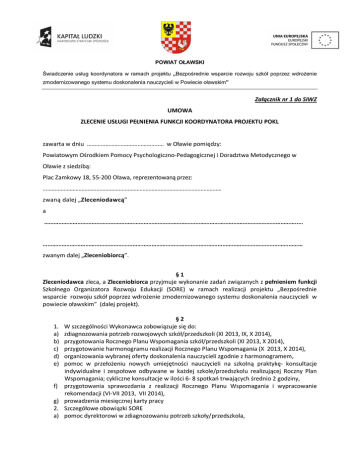 POWIAT O AWSKI wiadczenie us ug koordynatora w ramach projektu „Bezpo rednie wsparcie rozwoju szkó poprzez wdro enie zmodernizowanego systemu doskonalenia nauczycieli w Powiecie o awskim” Za cznik nr 1 do SIWZ UMOWA ZLECENIE US UGI PE NIENIA FUNKCJI KOORDYNATORA PROJEKTU POKL zawarta w dniu ………………………………………..… w O awie pomi dzy: Powiatowym O rodkiem Pomocy Psychologiczno-Pedagogicznej i Doradztwa Metodycznego w awie z siedzib : Plac Zamkowy 18, 55-200 O awa, reprezentowan przez: ………………………………………………………………………………………………………… zwan dalej „Zleceniodawc ” a ……………………………………………………………………………………………………………………………………………..… ………………………………………………………………………………………………………………………………………………… zwanym dalej „Zleceniobiorc ”. §1 Zleceniodawca zleca, a Zleceniobiorca przyjmuje wykonanie zada zwi zanych z pe nieniem funkcji Szkolnego Organizatora Rozwoju Edukacji (SORE) w ramach realizacji projektu „Bezpo rednie wsparcie rozwoju szkó poprzez wdro enie zmodernizowanego systemu doskonalenia nauczycieli w powiecie o awskim” (dalej projekt). 1. a) b) c) d) e) f) g) 2. a) §2 W szczególno ci Wykonawca zobowi zuje si do: zdiagnozowania potrzeb rozwojowych szkó /przedszkoli (XI 2013, IX, X 2014), przygotowania Rocznego Planu Wspomagania szkó /przedszkoli (XI 2013, X 2014), przygotowanie harmonogramu realizacji Rocznego Planu Wspomagania (X 2013, X 2014), organizowania wybranej oferty doskonalenia nauczycieli zgodnie z harmonogramem, pomoc w prze eniu nowych umiej tno ci nauczycieli na szkoln praktyk - konsultacje indywidualne i zespo owe odbywane w ka dej szkole/przedszkolu realizuj cej Roczny Plan Wspomagania; cykliczne konsultacje w ilo ci 6- 8 spotka trwaj cych rednio 2 godziny, przygotowania sprawozdania z realizacji Rocznego Planu Wspomagania i wypracowanie rekomendacji (VI-VII 2013, VII 2014), prowadzenia miesi cznej karty pracy Szczegó owe obowi zki SORE pomoc dyrektorowi w zdiagnozowaniu potrzeb szko y/przedszkola, POWIAT O AWSKI wiadczenie us ug koordynatora w ramach projektu „Bezpo rednie wsparcie rozwoju szkó poprzez wdro enie zmodernizowanego systemu doskonalenia nauczycieli w Powiecie o awskim” b) pomoc w formu owaniu celów wynikaj cych ze zdiagnozowanych potrzeb i okre leniu obszaru do rozwoju wspó praca z rad pedagogiczn , c) przygotowanie rocznego planu wspomagania, ci le odpowiadaj cego na potrzeby szko y i zbudowanego na podstawie jednej z ofert doskonalenia, we wspó pracy ze szko om/przedszkolem i jego harmonogramu realizacji, d) wsparcie przy zapewnianiu obiegu informacji (sta y kontakt z osobami zaanga owanymi w realizacj RPW, dbanie o przep yw informacji dotycz cych dzia podejmowanych w ramach jego wspó pracy ze szko /przedszkolem), e) wnioskowanie o pozyskanie zewn trznych ekspertów, specjalistów do zaj warsztatowych, konsultacji, etc. f) organizowanie zaplanowanych form wspomagania we wspó pracy ze szko /przedszkolem, g) organizacja systemu wsparcia dla pracowników szko y we wdra aniu nowo nabytych umiej tno ci i wypracowanych procedur (np. organizacja i prowadzenie konsultacji) h) pomoc w monitorowaniu przebiegu realizacji rocznego planu wspomagania, reagowanie na pojawiaj ce si trudno ci, i) dokumentowanie podejmowanych dzia , j) przygotowanie i przeprowadzenie ankiet z przebiegu wspomagania, k) przygotowanie sprawozdania z przebiegu realizacji rocznego planu wspomagania, l) przedstawienie sprawozdania z przebiegu realizacji rocznego planu wspomagania dyrektorowi szko y/przedszkola oraz radzie pedagogicznej, m) udzia w podsumowaniu podj tych dzia wspó praca z rad pedagogiczn nad rekomendacjami do pracy szko y w kolejnym roku szkolnym. 3. Realizacja zada , o których mowa w ust. 1 odbywa si b dzie w cis ej wspó pracy z Koordynatorem projektu oraz Zarz dzaj cym projektem. 4. Zlecenie b dzie wykonywane przez Zleceniobiorc w okresie od 10.10. 2013 r. do 31 lipca 2015 r. 5. Integraln cz ci niniejszej umowy jest Specyfikacja Istotnych Warunków Zamówienia. 1. 2. 3. 4. §3 Strony niniejszej Umowy ustalaj zrycza towane miesi czne wynagrodzenie Zleceniobiorcy z tytu u realizacji Umowy na kwot ………z brutto (s ownie ……i 00/100) tj. 1/12 wynagrodzenia okre lonego w ofercie Zleceniobiorcy. Wynagrodzenie okre lone w niniejszej umowie jest wspó finansowane ze rodków Unii Europejskiej w ramach Europejskiego Funduszu Spo ecznego. W przypadku, gdy stron umowy jest osoba fizyczna nie prowadz ca dzia alno ci gospodarczej kwota wskazana w ust. 1 pomniejszona zostanie o zaliczk na podatek dochodowy oraz nale ne sk adki na ubezpieczenie zdrowotne i ubezpieczenia spo eczne, które odprowadza Zleceniodawca na podstawie o wiadczenia zleceniobiorcy, zgodnie z przepisami obowi zuj cymi w dniu wyp aty wynagrodzenia. Zap ata wynagrodzenia nast pi na podstawie faktury lub rachunku wystawionego na koniec ka dego miesi ca kalendarzowego przez Zleceniobiorc , przelewem na wskazany przez niego rachunek bankowy, w terminie 14 dni od dnia otrzymania przez Zleceniodawc prawid owo wystawionego rachunku wraz z wype nion kartu czasu pracy, dokumentuj wykonanie zada zgodnie z harmonogramem w § 2, potwierdzon przez Koordynatora projektu. POWIAT O AWSKI wiadczenie us ug koordynatora w ramach projektu „Bezpo rednie wsparcie rozwoju szkó poprzez wdro enie zmodernizowanego systemu doskonalenia nauczycieli w Powiecie o awskim” 5. Karta czasu pracy powinna wskazywa : imi i nazwisko osoby, o której mowa w §2 ust. 6, placówk o wiatow , czas pracy, zakres wykonywanych zada okre lonych zgodnie z §2 ust. 1, ilo godzin po wi conych na te czynno ci, podpis Koordynatora projektu. 6. Zleceniobiorca wskazuje niniejszym rachunek bankowy, na który Zleceniodawca winien dokonywa zap aty 