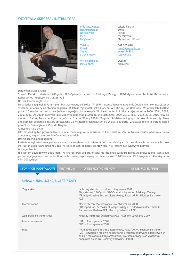 WIZYTóWKA SKIPPERA / INSTRUKTORA Imię i nazwisko: Rok urodzenia: Narodowość: Płeć: Miejscowość: Witold Piecha 1948 Polska mężczyzna Mysłowice / śląskie Telefon: E-mail: Skype: Strona WWW: 501 205 098 [email protected] witek194811 fotowolt.eu Wykształcenie: Języki obce: wyższe niemiecki Uprawnienia żeglarskie: Sternik Morski z stażem 1400godz, SRC-Operator Łączności Bliskiego Zasięgu, ITR-Indywidualne Techniki Ratunkowe, Radar-ARPA, Młodszy Instruktor PZŻ Doświadczenie żeglarskie: Moja kariera żeglarska: Patent sternika jachtowego od 1972r. W 1974r. uczestnictwo w szkoleniu żeglarskim jako instruktor w szkoleniu młodzieży na stopień żeglarza. W 1974r rejs morski jako II oficer. W 1982 rejs po Balatonie. W latach 1973-2015r ponad 20 rejsów mazurskich na jachtach wynajętych i własnych. W charakterze I i III oficera rejsy morskie 2000, 2004, 2005, 2006, 2007. Od 2008r. już tylko jako Skiper/Kapitan staż 1400godz. w latach 2008, 2009, 2010, 2011, 2012, 2015, 2016 rejsy po morzach: Bałtyk, Północne, Egejskie, Jońskie, Czarne. W luty 2010r. "Pogoria" Śródziemne-Liguryjskie jako oficer wachty. Moje umiejętności żeglarskie zostały sprawdzone 2x w sztormie osiągającym 90 w skali Beauforta. Znaczące rejsy: Kołobrzeg Oslo i powrót do Świnoujścia, z Oslo do Bergen. Atmosfera na jachcie: Jako skiper/kapitan prowadziłem w sumie (pomijając rejsy rodzinne) kilkadziesiąt rejsów. W trakcie rejsów panowała dobra atmosfera, nigdy było problemów międzyludzkich. Doświadczenie pedagogiczne: Posiadam wykształcenie pedagogiczne, pracowałem przez okres 9 lat z młodzieżą szkół zawodowych technicznych. Jako instruktor żeglarstwa brałem udział w szkoleniach żeglarzy jachtowych. Nie jestem już typowym Belfrem ;) Wynagrodzenie: Nie jestem zawodowym żeglarzem i w charakterze skipera/oficera nie oczekuję wynagrodzenia za prowadzenie jachtu lub pomoc w jego przeprowadzeniu. W rejsach komercyjnych wynagrodzenie wynosi 150zł/dziennie. Za funkcję instruktorską netto min. 100zł/dzień INFORMACJE PODSTAWOWE MULTIMEDIA OPINIE UŻYTKOWNIKÓW OPINIE PRO-SKIPPERS UPRAWNIENIA, LICENCJE, CERTYFIKATY Żeglarskie: Jachtowy sternik morski, rok otrzymania 2008 SM z stażem 1400godz, SRC-Operator Łączności Bliskiego Zasięgu, ITR-Indywidualne Techniki Ratunkowe, Radar-ARPA, Młodszy Instruktor PZŻ Motorowodne: Morski sternik motorowodny, rok otrzymania 2008 SRC-Operator Łączności Bliskiego Zasięgu, ITR-Indywidualne Techniki Ratunkowe, Radar-ARPA, Młodszy Instruktor PZŻ Żeglarskie instruktorskie: Młodszy instruktor żeglarstwa PZŻ (MIŻ), rok uzyskania 2007 Inne uprawnienia: UKF, rok otrzymania 2009 SRC, rok otrzymania 2009 Inne: ITR-Indywidualne Techniki Ratunkowe, Radar-ARPA, Młodszy Instruktor PZŻ, Pozwolenie radiowe na używanie urządzeń nadawczo-odbiorczych w służbie radiokomunikacji amatorskiej-krótkofalarskiej. Moc wyjściowa nadajnika do 150W. Znak wywoławczy SP9ERL www.pro-skippers.com, strona: 1 DOŚWIADCZNIE ŚRÓDLĄDOWE Doświadczenie jako skipper: dowodziłem/am jachtem w ciągu ostatnich 5 lat Ilość rejsów jako skipper: > 15 Praktyczna znajomość akwenów: np. Wielkie Jeziora Mazurskie, Drawskie, Balaton, Pławniowice, Dzierżno, Doświadczenie w prowadzeniu rejsów z załogami: rodzina z dziećmi, młodzież, dorośli DOŚWIADCZENIE MORSKIE Lata praktyki jako skipper: 5 - 10 Całkowity staż morski (ilość godzin): 500 - 5000 Ilość odbytych rejsów: 10 - 50 Doświadczenie w prowadzeniu jachtów: Ilość kadłubów: jednokadłubowy Długość [m]: 12-16 Rodzaj napędu: żaglowy, motorowy, żaglowo-motorowy Praktyczna znajomość akwenów: Morze Bałtyckie, Morze Północne, Chorwacja, Grecja, Włochy, Morze Norweskie Doświadczenie w prowadzeniu rejsów z załogami: rodzina z dziećmi, młodzież, dorośli DOŚWIADCZNIE SZKOLENIOWE Łączna ilość odbytych szkoleń w charakterze kadry instruktorskiej: <5 W tym w ostatnich 5 latach: <5 Pełnione funkcje szkoleniowe: instruktor DOŚWIADCZENIE REGATOWE Rodzaj doświadczenia regatowego: sportowe, turystyczne Rodzaj regat ze względu na akwen: śródlądowe Ilość udziałów w regatach: >10 w tym w ostatnich 5 latach: >10 Pełnione funkcje podczas regat: skipper Pozostałe informacje: Udział w regatach turystycznych na Mazurach od 1975 – kilkanaście dyplomów za zajęcie miejsc od 1 do 3. Jacht turystyczny - 6 miejsce w Polsce. Kilkanaście dyplomów z regat na lokalnym akwenie Pławniowice koło Gliwic. Posiadam Błekitna wstęga Pławniowic. Posiadam żaglówkę regatową Finn www.pro-skippers.com, strona: 2