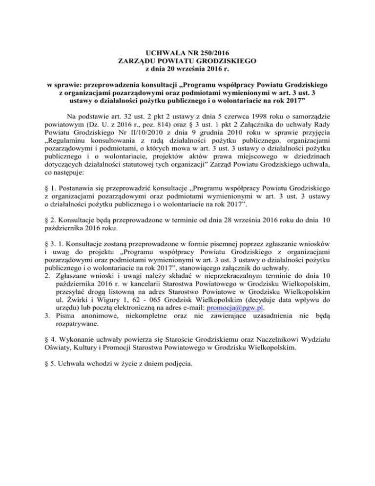 UCHWAŁA NR 250/2016 ZARZĄDU POWIATU GRODZISKIEGO z