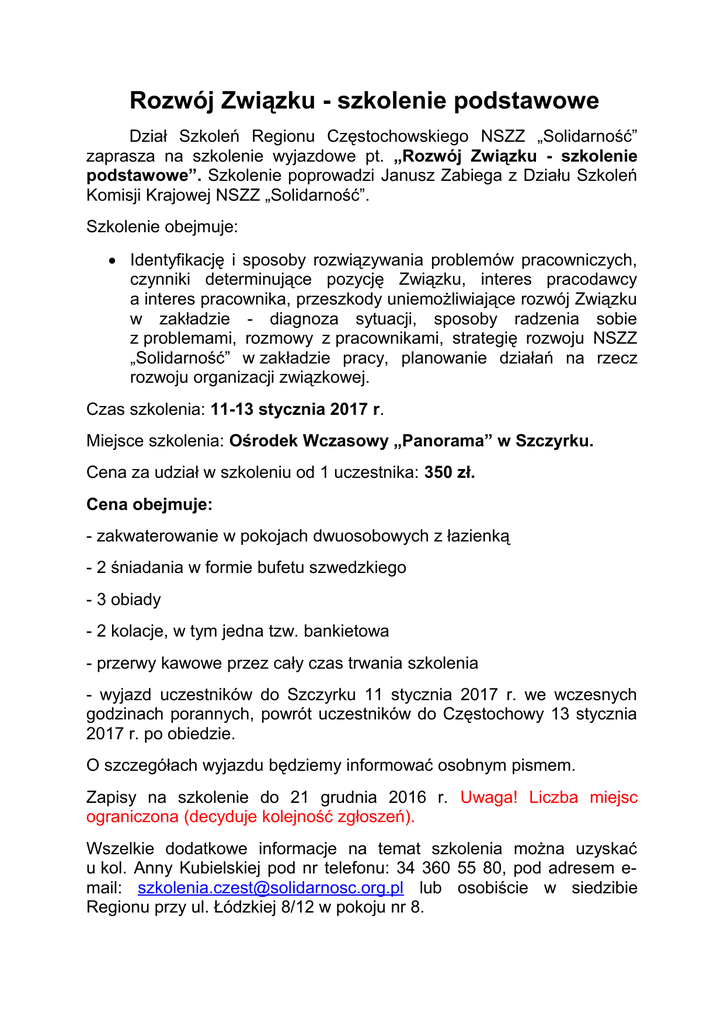 Rozwój Związku - szkolenie podstawowe Dział Szkoleń Regionu Częstochowskiego NSZZ „Solidarność” zaprasza na szkolenie wyjazdowe pt. „Rozwój Związku - szkolenie podstawowe”. Szkolenie poprowadzi Janusz Zabiega z Działu Szkoleń Komisji Krajowej NSZZ „Solidarność”. Szkolenie obejmuje: Identyfikację i sposoby rozwiązywania problemów pracowniczych, czynniki determinujące pozycję Związku, interes pracodawcy a interes pracownika, przeszkody uniemożliwiające rozwój Związku w zakładzie - diagnoza sytuacji, sposoby radzenia sobie z problemami, rozmowy z pracownikami, strategię rozwoju NSZZ „Solidarność” w zakładzie pracy, planowanie działań na rzecz rozwoju organizacji związkowej. Czas szkolenia: 11-13 stycznia 2017 r. Miejsce szkolenia: Ośrodek Wczasowy „Panorama” w Szczyrku. Cena za udział w szkoleniu od 1 uczestnika: 350 zł. Cena obejmuje: - zakwaterowanie w pokojach dwuosobowych z łazienką - 2 śniadania w formie bufetu szwedzkiego - 3 obiady - 2 kolacje, w tym jedna tzw. bankietowa - przerwy kawowe przez cały czas trwania szkolenia - wyjazd uczestników do Szczyrku 11 stycznia 2017 r. we wczesnych godzinach porannych, powrót uczestników do Częstochowy 13 stycznia 2017 r. po obiedzie. O szczegółach wyjazdu będziemy informować osobnym pismem. Zapisy na szkolenie do 21 grudnia 2016 r. Uwaga! Liczba miejsc ograniczona (decyduje kolejność zgłoszeń). Wszelkie dodatkowe informacje na temat szkolenia można uzyskać u kol. Anny Kubielskiej pod nr telefonu: 34 360 55 80, pod adresem email: [email protected] lub osobiście w siedzibie Regionu przy ul. Łódzkiej 8/12 w pokoju nr 8.