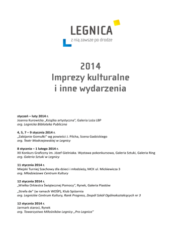 2014 Imprezy kulturalne i inne wydarzenia styczeń – luty 2014 r. Joanna Kurowicka „Książka artystyczna”, Galeria Loża LBP org. Legnicka Biblioteka Publiczna 4, 5, 7 – 9 stycznia 2014 r. „Zabijanie Gomułki” wg powieści J. Pilcha, Scena Gadzickiego org. Teatr Modrzejewskiej w Legnicy 8 stycznia – 1 lutego 2014 r. XII Konkurs Graficzny im. Józef Gielniaka. Wystawa pokonkursowa, Galeria Sztuki, Galeria Ring org. Galeria Sztuki w Legnicy 11 stycznia 2014 r. Miejski Turniej Szachowy dla dzieci i młodzieży, MCK ul. Mickiewicza 3 org. Młodzieżowe Centrum Kultury 12 stycznia 2014 r. „Wielka Orkiestra Świątecznej Pomocy”, Rynek, Galeria Piastów „Strefa de” (w ramach WOŚP), Klub Spiżarnia org. Legnickie Centrum Kultury, Rank Progress, Zespół Szkół Ogólnokształcących nr 3 12 stycznia 2014 r. Jarmark staroci, Rynek org. Towarzystwo Miłośników Legnicy „Pro Legnica” 14 stycznia 2014 r. Ambasadorzy Poezji. 1. Polsko-rosyjskie spotkania poetów – wieczór autorski Linory Goralik i Demiana Kudryavtseva, czytelnia główna LBP org. Legnicka Biblioteka Publiczna 15 – 19 stycznia 2014 r. „Iwanow” A. Czechowa, Scena Gadzickiego org. Teatr Modrzejewskiej w Legnicy 16 stycznia 2014 r. „Iluzja uczuć” – promocja książki legniczanki Barbary Tomaszewskiej, Czytelnia Naukowa LBP org. Legnicka Biblioteka Publiczna 18 stycznia 2014 r. Koncert z okazji Dnia Babci i Dziadka, MCK ul. Mickiewicza 3 org. Młodzieżowe Centrum Kultury 19 stycznia 2014 r. „Koncert kolęd i pastorałek”, Kościół pw. Najświętszego Serca Pana Jezusa org. Legnickie Centrum Kultury 21 stycznia – 29 marca „Podział światła. Magdalena Konieczna – witraże”, gmach główny Muzeum Miedzi org. Muzeum Miedzi 22 i 23 stycznia 2014 r. „Niekończąca się opowieść”, Scena Gadzickiego org. Teatr Modrzejewskiej w Legnicy 23 stycznia 2014 r. „Momenty prozaiczne” – spotkanie autorskie z prof. Janem Kurowickim, Czytelnia Naukowa LBP org. Legnicka Biblioteka Publiczna 25 stycznia 2014 r. Otwarcie wystawy prac uczestników kół plastycznych i ceramicznych, MCK ul. Mickiewicza 3 org. Młodzieżowe Centrum Kultury 5 lutego 2014 r. Podsumowanie Dolnośląskiego Konkursu Plastycznego „ Detal w architekturze", MCK ul. Mickiewicza 3 org. Młodzieżowe Centrum Kultury 5 lutego – 2 marca 2014 r. Kacper Piskorowski „Głuchy krzyk”, Galeria Sztuki Maria Rogala „Malarstwo”, Galeria Ring org. Galeria Sztuki w Legnicy 8 lutego – 29 marca 2014 r. „Był bal. Moda na karnawał” - wystawa kolekcji Muzeum Narodowego we Wrocławiu org. Muzeum Miedzi 8 lutego 2014 r. Dolnośląski Konkurs Piosenki Dziecięcej „ Dzieciopiewy”, MCK ul. Mickiewicza 3 org. Młodzieżowe Centrum Kultury 9 lutego 2014 r. Jarmark staroci, Rynek org. Towarzystwo Miłośników Legnicy „Pro Legnica” 17-28 lutego 2014 r. Ferie zimowe, lodowisko ul. Sejmowa, hala ul. Lotnicza, hala ul. Głogowska org. Ośrodek Sportu i Rekreacji Akcja „Zima z MCK” – półkolonie i zajęcia otwarte, MCK ul. Rataja 24 org. Młodzieżowe Centrum Kultury „Zima w bibliotece”, filie LBP org. Legnicka Biblioteka Publiczna „Zima z LCK” org. Legnickie Centrum Kultury 28.02 – 02.03 2014 r. Blues Day, Kręgielnia „Kometa” org. Legnickie Centrum Kultury marzec – kwiecień 2014 r. Janina Odzierejko – Wystawa obrazów, Galeria Loża LBP org. Legnicka Biblioteka Publiczna 5-30 marca 2014 r. Robert Gauer - „Moja plaża”, hall Teatru im. H. Modrzejewskiej org. Galeria Sztuki w Legnicy 6 marca 2014 r. Miejskie Eliminacje Ogólnopolskiego Samorządowego Konkursu Nastolatków „ 8 wspaniałych", MCK ul. Mickiewicza 3 org. Młodzieżowe Centrum Kultury 6 marca – 6 kwietnia 2014 r. UFO. Play with Glass - Europejski Festiwal Szkła, Galeria Ring Barbara Bańda - „Obrazy”, Galeria Sztuki org. Galeria Sztuki w Legnicy 9 marca 2014 r. Jarmark staroci, Rynek org. Towarzystwo Miłośników Legnicy „Pro Legnica” 12 marca 2014 r. Dolnośląski Przegląd Pieśni i Piosenki Patriotycznej – eliminacje rejonowe, MCK ul. Mickiewicza 3 org. Młodzieżowe Centrum Kultury 21 marca 2014 r. Koncert chórów w ramach cyklu Legnica Cantat Bis, Kościół pw. Najświętszego Serca Pana Jezusa org. Legnickie Centrum Kultury 21 marca 2014 r. Dzień odkrywania talentów, MCK ul. Mickiewicza 3 org. Młodzieżowe Centrum Kultury 26 marca 2014 r. Wiosenne Spotkania z Teatrem Jednego Aktora, MCK ul. Mickiewicza 3 org. Młodzieżowe Centrum Kultury 28 marca 2014 r. Jazz Day, Kręgielnia „Kometa” org. Legnickie Centrum Kultury 28 marca 2014 r. Dzień Teatru w MCK – przegląd grup teatralnych, MCK ul. Mickiewicza 3 org. Młodzieżowe Centrum Kultury 29 marca 2014 r. „Światowy Dzień Inwalidy i Osób Niepełnosprawnych”, Dom Kultury „Atrium” org. Filia nr 1 i Filia nr 6 Legnickiej Biblioteki Publicznej 29-30 marca 2014 r. „IV Noc z Andersenem” – nocna impreza czytelnicza dla dzieci, Ekobiblioteka org. Ekobiblioteka i Filia Dziecięco-Młodzieżowa LBP 1 kwietnia 2014 r. Koncert chórów w ramach cyklu Legnica Cantat Bis - Kościół pw. Najświętszego Serca Pana Jezusa org. Legnickie Centrum Kultury 2 kwietnia 2014 r. „Przyjaciele jakich niewielu”- finał konkursu czytelniczego z udziałem pisarza Grzegorza Kasdepke, Czytelnia Naukowa LBP org. Legnicka Biblioteka Publiczna 5 kwietnia 2014 r. Otwarte Mistrzostwa Legnicy w Nordic Walking, Park Miejski org. Ośrodek Sportu i Rekreacji 8 kwietnia 2014 r. Podsumowanie Ogólnopolskiego Konkursu Dziecięcego Rękodzieła Artystycznego „Wiosna", MCK ul. Mickiewicza 3 org. Młodzieżowe Centrum Kultury 9 kwietnia 2014 r. Rejonowy Konkurs Recytatorski dla klas I-III „Maluchy lubią wiersze", MCK ul. Mickiewicza 3 org. Młodzieżowe Centrum Kultury 12 kwietnia 2014 r. Miejski Turniej Szachowy MCK ul. Mickiewicza 3 org. Młodzieżowe Centrum Kultury 13 kwietnia 2014 r. Jarmark staroci, Rynek org. Towarzystwo Miłośników Legnicy „Pro Legnica”