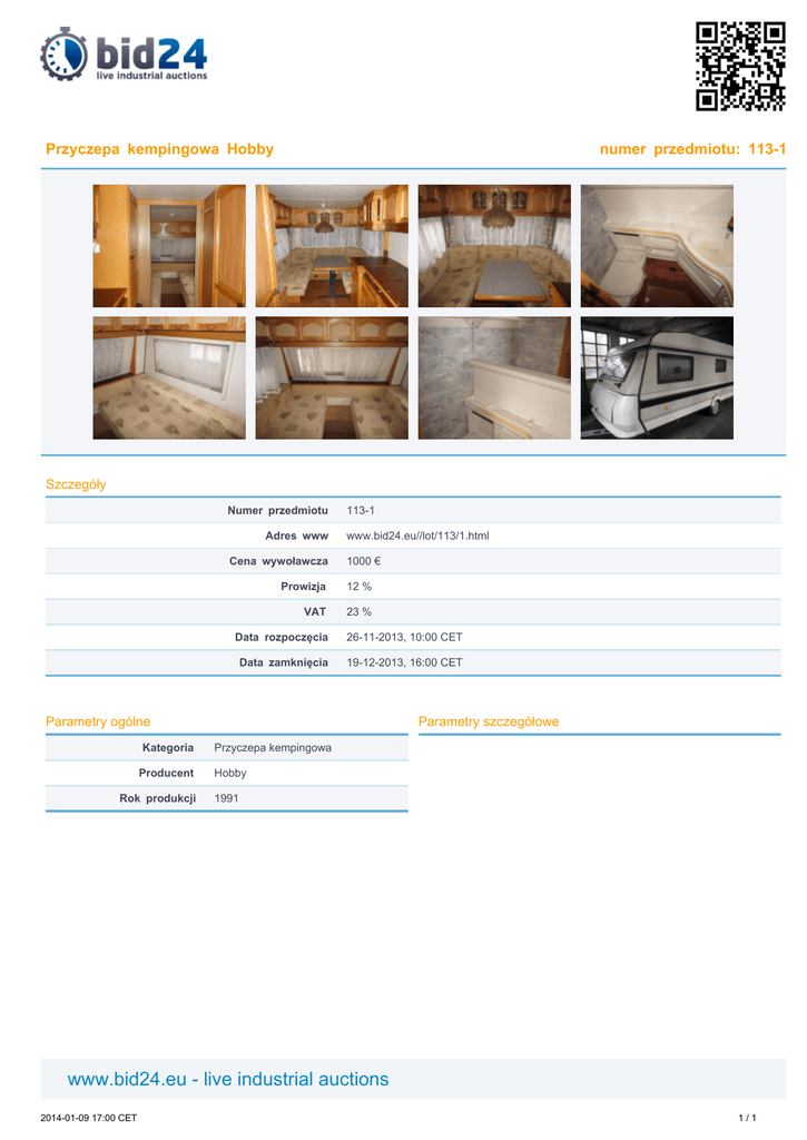 Przyczepa kempingowa Hobby numer przedmiotu: 113-1 Szczegóły Numer przedmiotu Adres www Cena wywoławcza 113-1 www.bid24.eu//lot/113/1.html 1000 € Prowizja 12 % VAT 23 % Data rozpoczęcia 26-11-2013, 10:00 CET Data zamknięcia 19-12-2013, 16:00 CET Parametry ogólne Kategoria Producent Rok produkcji Parametry szczegółowe Przyczepa kempingowa Hobby 1991 www.bid24.eu - live industrial auctions 2014-01-09 17:00 CET 1/1