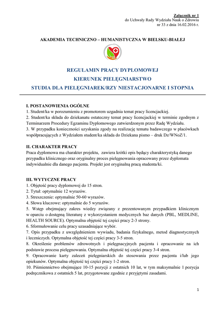 Załącznik nr 1 do Uchwały Rady Wydziału Nauk o Zdrowiu nr 33 z dnia 16.02.2016 r. AKADEMIA TECHNICZNO – HUMANISTYCZNA W BIELSKU-BIAŁEJ REGULAMIN PRACY DYPLOMOWEJ KIERUNEK PIELĘGNIARSTWO STUDIA DLA PIELĘGNIAREK/RZY NIESTACJONARNE I STOPNIA I. POSTANOWIENIA OGÓLNE 1. Student/ka w porozumieniu z promotorem uzgadnia temat pracy licencjackiej. 2. Student/ka składa do dziekanatu ostateczny temat pracy licencjackiej w terminie zgodnym z Terminarzem Procedury Egzaminu Dyplomowego zatwierdzonym przez Radę Wydziału. 3. W przypadku konieczności uzyskania zgody na realizację tematu badawczego w placówkach współpracujących z Wydziałem student/ka składa do Dziekana pismo – druk Dz/WNoZ/1. II. CHARAKTER PRACY Praca dyplomowa ma charakter projektu, zawiera krótki opis będący charakterystyką danego przypadku klinicznego oraz oryginalny proces pielęgnowania opracowany przez dyplomata indywidualnie dla danego pacjenta. Projekt jest oryginalną pracą studenta/ki. III. WYTYCZNE PRACY 1. Objętość pracy dyplomowej do 15 stron. 2. Tytuł: optymalnie 12 wyrazów. 3. Streszczenie: optymalnie 50-60 wyrazów. 4. Słowa kluczowe: optymalnie do 5 wyrazów. 5. Wstęp obejmujący zakres wiedzy związany z prezentowanym przypadkiem klinicznym w oparciu o dostępną literaturę z wykorzystaniem medycznych baz danych (PBL, MEDLINE, HEALTH SOURCE). Optymalna objętość tej części pracy 2-3 strony. 6. Sformułowanie celu pracy uzasadniające wybór. 7. Opis przypadku z uwzględnieniem wywiadu, badania fizykalnego, metod diagnostycznych i leczniczych. Optymalna objętość tej części pracy 3-5 stron. 8. Określenie problemów zdrowotnych i pielęgnacyjnych pacjenta i opracowanie na ich podstawie procesu pielęgnowania. Optymalna objętość tej części pracy 3-4 stron. 9. Opracowanie karty zaleceń pielęgniarskich do stosowania przez pacjenta i/lub jego opiekunów. Optymalna objętość tej części pracy 1-2 stron. 10. Piśmiennictwo obejmujące 10-15 pozycji z ostatnich 10 lat, w tym maksymalnie 1 pozycja podręcznikowa z ostatnich 5 lat, przygotowane zgodnie z przyjętymi zasadami. 1 Załącznik nr 1 do Uchwały Rady Wydziału Nauk o Zdrowiu nr 33 z dnia 16.02.2016 r. IV. WYMAGANIA EDYTORSKIE 1. Druk A4, jednostronny. 2. Czcionka: Times New Roman 3. Wielkość czcionki: tytuły rozdziałów wytłuszczone - 14 pkt.; tytuły podrozdziałów wytłuszczone – 13 pkt., tekst - 12 pkt.. 4. Interlinia: 1,5 wiersza 5. Marginesy: górny: 2,5 cm dolny: 2,5 cm lewy: 3,5 cm prawy: 1,5 cm 6. Tekst wyjustowany obustronnie. 7. Numerowanie stron: u dołu strony; wszystkie strony pracy, począwszy od rozdziału „Spis treści”. 8. Nie należy stawiać kropek po tytułach rozdziałów i podrozdziałów. V. POSTANOWIENIA KOŃCOWE 1. Ostateczną wersję pracy dyplomowej (jeden egzemplarz) wraz z elektroniczną wersją pracy na płytce CD student/ka składa u promotora pracy zgodnie z Terminarzem Procedury Egzaminu Dyplomowego. 2. Egzemplarz pracy powinien być zbindowany. 2 Załącznik nr 1 do Uchwały Rady Wydziału Nauk o Zdrowiu nr 33 z dnia 16.02.2016 r. - WZÓR - AKADEMIA TECHNICZNO-HUMANISTYCZNA W BIELSKU - BIAŁEJ WYDZIAŁ NAUK O ZDROWIU PRACA DYPLOMOWA - PROJEKT nr …………… Imię i Nazwisko nr albumu: ……………………………….….…. kierunek studiów: ……………………………….….…. poziom kształcenia: ……………………………….….…. Temat pracy: .................................................................................................... .................................................................................................... Promotor pracy: .................................... Miejscowość, Rok akademicki …../….. 3 Załącznik nr 1 do Uchwały Rady Wydziału Nauk o Zdrowiu nr 33 z dnia 16.02.2016 r. - WZÓR - AKADEMIA TECHNICZNO-HUMANISTYCZNA W BIELSKU - BIAŁEJ WYDZIAŁ NAUK O ZDROWIU PRACA DYPLOMOWA nr……. Imię i Nazwisko nr albumu: .......................... kierunek studiów: .......................... poziom kształcenia ……………….. Temat pracy: ...................................................................... ...................................................................... Promotor pracy: .................................... Bielsko-Biała, rok akademicki ……/…… 4