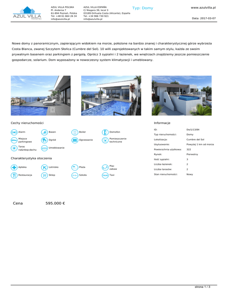 AZUL VILLA POLSKA Pl. Andersa 7 61-894 Poznań, Polska Tel. +48 61 664 26 34 [email protected] AZUL VILLA ESPAÑA C/ Niagara 39, local 3 03189 Orihuela Costa (Alicante), España Tel. +34 966 730 921 [email protected] www.azulvilla.pl Typ: Domy Data: 2017-03-07 Nowe domy z panoramicznym, zapierającym widokiem na morze, położone na bardzo znanej i charakterystycznej górze wybrzeża Costa Blanca, zwanej Szczytem Słońca (Cumbre del Sol). 10 willi zaprojektowanych w takim samym stylu, każda ze swoim prywatnym basenem oraz parkingiem z pergolą. Oprócz 3 sypialni i 2 łazienek, we wnętrzach znajdziemy jeszcze pomieszczenie gospodarcze, solarium. Dom wyposażony w nowoczesny system klimatyzacji i umeblowany. Cechy nieruchomości Alarm Miejsce parkingowe Taras na dachu Informacje Basen Ogród Boiler Ogrzewanie Domofon Pomieszczenie techniczne Umeblowanie Charakterystyka otoczenia Apteka Restauracja Cena Lotnisko Sklep Plaża Szkoła Plac zabaw Taxi ID: Do/1/13/84 Typ nieruchomości: Domy Lokalizacja: Cumbre del Sol Usytuowanie: Powyżej 1 km od morza Powierzchnia użytkowa: 322 Rynek: Pierwotny Ilość sypialni: 3 Liczba łazienek: 2 Liczba tarasów: 2 Stan nieruchomości: Nowy 595.000 € strona 1 / 3 AZUL VILLA POLSKA Pl. Andersa 7 61-894 Poznań, Polska Tel. +48 61 664 26 34 [email protected] AZUL VILLA ESPAÑA C/ Niagara 39, local 3 03189 Orihuela Costa (Alicante), España Tel. +34 966 730 921 [email protected] Typ: Domy www.azulvilla.pl Data: 2017-03-07 strona 2 / 3 AZUL VILLA POLSKA Pl. Andersa 7 61-894 Poznań, Polska Tel. +48 61 664 26 34 [email protected] AZUL VILLA ESPAÑA C/ Niagara 39, local 3 03189 Orihuela Costa (Alicante), España Tel. +34 966 730 921 [email protected] Typ: Domy www.azulvilla.pl Data: 2017-03-07 strona 3 / 3