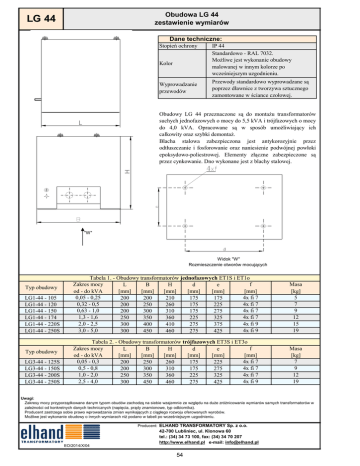 Obudowa LG 44 zestawienie wymiarów LG 44 Dane techniczne: Stopień ochrony Kolor Wyprowadzanie przewodów IP 44 Standardowo - RAL 7032. Możliwe jest wykonanie obudowy malowanej w innym kolorze po wcześniejszym uzgodnieniu. Przewody standardowo wyprowadzane są poprzez dławnice z tworzywa sztucznego zamontowane w ściance czołowej. Obudowy LG 44 przeznaczone są do montażu transformatorów suchych jednofazowych o mocy do 5,5 kVA i trójfazowych o mocy do 4,0 kVA. Opracowane są w sposób umożliwiający ich całkowity oraz szybki demontaż. Blacha stalowa zabezpieczona jest antykorozyjnie przez odtłuszczanie i fosforowanie oraz naniesienie podwójnej powłoki epoksydowo-poliestrowej. Elementy złączne zabezpieczone są przez cynkowanie. Dno wykonane jest z blachy stalowej. "W" Widok "W" Rozmieszczenie otworów mocujących Typ obudowy LG1-44 - 105 LG1-44 - 120 LG1-44 - 150 LG1-44 - 174 LG1-44 - 220S LG1-44 - 250S Typ obudowy LG3-44 - 125S LG3-44 - 150S LG3-44 - 200S LG3-44 - 250S Tabela 1. - Obudowy transformatorów jednofazowych ET1S i ET1o f Zakres mocy L B H d e od - do kVA [mm] [mm] [mm] [mm] [mm] [mm] 4x fi 7 0,05 - 0,25 200 200 210 175 175 0,32 - 0,5 4x fi 7 200 250 260 175 225 4x fi 7 0,63 - 1,0 200 300 310 175 275 1,3 - 1,6 4x fi 7 250 350 360 225 325 4x fi 9 2,0 - 2,5 300 400 410 275 375 3,0 - 5,0 4x fi 9 300 450 460 275 425 Masa [kg] 5 7 9 12 15 19 Tabela 2. - Obudowy transformatorów trójfazowych ET3S i ET3o f Zakres mocy L B H d e [mm] [mm] [mm] [mm] [mm] od - do kVA [mm] 0,05 - 0,3 4x fi 7 200 250 260 175 225 0,5 - 0,8 4x fi 7 200 300 310 175 275 1,0 - 2,0 4x fi 7 250 350 360 225 325 2,5 - 4,0 4x fi 9 300 450 460 275 425 Masa [kg] 7 9 12 19 Uwagi: Zakresy mocy przyporządkowane danym typom obudów zachodzą na siebie wzajemnie ze względu na duże zróżnicowanie wymiarów samych transformatorów w zależności od konkretnych danych technicznych (napięcia, prądy znamionowe, typ odbiornika). Producent zastrzega sobie prawo wprowadzania zmian wynikających z ciągłego rozwoju oferowanych wyrobów. Możliwe jest wykonanie obudowy o innych wymiarach niż podano w tabeli po wcześniejszym uzgodnieniu. Producent: ELHAND TRANSFORMATORY Sp. z o.o. EO/2014/X/04 42-700 Lubliniec, ul. Klonowa 60 tel.: (34) 34 73 100, fax: (34) 34 70 207 http://www.elhand.pl e-mail: [email protected] 54