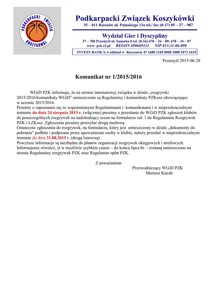 Podkarpacki Związek Koszykówki 35 – 011 Rzeszów ul. Pułaskiego 13a tel./ fax (0-17) 85 – 27 – 987 Wydział Gier i Dyscypliny 37 – 700 Przemyśl ul. Sanocka 8 tel. (0-16) 678 – 26 – 89; 678 – 34 – 07 www. pzk.z2.pl REGON 690669332 NIP 813-31-06-090 INVEST-BANK S.A oddział w Rzeszowie 47 1680 1105 0000 3000 1073 1619 Przemyśl 2015-06-28 Komunikat nr 1/2015/2016 WGiD PZK informuje, że na stronie internetowej związku w dziale „rozgrywki 2015/2016/komunikaty WGiD” umieszczone są Regulaminy i komunikaty PZKosz obowiązujące w sezonie 2015/2016. Prosimy o zapoznanie się ze wspomnianymi Regulaminami i komunikatami i w nieprzekraczalnym terminie do dnia 24 sierpnia 2015 r. (włącznie) prosimy o przesłanie do WGiD PZK zgłoszeń klubów do poszczególnych rozgrywek na nadchodzący sezon na formularzu zał. 1 do Regulaminu Rozgrywek PZK i LZKosz. Zgłoszenia prosimy przesyłać drogą mailową. Ostateczne zgłoszenia do rozgrywek, na formularzu, który jest umieszczony w dziale „dokumenty do pobrania” podbite i podpisane przez upoważnione osoby w klubie, należy przesłać w nieprzekraczalnym terminie do dnia 31.08.2015 r. (drogą listowną). Powyższe informacje są niezbędne do planów organizacji rozgrywek okręgowych i strefowych. Informujemy również, iż w możliwie szybkim czasie – do końca lipca br. - zostaną umieszczone na stronie Regulaminy rozgrywek PZK oraz Regulamin opłat PZK. Z poważaniem Przewodniczący WGiD PZK Mariusz Kucab