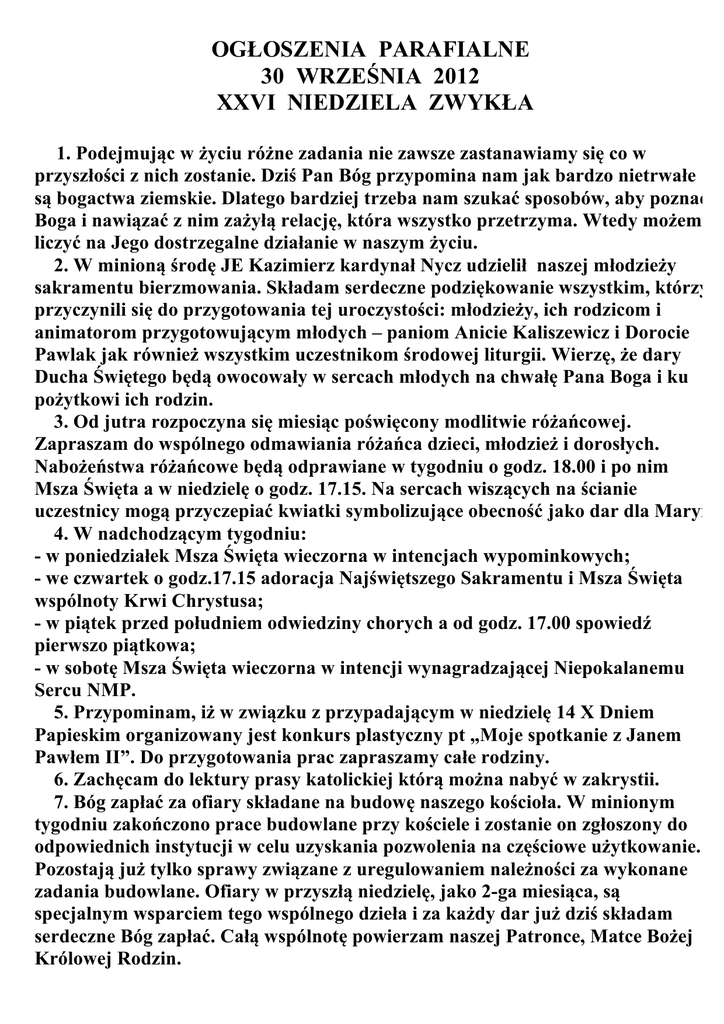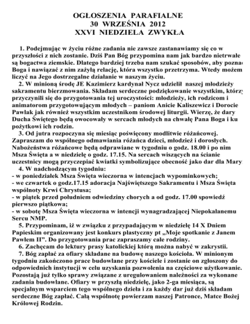 OGŁOSZENIA PARAFIALNE 30 WRZEŚNIA 2012 XXVI NIEDZIELA ZWYKŁA 1. Podejmując w życiu różne zadania nie zawsze zastanawiamy się co w przyszłości z nich zostanie. Dziś Pan Bóg przypomina nam jak bardzo nietrwałe są bogactwa ziemskie. Dlatego bardziej trzeba nam szukać sposobów, aby poznać Boga i nawiązać z nim zażyłą relację, która wszystko przetrzyma. Wtedy możemy liczyć na Jego dostrzegalne działanie w naszym życiu. 2. W minioną środę JE Kazimierz kardynał Nycz udzielił naszej młodzieży sakramentu bierzmowania. Składam serdeczne podziękowanie wszystkim, którzy przyczynili się do przygotowania tej uroczystości: młodzieży, ich rodzicom i animatorom przygotowującym młodych – paniom Anicie Kaliszewicz i Dorocie Pawlak jak również wszystkim uczestnikom środowej liturgii. Wierzę, że dary Ducha Świętego będą owocowały w sercach młodych na chwałę Pana Boga i ku pożytkowi ich rodzin. 3. Od jutra rozpoczyna się miesiąc poświęcony modlitwie różańcowej. Zapraszam do wspólnego odmawiania różańca dzieci, młodzież i dorosłych. Nabożeństwa różańcowe będą odprawiane w tygodniu o godz. 18.00 i po nim Msza Święta a w niedzielę o godz. 17.15. Na sercach wiszących na ścianie uczestnicy mogą przyczepiać kwiatki symbolizujące obecność jako dar dla Maryi. 4. W nadchodzącym tygodniu: - w poniedziałek Msza Święta wieczorna w intencjach wypominkowych; - we czwartek o godz.17.15 adoracja Najświętszego Sakramentu i Msza Święta wspólnoty Krwi Chrystusa; - w piątek przed południem odwiedziny chorych a od godz. 17.00 spowiedź pierwszo piątkowa; - w sobotę Msza Święta wieczorna w intencji wynagradzającej Niepokalanemu Sercu NMP. 5. Przypominam, iż w związku z przypadającym w niedzielę 14 X Dniem Papieskim organizowany jest konkurs plastyczny pt „Moje spotkanie z Janem Pawłem II”. Do przygotowania prac zapraszamy całe rodziny. 6. Zachęcam do lektury prasy katolickiej którą można nabyć w zakrystii. 7. Bóg zapłać za ofiary składane na budowę naszego kościoła. W minionym tygodniu zakończono prace budowlane przy kościele i zostanie on zgłoszony do odpowiednich instytucji w celu uzyskania pozwolenia na częściowe użytkowanie. Pozostają już tylko sprawy związane z uregulowaniem należności za wykonane zadania budowlane. Ofiary w przyszłą niedzielę, jako 2-ga miesiąca, są specjalnym wsparciem tego wspólnego dzieła i za każdy dar już dziś składam serdeczne Bóg zapłać. Całą wspólnotę powierzam naszej Patronce, Matce Bożej Królowej Rodzin.