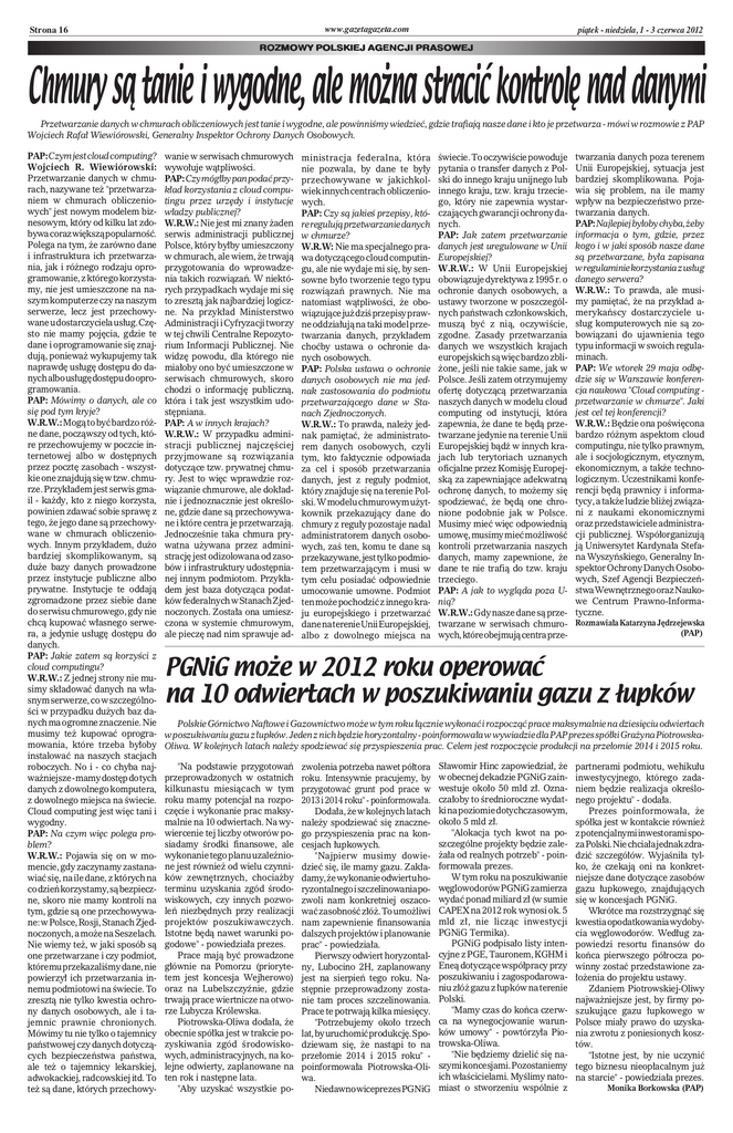 www.gazetagazeta.com Strona 16 piątek - niedziela, 1 - 3 czerwca 2012 ROZMOWY POLSKIEJ AGENCJI PRASOWEJ Chmury są tanie i wygodne, ale można stracić kontrolę nad danymi Przetwarzanie danych w chmurach obliczeniowych jest tanie i wygodne, ale powinniśmy wiedzieć, gdzie trafiają nasze dane i kto je przetwarza - mówi w rozmowie z PAP Wojciech Rafał Wiewiórowski, Generalny Inspektor Ochrony Danych Osobowych. PAP: Czym jest cloud computing? Wojciech R. Wiewiórowski: Przetwarzanie danych w chmurach, nazywane też "przetwarzaniem w chmurach obliczeniowych" jest nowym modelem biznesowym, który od kilku lat zdobywa coraz większą popularność. Polega na tym, że zarówno dane i infrastruktura ich przetwarzania, jak i różnego rodzaju oprogramowanie, z którego korzystamy, nie jest umieszczone na naszym komputerze czy na naszym serwerze, lecz jest przechowywane u dostarczyciela usług. Często nie mamy pojęcia, gdzie te dane i oprogramowanie się znajdują, ponieważ wykupujemy tak naprawdę usługę dostępu do danych albo usługę dostępu do oprogramowania. PAP: Mówimy o danych, ale co się pod tym kryje? W.R.W.: Mogą to być bardzo różne dane, począwszy od tych, które przechowujemy w poczcie internetowej albo w dostępnych przez pocztę zasobach - wszystkie one znajdują się w tzw. chmurze. Przykładem jest serwis gmail - każdy, kto z niego korzysta, powinien zdawać sobie sprawę z tego, że jego dane są przechowywane w chmurach obliczeniowych. Innym przykładem, dużo bardziej skomplikowanym, są duże bazy danych prowadzone przez instytucje publiczne albo prywatne. Instytucje te oddają zgromadzone przez siebie dane do serwisu chmurowego, gdy nie chcą kupować własnego serwera, a jedynie usługę dostępu do danych. PAP: Jakie zatem są korzyści z cloud computingu? W.R.W.: Z jednej strony nie musimy składować danych na własnym serwerze, co w szczególności w przypadku dużych baz danych ma ogromne znaczenie. Nie musimy też kupować oprogramowania, które trzeba byłoby instalować na naszych stacjach roboczych. No i - co chyba najważniejsze - mamy dostęp do tych danych z dowolnego komputera, z dowolnego miejsca na świecie. Cloud computing jest więc tani i wygodny. PAP: Na czym więc polega problem? W.R.W.: Pojawia się on w momencie, gdy zaczynamy zastanawiać się, na ile dane, z których na co dzień korzystamy, są bezpieczne, skoro nie mamy kontroli na tym, gdzie są one przechowywane: w Polsce, Rosji, Stanach Zjednoczonych, a może na Seszelach. Nie wiemy też, w jaki sposób są one przetwarzane i czy podmiot, któremu przekazaliśmy dane, nie powierzył ich przetwarzania innemu podmiotowi na świecie. To zresztą nie tylko kwestia ochrony danych osobowych, ale i tajemnic prawnie chronionych. Mówimy tu nie tylko o tajemnicy państwowej czy danych dotyczących bezpieczeństwa państwa, ale też o tajemnicy lekarskiej, adwokackiej, radcowskiej itd. To też są dane, których przechowy- wanie w serwisach chmurowych wywołuje wątpliwości. PAP: Czy mógłby pan podać przykład korzystania z cloud computingu przez urzędy i instytucje władzy publicznej? W.R.W.: Nie jest mi znany żaden serwis administracji publicznej Polsce, który byłby umieszczony w chmurach, ale wiem, że trwają przygotowania do wprowadzenia takich rozwiązań. W niektórych przypadkach wydaje mi się to zresztą jak najbardziej logiczne. Na przykład Ministerstwo Administracji i Cyfryzacji tworzy w tej chwili Centralne Repozytorium Informacji Publicznej. Nie widzę powodu, dla którego nie miałoby ono być umieszczone w serwisach chmurowych, skoro chodzi o informację publiczną, która i tak jest wszystkim udostępniana. PAP: A w innych krajach? W.R.W.: W przypadku administracji publicznej najczęściej przyjmowane są rozwiązania dotyczące tzw. prywatnej chmury. Jest to więc wprawdzie rozwiązanie chmurowe, ale dokładnie i jednoznacznie jest określone, gdzie dane są przechowywane i które centra je przetwarzają. Jednocześnie taka chmura prywatna używana przez administrację jest odizolowana od zasobów i infrastruktury udostępnianej innym podmiotom. Przykładem jest baza dotycząca podatków federalnych w Stanach Zjednoczonych. Została ona umieszczona w systemie chmurowym, ale pieczę nad nim sprawuje ad- ministracja federalna, która nie pozwala, by dane te były przechowywane w jakichkolwiek innych centrach obliczeniowych. PAP: Czy są jakieś przepisy, które regulują przetwarzanie danych w chmurze? W.R.W: Nie ma specjalnego prawa dotyczącego cloud computingu, ale nie wydaje mi się, by sensowne było tworzenie tego typu rozwiązań prawnych. Nie ma natomiast wątpliwości, że obowiązujące już dziś przepisy prawne oddziałują na taki model przetwarzania danych, przykładem choćby ustawa o ochronie danych osobowych. PAP: Polska ustawa o ochronie danych osobowych nie ma jednak zastosowania do podmiotu przetwarzającego dane w Stanach Zjednoczonych. W.R.W.: To prawda, należy jednak pamiętać, że administratorem danych osobowych, czyli tym, kto faktycznie odpowiada za cel i sposób przetwarzania danych, jest z reguły podmiot, który znajduje się na terenie Polski. W modelu chmurowym użytkownik przekazujący dane do chmury z reguły pozostaje nadal administratorem danych osobowych, zaś ten, komu te dane są przekazywane, jest tylko podmiotem przetwarzającym i musi w tym celu posiadać odpowiednie umocowanie umowne. Podmiot ten może pochodzić z innego kraju europejskiego i przetwarzać dane na terenie Unii Europejskiej, albo z dowolnego miejsca na świecie. To oczywiście powoduje pytania o transfer danych z Polski do innego kraju unijnego lub innego kraju, tzw. kraju trzeciego, który nie zapewnia wystarczających gwarancji ochrony danych. PAP: Jak zatem przetwarzanie danych jest uregulowane w Unii Europejskiej? W.R.W.: W Unii Europejskiej obowiązuje dyrektywa z 1995 r. o ochronie danych osobowych, a ustawy tworzone w poszczególnych państwach