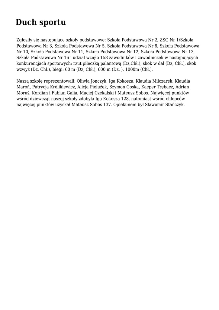 Duch sportu Zgłosiły się następujące szkoły podstawowe: Szkoła Podstawowa Nr 2, ZSG Nr 1/Szkoła Podstawowa Nr 3, Szkoła Podstawowa Nr 5, Szkoła Podstawowa Nr 8, Szkoła Podstawowa Nr 10, Szkoła Podstawowa Nr 11, Szkoła Podstawowa Nr 12, Szkoła Podstawowa Nr 13, Szkoła Podstawowa Nr 16 i udział wzięło 158 zawodników i zawodniczek w następujących konkurencjach sportowych: rzut piłeczką palantową (Dz,Chł.), skok w dal (Dz, Chł.), skok wzwyż (Dz, Chł.), biegi: 60 m (Dz, Chł.), 600 m (Dz, ), 1000m (Chł.). Naszą szkołę reprezentowali: Oliwia Jonczyk, Iga Kokosza, Klaudia Milczarek, Klaudia Maroń, Patrycja Królikiewicz, Alicja Pielużek, Szymon Goska, Kacper Trębacz, Adrian Moruś, Kordian i Fabian Galia, Maciej Czekalski i Mateusz Sobos. Najwięcej punktów wśród dziewcząt naszej szkoły zdobyła Iga Kokosza 128, natomiast wśród chłopców najwięcej punktów uzyskał Mateusz Sobos 137. Opiekunem był Sławomir Stańczyk.