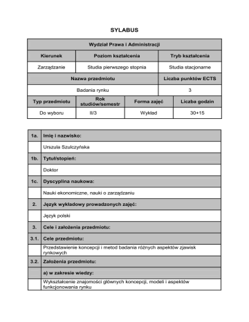 SYLABUS Wydział Prawa i Administracji Kierunek Poziom kształcenia Tryb kształcenia Zarządzanie Studia pierwszego stopnia Studia stacjonarne Nazwa przedmiotu Liczba punktów ECTS Badania rynku 3 Typ przedmiotu Rok studiów/semestr Do wyboru 1a. Forma zajęć Liczba godzin Wykład 30+15 II/3 Imię i nazwisko: Urszula Szulczyńska 1b. Tytuł/stopień: Doktor 1c. Dyscyplina naukowa: Nauki ekonomiczne, nauki o zarządzaniu 2. Język wykładowy prowadzonych zajęć: Język polski 3. Cele i załoŜenia przedmiotu: 3.1. Cele przedmiotu: Przedstawienie koncepcji i metod badania róŜnych aspektów zjawisk rynkowych 3.2. ZałoŜenia przedmiotu: a) w zakresie wiedzy: Wykształcenie znajomości głównych koncepcji, modeli i aspektów funkcjonowania rynku b) w zakresie postaw: Wykształcenie potrzeb w zakresie pozyskiwania informacji o rynku dla zmniejszania niepewności w zarządzaniu oraz ograniczających ryzyko podejmowania decyzji o działaniach na rynku c) w zakresie umiejętności: Wykształcenie umiejętność wykorzystania danych płynących z rynku do podejmowania decyzji zarządczych; umiejętności zastosowania metod statystycznych i modeli ekonometrycznych do analizy danych rynkowych 4. Wymagania wstępne: Wiedza z zakresu mikroekonomii i statystyki 5. Metody dydaktyczne: Wykład aktywny, prezentacje przy uŜyciu rzutnika multimedialnego, rozwiązywanie zadań ilustrujących prezentowane zagadnienia i metody przy wykorzystaniu arkuszy kalkulacyjnych 6. Forma i warunki zaliczania przedmiotu: Pisemny sprawdzian wiadomości 7. Treści kształcenia (programowe): Istota rynku i mechanizmu rynkowego; działanie klasycznego i ograniczonego mechanizmu rynkowego; znaczenie badań rynku dla procesu podejmowania decyzji; mechanizm równowagi rynkowej w ujęciu statycznym i dynamicznym; modelowanie ekonometryczne zjawisk rynkowych; analiza pojemności rynku; analiza rynku w ujęciu przestrzennym; metody klasyfikacji obiektów, zastosowanie w badaniach rynku analizy conjoint; analiza chłonności rynku; analiza rozwoju zjawisk rynkowych w czasie; badanie udziału przedsiębiorstwa i jego konkurencyjności na rynku; badania rynku w przekroju strukturalnym 8. Wykaz literatury podstawowej: S. Mynarski, Badania rynkowe w przedsiębiorstwie, Akademia Ekonomiczna w Krakowie, Kraków 2001; Analiza rynku, red. H. Mruk, PWE, Warszawa 2003 9. Wykaz literatury uzupełniającej: Analiza rynku. Systemy i mechanizmy, red. S. Mynarski, Kraków 1993; S. Mynarski, Analiza rynku. Makromechanizmy, Akademia Ekonomiczna w Krakowie, Kraków 2000; G. Rosa, A. Smalec, Analiza i funkcjonowanie rynku na przykładach, Uniwersytet Szczeciński, Szczecin 2000; M. Rószkiewicz, Metody ilościowe w badaniach marketingowych, Wydawnictwo Naukowe PWN, Warszawa 2002; W. Wrzosek, Funkcjonowanie rynku, PWE, Warszawa 2002; H. Simon, Zarządzanie cenami, Wydawnictwo Naukowe PWN, Warszawa 1996; W. F. Samuelson, S. G. Marks, Ekonomia menedŜerska, PWE, Warszawa 1998 10. Akceptacja kierownika Katedry/Zakładu/Studium: