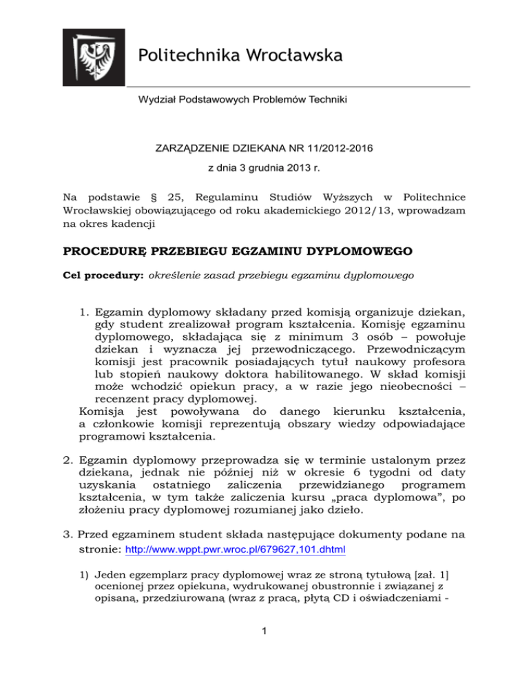 Politechnika Wrocławska Wydział Podstawowych Problemów Techniki ZARZĄDZENIE DZIEKANA NR 11/2012-2016 z dnia 3 grudnia 2013 r. Na podstawie § 25, Regulaminu Studiów Wyższych w Politechnice Wrocławskiej obowiązującego od roku akademickiego 2012/13, wprowadzam na okres kadencji PROCEDURĘ PRZEBIEGU EGZAMINU DYPLOMOWEGO Cel procedury: określenie zasad przebiegu egzaminu dyplomowego 1. Egzamin dyplomowy składany przed komisją organizuje dziekan, gdy student zrealizował program kształcenia. Komisję egzaminu dyplomowego, składająca się z minimum 3 osób – powołuje dziekan i wyznacza jej przewodniczącego. Przewodniczącym komisji jest pracownik posiadających tytuł naukowy profesora lub stopień naukowy doktora habilitowanego. W skład komisji może wchodzić opiekun pracy, a w razie jego nieobecności – recenzent pracy dyplomowej. Komisja jest powoływana do danego kierunku kształcenia, a członkowie komisji reprezentują obszary wiedzy odpowiadające programowi kształcenia. 2. Egzamin dyplomowy przeprowadza się w terminie ustalonym przez dziekana, jednak nie później niż w okresie 6 tygodni od daty uzyskania ostatniego zaliczenia przewidzianego programem kształcenia, w tym także zaliczenia kursu „praca dyplomowa”, po złożeniu pracy dyplomowej rozumianej jako dzieło. 3. Przed egzaminem student składa następujące dokumenty podane na stronie: http://www.wppt.pwr.wroc.pl/679627,101.dhtml 1) Jeden egzemplarz pracy dyplomowej wraz ze stroną tytułową [zał. 1] ocenionej przez opiekuna, wydrukowanej obustronnie i związanej z opisaną, przedziurowaną (wraz z pracą, płytą CD i oświadczeniami 1 Politechnika Wrocławska Wydział Podstawowych Problemów Techniki [zał. 2] i [zał. 3] teczką (teczki oraz strony tytułowe są do pobrania w głównym dziekanacie). 2) Drugi egzemplarz pracy dyplomowej (oprawiony lub zbindowany przeznaczony będzie do wglądu przez Komisję Dyplomową). 3) Ocena pracy dyplomowej przez PROMOTORA [zał. 4] 4) 4 fotografie - format 45 x 65 mm 5) Dowód wpłaty za dyplom - 60 zł (indywidualne konto do wpłaty za dyplom należy pobrać z Edukacji.CL logując się na portalu). 6) Formularz Biura Karier wypełniony na stronie https://www.biurokarier.pwr.wroc.pl/formularz/form, wydrukowany i podpisany. W przypadku nie wyrażenia zgody na udostępnianie danych osobowych, należy złożyć oświadczenie (zamiast formularza); 7) Karta absolwenta [zał. 5] 8) Oświadczenie dotyczące zgody na udostępnienie [zał. 2] 9) Oświadczenie o samodzielności wykonanej [zał. 3] 10) Przed złożeniem kompletu dokumentów należy pobrać z dziekanatu wypis z indeksu w celu jego weryfikacji 4. Studenci, którzy nie złożą kompletu dokumentów w wyznaczonych terminach, mogą złożyć, do ostatniego dnia sesji letniej, podanie do Dziekana (przez portal EDUKACJA.CL po wcześniejszym wydrukowaniu podania) z opinią opiekuna o przedłużenie terminu złożenia pracy dyplomowej. [zał. 7] 2 Politechnika Wrocławska Wydział Podstawowych Problemów Techniki Przebieg egzaminu 1. Sprawdzenie danych studenta egzaminu dyplomowego. przez przewodniczącego Komisji 2. Egzamin dyplomowy: 1) Autoreferat – główne tezy pracy dyplomowej (z wykorzystaniem prezentacji multimedialnej) – około 7-10 min. dla pracy inżynierskiej oraz 10-12 min dla pracy magisterskiej. 2) Pytania Komisji z zakresu pracy dyplomowej 3) Pytania Komisji z zakresu programu nauczania danego kierunku kształcenia, stopnia i specjalności (poprzez system Dyplom) Pytania egzaminu dyplomowego pochodzą z trzech zestawów zagadnień ustalonych przez komisje ds. egzaminu dyplomowego, oddzielnie dla studiów I-go i II-go stopnia (grupa A - pytania z zakresu przedmiotów podstawowych, B – pytania z kierunku kształcenia, C – pytania ze specjalności lub obszarów dyplomowania). Pytania w zależności od kierunku są ustalane przez Komisję albo losowane. Odpowiedzi na pytania nie powinny przekraczać kilkunastu minut. 3. Zagadnienia do egzaminu dyplomowego, dla poszczególnych kierunków/specjalności i stopni kształcenia, przygotowane przez komisje ds. egzaminu dyplomowego, podane są na stronie Wydziału, http://www.wppt.pwr.wroc.pl/dyplomanci-tematyegzaminacjne,101.dhtml, a także na stronach Instytutów. Pytania/zagadnienia egzaminacyjne weryfikują kwalifikacje studentów zapisane w sylwetkach absolwenta (dla studiów rozpoczętych przed 1 października 2012 r.) i będą weryfikowały (po stosownych modyfikacjach) stopień osiągnięcia przez dyplomanta założonych efektów kształcenia w zakresie wiedzy, umiejętności i kompetencji społecznych (dla studiów, które rozpoczęły się 1 października 2012 r.). 4. Po zakończeniu przez studenta wypowiedzi na zadane zagadnienia, student opuszcza salę egzaminacyjną. Członkowie Komisji rozpoczynają dyskusję, wypowiadają się i poddają ocenie przebieg 3 Politechnika Wrocławska Wydział Podstawowych Problemów Techniki egzaminu uwzględniając jasność i zwięzłość oraz poziom merytoryczny prezentacji wyników pracy dyplomowej oraz wypowiedzi dyplomanta dotyczące wybranych zagadnień. Komisja – po dyskusji i wymianie opinii – wystawia ocenę z egzaminu dyplomowego. Następuje uzupełnienie przez Przewodniczącego i Komisję dokumentów egzaminacyjnych i złożenie podpisów w: - na protokole egzaminu, - indeksie studenta (jeżeli student otrzymał indeks). 5. Poinformowanie studenta przez Przewodniczącego Komisji o wyniku egzaminu dyplomowego i ocenie końcowej ze studiów następuje indywidualnie po zakończeniu egzaminowania danego studenta, lub zbiorowa po zakończeniu egzaminowania danej grupy studentów. Zasady informowania określa Komisja. 6. Komisja, może zgłosić wyróżniającego się w jej opinii absolwenta, za jego zgodą, do wydziałowego konkursu na najlepszego absolwenta. 7. Komisja lub opiekun pracy mogą zgłosić wyróżniającą się pracę dyplomową absolwenta, za jego zgodą, do organizowanych 