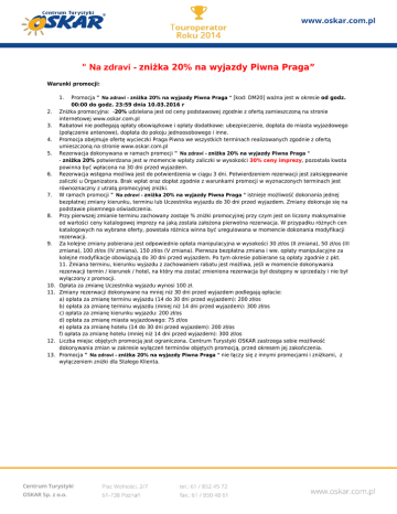 " Na zdraví - zniżka 20% na wyjazdy Piwna Praga” Warunki promocji: 1. 2. 3. 4. 5. 6. 7. 8. 9. 10. 11. 12. 13. Promocja " Na zdraví - zniżka 20% na wyjazdy Piwna Praga " [kod: DM20] ważna jest w okresie od godz. 00:00 do godz. 23:59 dnia 10.03.2016 r Zniżka promocyjna: -20% udzielana jest od ceny podstawowej zgodnie z ofertą zamieszczoną na stronie internetowej www.oskar.com.pl Rabatowi nie podlegają opłaty obowiązkowe i opłaty dodatkowe: ubezpieczenie, dopłata do miasta wyjazdowego (połączenie antenowe), dopłata do pokoju jednoosobowego i inne. Promocja obejmuje ofertę wycieczki Praga Piwna we wszystkich terminach realizowanych zgodnie z ofertą umieszczoną na stronie www.oskar.com.pl Rezerwacja dokonywana w ramach promocji " Na zdraví - zniżka 20% na wyjazdy Piwna Praga " - zniżka 20% potwierdzana jest w momencie wpłaty zaliczki w wysokości 30% ceny imprezy, pozostała kwota powinna być wpłacona na 30 dni przed wyjazdem. Rezerwacja wstępna możliwa jest do potwierdzenia w ciągu 3 dni. Potwierdzeniem rezerwacji jest zaksięgowanie zaliczki u Organizatora. Brak wpłat oraz dopłat zgodnie z warunkami promocji w wyznaczonych terminach jest równoznaczny z utratą promocyjnej zniżki. W ramach promocji " Na zdraví - zniżka 20% na wyjazdy Piwna Praga " istnieje możliwość dokonania jednej bezpłatnej zmiany kierunku, terminu lub Uczestnika wyjazdu do 30 dni przed wyjazdem. Zmiany dokonuje się na podstawie pisemnego oświadczenia. Przy pierwszej zmianie terminu zachowany zostaje % zniżki promocyjnej przy czym jest on liczony maksymalnie od wartości ceny katalogowej imprezy na jaką została założona pierwotna rezerwacja. W przypadku różnych cen katalogowych na wybrane oferty, powstała różnica winna być uregulowana w momencie dokonania modyfikacji rezerwacji. Za kolejne zmiany pobierana jest odpowiednio opłata manipulacyjna w wysokości 30 zł/os (II zmiana), 50 zł/os (III zmiana), 100 zł/os (IV zmiana), 150 zł/os (V zmiana). Pierwsza bezpłatna zmiana i ww. opłaty manipulacyjne za kolejne modyfikacje obowiązują do 30 dni przed wyjazdem. Po tym okresie pobierane są opłaty zgodnie z pkt. 11. Zmiana terminu, kierunku wyjazdu z zachowaniem rabatu jest możliwa, jeśli w momencie dokonywania rezerwacji termin / kierunek / hotel, na który ma zostać zmieniona rezerwacja był dostępny w sprzedaży i nie był wyłączony z promocji. Opłata za zmianę Uczestnika wyjazdu wynosi 100 zł. Zmiany rezerwacji dokonywane na mniej niż 30 dni przed wyjazdem podlegają opłacie: a) opłata za zmianę terminu wyjazdu (14 do 30 dni przed wyjazdem): 200 zł/os b) opłata za zmianę terminu wyjazdu (mniej niż 14 dni przed wyjazdem): 300 zł/os c) opłata za zmianę kierunku wyjazdu: 200 zł/os d) opłata za zmianę miasta wyjazdowego: 75 zł/os e) opłata za zmianę hotelu (14 do 30 dni przed wyjazdem): 200 zł/os f) opłata za zmianę hotelu (mniej niż 14 dni przed wyjazdem): 300 zł/os Liczba miejsc objętych promocją jest ograniczona. Centrum Turystyki OSKAR zastrzega sobie możliwość dokonywania zmian w zakresie wyłączeń terminów objętych promocją, przed okresem jej zakończenia. Promocja " Na zdraví - zniżka 20% na wyjazdy Piwna Praga " nie łączy się z innymi promocjami i zniżkami, z wyłączeniem zniżki dla Stałego Klienta.