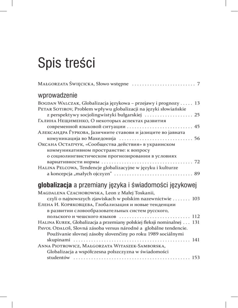 Spis treści Małgorzata Święcicka, Słowo wstępne . . . . . . . . . . . . . . . . . . . . . . . . . 7 wprowadzenie Bogdan Walczak, Globalizacja językowa – przejawy i prognozy . . . . . Petar Sotirov, Problem wpływu globalizacji na języki słowiańskie z perspektywy socjolingwistyki bułgarskiej . . . . . . . . . . . . . . . . . . . Галина Нещименко, О некоторых аспектах развития современной языковой ситуации . . . . . . . . . . . . . . . . . . . . . . . . . . Александра Ѓуркова, Јазичните ставови и јазиците во јавната комуникација во Македонија . . . . . . . . . . . . . . . . . . . . . . . . . . . . . Оксана Остапчук, «Сообщества действия» в украинском коммуникативном пространстве: к вопросу о социолингвистическом прогнозировании в условиях вариативности нормы . . . . . . . . . . . . . . . . . . . . . . . . . . . . . . . . . . . . Halina Pelcowa, Tendencje globalizacyjne w języku i kulturze a koncepcja „małych ojczyzn” . . . . . . . . . . . . . . . . . . . . . . . . . . . . . . . 13 25 45 56 72 89 globalizacja a przemiany języka i świadomości językowej Magdalena Czachorowska, Leon z Małej Toskanii, czyli o najnowszych zjawiskach w polskim nazewnictwie . . . . . . . Елена И. Коряковцева, Глобализация и новые тенденции в развитии словообразовательных систем русского, польского и чешского языков . . . . . . . . . . . . . . . . . . . . . . . . . . . . Halina Kurek, Globalizacja a przemiany polskiej fleksji nominalnej . . . Pavol Odaloš, Slovná zásoba versus národné a globálne tendencie. Používanie slovnej zásoby slovenčiny po roku 1989 sociálnymi skupinami . . . . . . . . . . . . . . . . . . . . . . . . . . . . . . . . . . . . . . . . . . . . . . Anna Piotrowicz, Małgorzata Witaszek-Samborska, Globalizacja a współczesna polszczyzna w świadomości studentów . . . . . . . . . . . . . . . . . . . . . . . . . . . . . . . . . . . . . . . . . . . . . . 103 112 131 141 153 6 Spis treści Mirosława Sagan-Bielawa, Globalizacja a społeczna świadomość językowa Polaków . . . . . . . . . . . . . . . . . . . . . . . . . . . . . . . . . . . . . . . . 169 Małgorzata Święcicka, Monika Peplińska, Stereotypy mieszkańców miast na tle ich uwarunkowań społeczno-kulturowych. Stan badań i perspektywy . . . . . . . . . . . . . . . . . . . . 182 globalizacja a przemiany odmian językowych Jagoda Bloch, Szybko, szybciej, coraz szybciej… Tempo mówienia w polskich mediach . . . . . . . . . . . . . . . . . . . . . . . . . . . . . . . . . . . . . . Violetta Jaros, MY – ONI – OBCY w języku użytkowników CB-radia . . . . . . . . . . . . . . . . . . . . . . . . . . . . . . . . . . . . . . . . . . . . . . . . Ewa Kołodziejek, Polski język urzędowy wobec zmian globalizacyjnych . . . . . . . . . . . . . . . . . . . . . . . . . . . . . . . . . . . . . . . . . Renata Kucharzyk, Leksyka gwarowa w komunikacji internetowej . . . . . . . . . . . . . . . . . . . . . . . . . . . . . . . . . . . . . . . . . . . . . Tomasz Kurdyła, Kilka refleksji o stanie gwar w Polsce południowo-wschodniej . . . . . . . . . . . . . . . . . . . . . . . . . . . . . . . . . . . Елена Глебовна Лукашанец, Глобальные тенденции и национальная специфика в развитии современного интернет-сленга (на материале русского и польского языков) . Alicja Nagórko, Język ludzi i aniołów… – potoczność wobec Sacrum . . . . . . . . . . . . . . . . . . . . . . . . . . . . . . . . . . . . . . . . . . . Bogusław Nowowiejski, Międzynarodowy charakter słownictwa sportowego . . . . . . . . . . . . . . . . . . . . . . . . . . . . . . . . . . . . . . . . . . . . . . Anna Piechnik, Słownictwo ekspresywne młodych mieszkańców wsi w świetle procesów globalizacyjnych . . . . . . . . . . . . . . . . . . . . . Elżbieta Rudnicka-Fira, Wizerunek człowieka zawarty w antroponimach przezwiskowych (wartościowanie we współczesnym socjolekcie młodzieżowym) . . . . . . . . . . . . . . . . Zofia Sawaniewska-Mochowa, Włodzimierz Moch, Języki subkultur kreatywnych a globalizacja (na przykładzie języka graficiarzy) . . . . . . . . . . . . . . . . . . . . . . . . . . . . . . . . . . . . . . . . Anna Tyrpa, Globalizacja odbita w zwierciadle obnoszonym po gościńcu . . . . . . . . . . . . . . . . . . . . . . . . . . . . . . . . . . . . . . . . . . . . . Natalia Zemlanaja, Fighter, hejter i headliner, czyli o wyrażeniach pochodzenia angielskiego we współczesnej polszczyźnie (na materiale czasopisma Polityka) . . . . . . . . . . . . . . . . . . . . . . . . . . noty o autorach 197 218 233 241 254 265 277 289 300 308 321 337 354 . . . . . . . . . . . . . . . . . . . . . . . . . . . . . . . . . . . . . . . . . . 371 Słowo wstępne Zjawisko globalizacji, którego początki historycy datują nawet na czasy imperium rzymskiego, szczególnie wyraziste stało się w XX i XXI wieku. Wraz z intensyfikacją ujednolicania się różnych obszarów życia ludzi na świecie rosło zainteresowanie badawcze wskazanym procesem. Tendencje globalizacyjne obejmują – jak już wspomniano – różnorodne sfery funkcjonowania człowieka w otaczającej go rzeczywistości, mogą zatem dotyczyć zarówno polityki, ekonomii, handlu, technologii, demografii, jak i kultury. Taka wielość wymiarów globalizacji (z dostrzeganymi jej walorami i negatywnymi cechami czy wręcz zagrożeniami) czyni z niej, co oczywiste, przedmiot interdyscyplinarnych studiów przedstawicieli wielu dyscyplin badawczych, nie tylko humanis