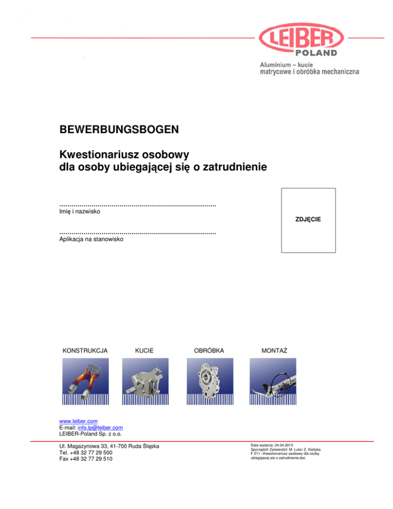 BEWERBUNGSBOGEN Kwestionariusz osobowy dla osoby ubiegającej się o zatrudnienie …………………………………………………………………… Imię i nazwisko ZDJĘCIE …………………………………………………………………… Aplikacja na stanowisko KONSTRUKCJA KUCIE OBRÓBKA MONTAś www.leiber.com E-mail: [email protected] LEIBER-Poland Sp. z o.o. Ul. Magazynowa 33, 41-700 Ruda Śląska Tel. +48 32 77 29 500 Fax +48 32 77 29 510 Data wydania: 24.04.2013 Sporządził/ Zatwierdzil: M. Luks/ Z. Kieltyka F 211 –Kwestionariusz osobowy dla osoby ubiegajacej sie o zatrudnienie.doc DANE OSOBOWE ………………………………………………. Nazwisko …………………………………..…………… Imię (Imiona) ………………………………………………. Data urodzenia …………………………..…………………… Stan cywilny / ilość dzieci na utrzymaniu ………………………………………………. Imiona rodziców ………………………………..……………… Obywatelstwo ADRES ZAMELDOWANIA …………………………………………….. Ulica …………………………………………… Kod pocztowy / Miejscowość ADRES ZAMIESZKANIA – jeśli jest inny niŜ zameldowania …………………………………………….. Ulica …………………………………………… Kod pocztowy / Miejscowość ADRES DO KORESPONDENCJI – jeśli jest inny niŜ zameldowania i zamieszkania …………………………………………….. Ulica …………………………………………… Kod pocztowy / Miejscowość …………………………………………….... Telefon …………………………………………… E-Mail WYKSZTAŁCENIE / EDUKACJA Data rozpoczęcia Data zakończenia Nazwa szkoły Zawód / Specjalność PRAKTYKI ZAWODOWE / KURSY Data rozpoczęcia Data zakończenia Nazwa instytucji Zawód wyuczony www.leiber.com E-mail: [email protected] LEIBER-Poland Sp. z o.o. Ul. Magazynowa 33, 41-700 Ruda Śląska Tel. +48 32 77 29 500 Fax +48 32 77 29 510 Data wydania: 24.04.2013 Sporządził/ Zatwierdzil: M. Luks/ Z. Kieltyka F 211 –Kwestionariusz osobowy dla osoby ubiegajacej sie o zatrudnienie.doc DOTYCHCZASOWY PRZEBIEG ZATRUDNIENIA Data Data Zakład pracy / Miejscowość rozpoczęcia zakończenia Stanowisko DODATKOWE UMIEJĘTNOŚCI Znajomość języków W mowie Bardzo dobra Dobra W piśmie Podstawowa Bardzo dobra Dobra Podstawowa Dodatkowe uprawnienia, szczególne umiejętności: ……………………………………………………………………………………………………………………… ……………………………………………………………………………………………………………………… ……………………………………………………………………………………………………………………… ……………………………………………………………………………………………………………………… www.leiber.com E-mail: [email protected] LEIBER-Poland Sp. z o.o. Ul. Magazynowa 33, 41-700 Ruda Śląska Tel. +48 32 77 29 500 Fax +48 32 77 29 510 Data wydania: 24.04.2013 Sporządził/ Zatwierdzil: M. Luks/ Z. Kieltyka F 211 –Kwestionariusz osobowy dla osoby ubiegajacej sie o zatrudnienie.doc Obecnie zatrudniony: Tak Nie Jestem: Przeciwskazania do pracy: Brak Posiadam orzeczenie o niepełnosprawności Jestem osobą: Praworęczną Leworęczną Noszę: Posiadam prawo jazdy: Kat. ……………………………..…….. Nie posiadam Okulary korekcyjne Soczewki kontaktowe Mam prawidłowy wzrok Emerytem Rencistą Posiadam uprawnienia na wózki widłowe: Tak Nie Inne ……………………………….……… Znajomość obsługi komputera: Nie Tak……………………………………… ………………………………………….…… Znajomość rysunku technicznego: Tak Nie Proszę podać wzrost w cm: wymień jakie programy ……………………………………………….. Data moŜliwego podjęcia pracy: ………………………............................................................. Oczekiwanie płacowe (brutto)…………………………………………………… ……………….. Poświadczam własnoręcznym podpisem, Ŝe podane informacje są zgodne z prawdą. Jest mi wiadome, Ŝe udzielenie nieprawdziwych informacji moŜe prowadzić do rozwiązania ewentualnej umowy o pracę. „WyraŜam zgodę na przetwarzanie moich danych osobowych zawartych w mojej ofercie pracy dla potrzeb niezbędnych do realizacji procesów rekrutacji (obecnych, jak i wszelkich przyszłych rekrutacji). Jednocześnie wyraŜam zgodę na udostępnienie mojego wizerunku od momentu ewentualnego zatrudnienia w celu publikacji w systemie kadrowo-płacowym oraz publikacji schematu organizacyjnego(zgodnie z Ustawą z dnia 29.08.1997 roku o Ochronie Danych Osobowych; tekst jednolity: Dz. U. z 2002r. Nr 101, poz. 926 ze zm.). Oświadczam, Ŝe wszelkie dane osobowe w rozumieniu ustawy o ochronie danych osobowych podałem/am dobrowolnie”. Przyjmuję do wiadomości, Ŝe przysługuje mi prawo wglądu do treści moich danych oraz ich poprawienia.” ……………….…………………………… Data i podpis Zgłosimy się do Pana / Pani w razie pozytywnego rozpatrzenia kandydatury. www.leiber.com E-mail: [email protected] LEIBER-Poland Sp. z o.o. Ul. Magazynowa 33, 41-700 Ruda Śląska Tel. +48 32 77 29 500 Fax +48 32 77 29 510 Data wydania: 24.04.2013 Sporządził/ Zatwierdzil: M. Luks/ Z. Kieltyka F 211 –Kwestionariusz osobowy dla osoby ubiegajacej sie o zatrudnienie.doc