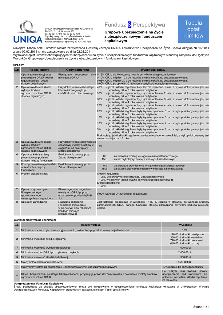 Tabela opłat i limitów Fundusz & Perspektywa UNIQA Towarzystwo Ubezpieczeń na Życie S.A. 90-520 Łódź ul. Gdańska 132 tel. 42 634 47 00, fax 42 63 77 430 Sąd Rejonowy dla Łodzi-Śródmieścia w Łodzi KRS 0000005751, NIP 554-100-15-22 Kapitał zakładowy i wpłacony 42 774 700 PLN Grupowe Ubezpieczenie na Życie z ubezpieczeniowym funduszem kapitałowym Niniejsza Tabela opłat i limitów została zatwierdzona Uchwałą Zarządu UNIQA Towarzystwo Ubezpieczeń na Życie Spółka Akcyjna Nr 16/2011 z dnia 02.02.2011 r. i ma zastosowanie od dnia 02.02.2011 r. Wysokości opłat i limitów obowiązujących w ubezpieczeniu na życie z ubezpieczeniowym funduszem kapitałowym stanowią załącznik do Ogólnych Warunków Grupowego Ubezpieczenia na życie z ubezpieczeniowymi funduszami kapitałowymi. OPŁATY L.p. 1 2 3 4 5 6 7 8 Rodzaj opłaty Opłata administracyjna za prowadzenie ORJU składek regularnych jak i ORJU składek dodatkowych Opłata likwidacyjna (koszt wykupu środków zgromadzonych na ORJU składek regularnych) Opłata likwidacyjna (koszt wykupu środków zgromadzonych na ORJU składek dodatkowych) Opłata za każdą zmianę procentowego podziału składek między funduszami Koszt przeniesienia jednostek uczestnictwa między funduszami Procent alokacji składki Opłata za ryzyko zgonu Ubezpieczonego spowodowanego nieszczęśliwym wypadkiem Opłata za zarządzanie Wysokość opłaty Kiedy pobierana Pierwszego roboczego miesiąca z ORJU dnia 0,15% ORJU do 10 rocznicy trwania certyfikatu ubezpieczeniowego, 0,10% ORJU między 10 a 20 rocznicą trwania certyfikatu ubezpieczeniowego, 0,05% ORJU między 20 a 30 rocznicą trwania certyfikatu ubezpieczeniowego, 0,00% ORJU po upływie 30 lat trwania certyfikatu ubezpieczeniowego.. Przy dokonywaniu całkowitego 40% - jeżeli składki regularne były łącznie opłacane 1 rok, a wykup dokonywany jest nie lub częściowego wykupu wcześniej niż w 2 roku trwania certyfikatu, certyfikatu ubezpieczeniowego 35% - jeżeli składki regularne były łącznie opłacane 2 lata, a wykup dokonywany jest nie wcześniej niż w 3 roku trwania certyfikatu, 30% - jeżeli składki regularne były łącznie opłacane 3 lata, a wykup dokonywany jest nie wcześniej niż w 4 roku trwania certyfikatu, 25% - jeżeli składki regularne były łącznie opłacane 4 lata, a wykup dokonywany jest nie wcześniej niż w 5 roku trwania certyfikatu, 20% - jeżeli składki regularne były łącznie opłacane 5 lat, a wykup dokonywany jest nie wcześniej niż w 6 roku trwania certyfikatu, 15% - jeżeli składki regularne były łącznie opłacane 6 lat, a wykup dokonywany jest nie wcześniej niż w 7 roku trwania certyfikatu, 10% - jeżeli składki regularne były łącznie opłacane 7 lat, a wykup dokonywany jest nie wcześniej niż w 8 roku trwania certyfikatu, 5% - jeżeli składki regularne były łącznie opłacane 8 lat; a wykup dokonywany jest nie wcześniej niż w 9 roku trwania certyfikatu, Brak opłaty, jeżeli składki regularne były łącznie płacone przez 9 lat, a wykup dokonywany jest nie wcześniej niż w 10 roku . Przy dokonywaniu całkowitej lub częściowej wypłaty środków w 2% ciągu 2 lat od dnia wpłaty składki dodatkowej Po dokonaniu zmiany przez 0 zł - za pierwszą zmianę w ciągu miesiąca kalendarzowego Zakład Ubezpieczeń 15 zł - za każdą kolejną zmianę w miesiącu kalendarzowym Po dokonaniu zmiany przez Zakład Ubezpieczeń 0 zł 15 zł - za pierwsze przeniesienie w ciągu miesiąca kalendarzowego - za każde kolejne przeniesienie w miesiąca kalendarzowego Składki regularne: 95% w pierwszym roku certyfikatu ubezpieczeniowego 100% w kolejnych latach trwania certyfikatu ubezpieczeniowego Składki dodatkowe: 100% Pierwszego roboczego dnia miesiąca z ORJU poprzez umorzenie odpowiedniej ilości JU Naliczana codziennie i pobierana miesięcznie w pierwszym dniu roboczym każdego miesiąca kalendarzowego 0,02% wartości ORJU składek regularnych Jest ustalana procentowo w wysokości 1,80 % rocznie w stosunku do wartości środków zgromadzonych ORJU danego funduszu, którego zarządzanie aktywami podlega niniejszej opłacie. Wartości maksymalne i minimalne Rodzaj wartości L.p. 1 Wysokość Minimalny procent części inwestycyjnej składki, jaki może być przekazywany na jeden fundusz 10% 120,00 zł 360,00 zł 720,00 zł 1 440,00 zł składki miesięcznej składki kwartalnej, składki półrocznej, składki rocznej. 2 Minimalna wysokość składki regularnej 3 Minimalna wysokość wykupu częściowego 1 000,00 zł 4 Minimalna wartość ORJU po częściowym wykupie 2 000,00 zł 5 Minimalna wysokość składki dodatkowej 6 Maksymalna opłata administracyjna 7 Maksymalny opłata za zarządzanie Ubezpieczeniowymi Funduszami Kapitałowymi 10% rocznie dla każdego funduszu 8 Okres ubezpieczenia, po którym Ubezpieczonemu przysługuje prawo złożenia wniosku o dokonanie wypłaty środków zgromadzonych na ORJU Po 1-szym roku trwania umowy ubezpieczenia pod warunkiem, że opłacono wszystkie składki regularne za ten okres 300,00 zł 0,45% ORJU Ubezpieczeniowe Fundusze Kapitałowe Środki pochodzące ze składek ubezpieczeniowych mogą być inwestowane w ubezpieczeniowe fundusze kapitałowe wskazane w Uniwersalnym Wykazie Ubezpieczeniowych Funduszy Kapitałowych stanowiącym załącznik niniejszej Tabeli opłat i limitów. Strona 1 z 1