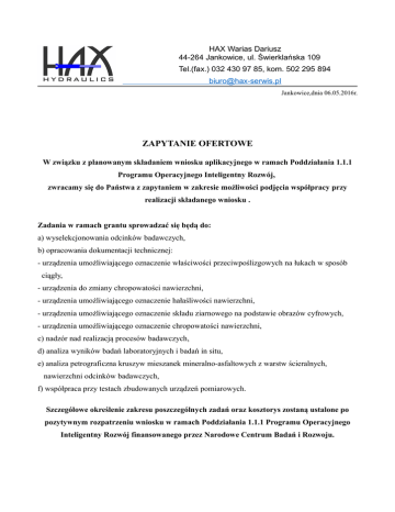 HAX Warias Dariusz 44-264 Jankowice, ul. Świerklańska 109 Tel.(fax.) 032 430 97 85, kom. 502 295 894 [email protected] Jankowice,dnia 06.05.2016r. ZAPYTANIE OFERTOWE W związku z planowanym składaniem wniosku aplikacyjnego w ramach Poddziałania 1.1.1 Programu Operacyjnego Inteligentny Rozwój, zwracamy się do Państwa z zapytaniem w zakresie możliwości podjęcia współpracy przy realizacji składanego wniosku . Zadania w ramach grantu sprowadzać się będą do: a) wyselekcjonowania odcinków badawczych, b) opracowania dokumentacji technicznej: - urządzenia umożliwiającego oznaczenie właściwości przeciwpoślizgowych na łukach w sposób ciągły, - urządzenia do zmiany chropowatości nawierzchni, - urządzenia umożliwiającego oznaczenie hałaśliwości nawierzchni, - urządzenia umożliwiającego oznaczenie składu ziarnowego na podstawie obrazów cyfrowych, - urządzenia umożliwiającego oznaczenie chropowatości nawierzchni, c) nadzór nad realizacją procesów badawczych, d) analiza wyników badań laboratoryjnych i badań in situ, e) analiza petrograficzna kruszyw mieszanek mineralno-asfaltowych z warstw ścieralnych, nawierzchni odcinków badawczych, f) współpraca przy testach zbudowanych urządzeń pomiarowych. Szczegółowe określenie zakresu poszczególnych zadań oraz kosztorys zostaną ustalone po pozytywnym rozpatrzeniu wniosku w ramach Poddziałania 1.1.1 Programu Operacyjnego Inteligentny Rozwój finansowanego przez Narodowe Centrum Badań i Rozwoju. INFORMACJE DLA OFERENTÓW Nazwa i adres pytającego HAX WARIAS DARIUSZ ul. Świerklańska 109 44-264 Jankowice NIP 642-19-23-449, REGON 273890752 Tel.(fax.) 032 430 97 85, kom. 502 295 894 e-mail: [email protected] Osoba kontaktowa Tomasz Moralewski HAX WARIAS DARIUSZ ul. Świerklańska 109 44-264 Jankowice tel. 48 533 909 209 e-mail: [email protected] Miejsce oraz termin składania oświadczeń ofertowych: Oferty na piśmie należy kierować na adres: HAX WARIAS DARIUSZ ul. Świerklańska 109 44-264 Jankowice , Lub Za pomocą poczty elektronicznej e-mail na adres: e-mail: [email protected] Termin składania oświadczeń ofertowych do 20.05.2015 r. Oferty złożone po terminie nie będą rozpatrywane.