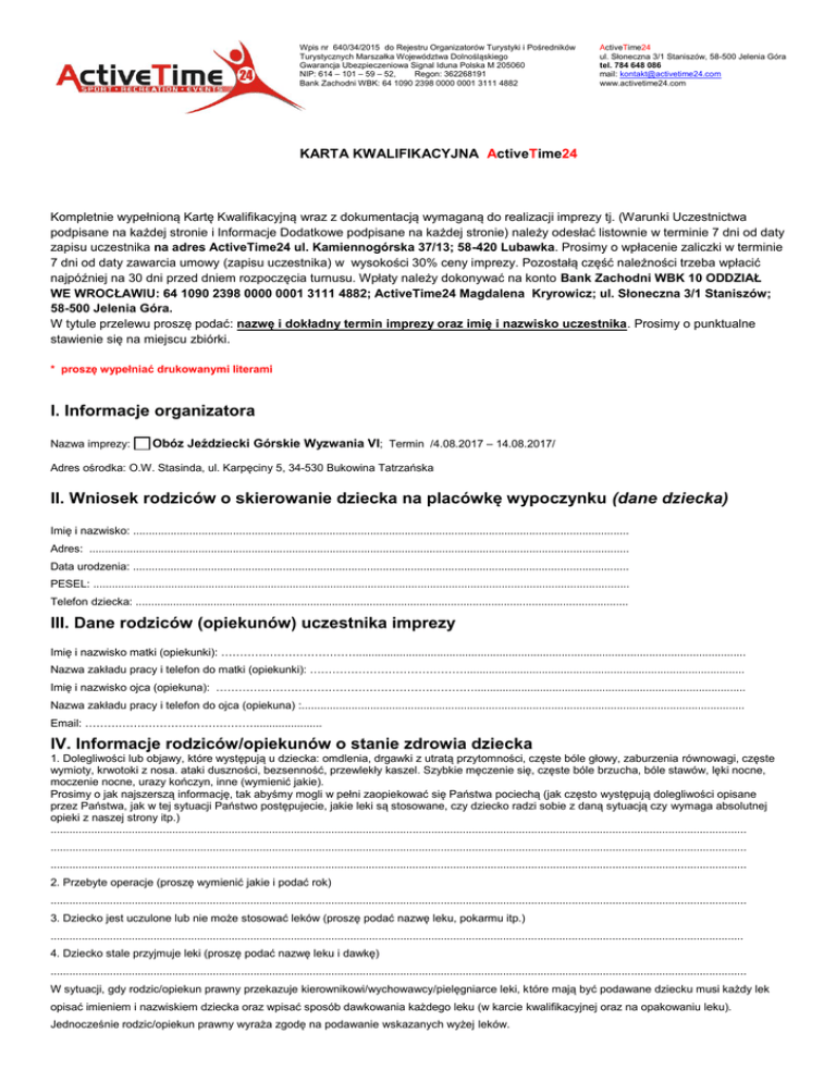Wpis nr 640/34/2015 do Rejestru Organizatorów Turystyki i Pośredników Turystycznych Marszałka Województwa Dolnośląskiego Gwarancja Ubezpieczeniowa Signal Iduna Polska M 205060 NIP: 614 – 101 – 59 – 52, Regon: 362268191 Bank Zachodni WBK: 64 1090 2398 0000 0001 3111 4882 ActiveTime24 ul. Słoneczna 3/1 Staniszów, 58-500 Jelenia Góra tel. 784 648 086 mail: [email protected] www.activetime24.com KARTA KWALIFIKACYJNA ActiveTime24 Kompletnie wypełnioną Kartę Kwalifikacyjną wraz z dokumentacją wymaganą do realizacji imprezy tj. (Warunki Uczestnictwa podpisane na każdej stronie i Informacje Dodatkowe podpisane na każdej stronie) należy odesłać listownie w terminie 7 dni od daty zapisu uczestnika na adres ActiveTime24 ul. Kamiennogórska 37/13; 58-420 Lubawka. Prosimy o wpłacenie zaliczki w terminie 7 dni od daty zawarcia umowy (zapisu uczestnika) w wysokości 30% ceny imprezy. Pozostałą część należności trzeba wpłacić najpóźniej na 30 dni przed dniem rozpoczęcia turnusu. Wpłaty należy dokonywać na konto Bank Zachodni WBK 10 ODDZIAŁ WE WROCŁAWIU: 64 1090 2398 0000 0001 3111 4882; ActiveTime24 Magdalena Kryrowicz; ul. Słoneczna 3/1 Staniszów; 58-500 Jelenia Góra. W tytule przelewu proszę podać: nazwę i dokładny termin imprezy oraz imię i nazwisko uczestnika. Prosimy o punktualne stawienie się na miejscu zbiórki. * proszę wypełniać drukowanymi literami I. Informacje organizatora Nazwa imprezy: Obóz Jeździecki Górskie Wyzwania VI; Termin /4.08.2017 – 14.08.2017/ Adres ośrodka: O.W. Stasinda, ul. Karpęciny 5, 34-530 Bukowina Tatrzańska II. Wniosek rodziców o skierowanie dziecka na placówkę wypoczynku (dane dziecka) Imię i nazwisko: ............................................................................................................................................................... Adres: ............................................................................................................................................................................. Data urodzenia: ............................................................................................................................................................... PESEL: ............................................................................................................................................................................ Telefon dziecka: .............................................................................................................................................................. III. Dane rodziców (opiekunów) uczestnika imprezy Imię i nazwisko matki (opiekunki): ………………………………............................................................................................................................. Nazwa zakładu pracy i telefon do matki (opiekunki): ……………………………………......................................................................................... Imię i nazwisko ojca (opiekuna): ……………………………………………………………....................................................................................... Nazwa zakładu pracy i telefon do ojca (opiekuna) :.............................................................................................................................................. Email: ………………………………………...................... IV. Informacje rodziców/opiekunów o stanie zdrowia dziecka 1. Dolegliwości lub objawy, które występują u dziecka: omdlenia, drgawki z utratą przytomności, częste bóle głowy, zaburzenia równowagi, częste wymioty, krwotoki z nosa. ataki duszności, bezsenność, przewlekły kaszel. Szybkie męczenie się, częste bóle brzucha, bóle stawów, lęki nocne, moczenie nocne, urazy kończyn, inne (wymienić jakie). Prosimy o jak najszerszą informację, tak abyśmy mogli w pełni zaopiekować się Państwa pociechą (jak często występują dolegliwości opisane przez Państwa, jak w tej sytuacji Państwo postępujecie, jakie leki są stosowane, czy dziecko radzi sobie z daną sytuacją czy wymaga absolutnej opieki z naszej strony itp.) ............................................................................................................................................................................................................................... ............................................................................................................................................................................................................................... ............................................................................................................................................................................................................................... 2. Przebyte operacje (proszę wymienić jakie i podać rok) ............................................................................................................................................................................................................................... 3. Dziecko jest uczulone lub nie może stosować leków (proszę podać nazwę leku, pokarmu itp.) .............................................................................................................................................................................................................................. 4. Dziecko stale przyjmuje leki (proszę podać nazwę leku i dawkę) ............................................................................................................................................................................................................................... W sytuacji, gdy rodzic/opiekun prawny przekazuje kierownikowi/wychowawcy/pielęgniarce leki, które mają być podawane dziecku musi każdy lek opisać imieniem i nazwiskiem dziecka oraz wpi