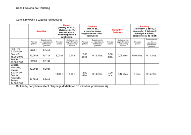 Cennik wstępu do H2Ostróg Cennik pływalni z częścią rekreacyjną Normalny Pon. - Pt. 6.00-15.00 Pon. - Pt. 15.00-20.00 Pon.-Pt. 20.00-22.00 Sobota, Niedziela, Święta 6.00-14.00 Sobota, Niedziela, Święta 14.00-22.00 Pierwsza godzina Dopłata za min. po przekroczeniu podstawowej jednostki 8,00 zł 0,14 zł 10,00 zł 0,17 zł 8,00 zł 0,14 zł 12,00 zł 0,20 zł 14,00 zł Ulgowy (szkolny do 19 rż., student, emeryt, rencista, osoba niepełnosprawna z opiekunem) Grupowy (min. 15 os., wycieczka, grupa zorganizowana z listą i opiekunem) Senior 60 + Rodzina + Rodzinny (1 dorosły + 2 dzieci, 2 dorosłych + 1 dziecko, 2 dorosłych + 2 dzieci, dzieci w wieku do 19 lat) Pierwsza godzina Dopłata za min. po przekroczeniu podstawowej jednostki Pierwsza godzina Dopłata za min. po przekroczeniu podstawowej jednostki Pierwsza godzina Dopłata za min. po przekroczeniu podstawowej jednostki Pierwsza godzina Dopłata za min. po przekroczeniu podstawowej jednostki 8,00 zł 0,14 zł 7,00 zł/os. 0,12 zł/os. 5,00 zł/os. 0,09 zł/os. 6,50 zł/os. 0,11 zł/os. 10,00 zł 0,17 zł 8,00 zł/os. 0,14 zł/os. 7,00 zł/os. 0,12 zł/os. 9 zł/os. 0,15 zł/os. 0,24 zł Do każdej ceny biletu klient otrzymuje dodatkowo 10 minut na przebranie się. Cennik pływalni z częścią rekreacyjną oraz dostępem do SPA Normalny Pon. - Pt. 6.00-15.00 Pon. - Pt. 15.00-20.00 Pon.-Pt. 20.00-22.00 Sobota, Niedziela, Święta 6.00-14.00 Sobota, Niedziela, Święta 14.00-22.00 Pierwsza godzina Dopłata za min. po przekroczeniu podstawowej jednostki 10,00 zł 0,17 zł 12,00 zł 0,20 zł 10,00 zł 0,17 zł 14,50 zł 0,25 zł 17,00 zł Ulgowy (szkolny do 19 rż., student, emeryt, rencista, osoba niepełnosprawna z opiekunem) Grupowy (min. 15 os., wycieczka, grupa zorganizowana z listą i opiekunem) Senior + Rodzina + Rodzinny (1 dorosły + 2 dzieci, 2 dorosłych + 1 dziecko, 2 dorosłych + 2 dzieci, dzieci w wieku do 19 lat) Pierwsza godzina Dopłata za min. po przekroczeniu podstawowej jednostki Pierwsza godzina Dopłata za min. po przekroczeniu podstawowej jednostki Pierwsza godzina Dopłata za min. po przekroczeniu podstawowej jednostki Pierwsza godzina Dopłata za min. po przekroczeniu podstawowej jednostki 10,00 zł 0,17 zł 8,50 zł/os. 0,15 zł/os. 6,00 zł/os. 0,10 zł/os. 8,00 zł/os. 0,14 zł/os. 12,00 zł 0,20 zł 10,00 zł/os. 0,17 zł/os. 8,50 zł/os. 0,15 zł/os. 11,00zł/os. 0,19 zł/os. 0,29 zł Do każdej ceny biletu klient otrzymuje dodatkowo 10 minut na przebranie się. PROMOCJE: 1. Dzieci do lat 3: 1zł/h 2. Bilety wielogodzinne (dla jednej osoby) Cennik pływalni z częścią rekreacyjną Bilet wstępu Poniedziałek - Piątek Normalny (2h) 6.00-22.00 Normalny (3h) Pierwsze 2 godziny Dopłata za min. po przekroczeniu podstawowej jednostki Pierwsze 3 godziny Dopłata za min. po przekroczeniu podstawowej jednostki 17,00 zł 0,15 zł 20,00 zł 0,12 zł Normalny (cały dzień) 30,00 zł Ulgowy (2h) Ulgowy (3h) Pierwsze 2 godziny Dopłata za min. po przekroczeniu podstawowej jednostki Pierwsze 3 godziny Dopłata za min. po przekroczeniu podstawowej jednostki 14,00 zł 0,12 zł 16,00 zł 0,09 zł Ulgowy (cały dzień) 24,00 zł Sobota, Niedziela, Święta Bilet wstępu Normalny (2h) 6.00-22.00 Pierwsze 2 godziny Dopłata za min. po przekroczeniu podstawowej jednostki 24,00 zł 0,2 zł Normalny (3 h) Ulgowy (2h) Pierwsze 3 godziny Dopłata za min. po przekroczeniu podstawowej jednostki Normalny (cały dzień) 28,00 zł 0,16 zł 42,00 zł Ulgowy (3h) Pierwsze 2 godziny Dopłata za min. po przekroczeniu podstawowej jednostki Pierwsze 3 godziny Dopłata za min. po przekroczeniu podstawowej jednostki Ulgowy (cały dzień) 17,00 zł 0,15 zł 20,00 zł 0,12 zł 30,00 zł Cennik pływalni z częścią rekreacyjną oraz dostępem do SPA Bilet wstępu Poniedziałek - Piątek Normalny (2h) 6.00-22.00 Normalny (3h) Pierwsze 2 godziny Dopłata za min. po przekroczeniu podstawowej jednostki Pierwsze 3 godziny Dopłata za min. po przekroczeniu podstawowej jednostki 20,00 zł 0,17 zł 24,00 zł 0,14 zł Normalny (cały dzień) 36,00 zł Ulgowy (2h) Ulgowy (3h) Pierwsze 2 godziny Dopłata za min. po przekroczeniu podstawowej jednostki Pierwsze 3 godziny Dopłata za min. po przekroczeniu podstawowej jednostki 17,00 zł 0,15 zł 19,00 zł 0,11 zł Ulgowy (cały dzień) 29,00 zł Sobota, Niedziela, Święta Bilet wstępu Normalny (2h) 6.00-22.00 Normalny (3 h) Ulgowy (2h) Pierwsze 2 godziny Dopłata za min. po przekroczeniu podstawowej jednostki Pierwsze 3 godziny Dopłata za min. po przekroczeniu podstawowej jednostki Normalny (cały dzień) 29,00 zł 0,25 zł 34,00 zł 0,19 zł 50,00 zł Ulgowy (3h) Pierwsze 2 godziny Dopłata za min. po przekroczeniu podstawowej jednostki Pierwsze 3 godziny Dopłata za min. po przekroczeniu podstawowej jednostki Ulgowy (cały dzień) 20,00 zł 0,17 zł 24,00 zł 0,14 zł 36,00 zł 3. Bilety wielogodzinne rodzinne: (1+2, 2+1 oraz 2+2): Cennik pływalni z częścią rekreacyjną (białe tło) oraz z częścią rekreacyjną i dostępem do SPA (szare tło) Bilet wstępu Poniedziałek - Piątek Rodzinny (2h) 6.00-22.00 Rodzinny (3 h) Pierwsze 2 godziny Dopłata za min. po przekroczeniu podstawowej jednostki Pierwsze 3 godziny Dopłata za min. po przekroczeniu podstawowej jednostki 11,00 zł/os. 0,09 zł/os. 13,00 zł/os 0,07 zł/os. 20,00 zł/os. Rodzinny (2h) Rodzinny (3h) Pierwsze 2 godziny Dopłata za min. po przekroczeniu podstawowej jednostki Pierwsze 3 godziny Dopłata za min. po przekroczeniu podstawowej jednostki 13,00 zł/os 0,11 zł/os. 16,00 zł/os. 0,09 zł/os. Rodzinny (cały dzień) 24,00 zł/os. Sobota, Niedziela, Święta Bilet wstępu Rodzinny (2 h) 6.00-22.00 Rodzinny (cały dzień) Rodzinny (3 h) Pierwsze 2 godziny Dopłata za min. po przekroczeniu podstawowej jednostki Pierwsze 3 godziny Dopłata za min. po przekroczeniu podstawowej jednostki 15,00 zł/os. 0,13 zł/os. 18,00 zł/os 0,10 zł/os. Karnety Wartość Rabat Cena zakupu Ważność karnetu 50zł 10% 45 zł 1 miesiąc 1