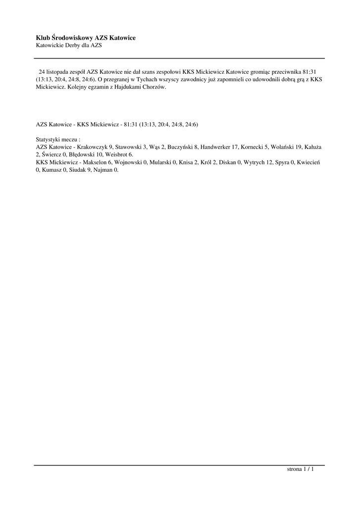 Klub Środowiskowy AZS Katowice Katowickie Derby dla AZS 24 listopada zespół AZS Katowice nie dał szans zespołowi KKS Mickiewicz Katowice gromiąc przeciwnika 81:31 (13:13, 20:4, 24:8, 24:6). O przegranej w Tychach wszyscy zawodnicy już zapomnieli co udowodnili dobrą grą z KKS Mickiewicz. Kolejny egzamin z Hajdukami Chorzów. AZS Katowice - KKS Mickiewicz - 81:31 (13:13, 20:4, 24:8, 24:6) Statystyki meczu : AZS Katowice - Krakowczyk 9, Stawowski 3, Wąs 2, Buczyński 8, Handwerker 17, Kornecki 5, Wolański 19, Kałuża 2, Świercz 0, Błędowski 10, Weisbrot 6. KKS Mickiewicz - Makselon 6, Wojnowski 0, Mularski 0, Knisa 2, Król 2, Diskan 0, Wytrych 12, Spyra 0, Kwiecień 0, Kumasz 0, Siudak 9, Najman 0. strona 1 / 1