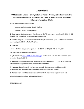 Zapowiedź V Mistrzostw Miasta i Gminy Sztum w Nordic Walking o Puchar Burmistrza Miasta i Gminy Sztum w ramach Dni Ziemi Sztumskiej -Park Miejski w Sztumie 10 września 2016 r. 1. Cel – uczczenie 600-lecia Sztumu - popularyzacja Marszów Nordic Walking - promocja Miasta i Gminy Sztum 2. Organizator: Lekkoatletyczny Klub Sportowy ZATYR Sztum przy współudziale SCK, PZ LZS Gdańsk, ZSZ Barlewiczki oraz pozostałych partnerów 3. Termin i miejsce – 10 września 2016 Park Miejski w Sztumie, godz. 13.00, biuro zawodów czynne od godz. 11.30 w Parku Miejskim 4. Program: - 5 km kobiet i mężczyzn z kategoriami – do 13 lat, 14-19 l; 20-40l; 41-60 l; 60 + - 3,5 rajd Nordic Walking /rekreacyjnie/ 5. Zgłoszenia : na www.elektronicznezapisy.pl , telefonicznie 608 038 472 oraz na miejscu zawodów do godz. 12.45. 6. Wpisowe: mieszkańcy Miasta i Gminy Sztum oraz członkowie LKS ZANTYR Sztum biorą udział bezpłatnie, pozostali 10 zł płatne w dniu zawodów 7. Nagrody: dla najlepszych puchary oraz nagrody do losowania wśród wszystkich uczestników, dla wszystkich uczestników posiłek regeneracyjny i woda. 8. Wszyscy biorą udział bez przeciwskazań lekarskich, na własną odpowiedzialność. Więcej informacji wkrótce, telefon 608 038 472 ORGANIZATORZY