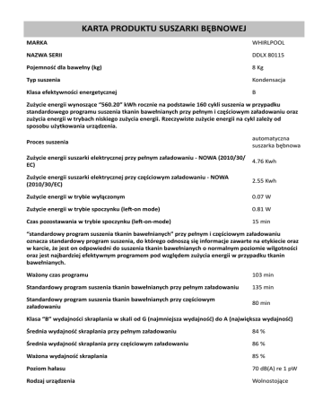 KARTA PRODUKTU SUSZARKI BĘBNOWEJ MARKA WHIRLPOOL NAZWA SERII DDLX 80115 Pojemność dla bawełny (kg) 8 Kg Typ suszenia Kondensacja Klasa efektywności energetycznej B Zużycie energii wynoszące “560.20” kWh rocznie na podstawie 160 cykli suszenia w przypadku standardowego programu suszenia tkanin bawełnianych przy pełnym i częściowym załadowaniu oraz zużycia energii w trybach niskiego zużycia energii. Rzeczywiste zużycie energii na cykl zależy od sposobu użytkowania urządzenia. Proces suszenia automatyczna suszarka bębnowa Zużycie energii suszarki elektrycznej przy pełnym załadowaniu - NOWA (2010/30/ EC) 4.76 Kwh Zużycie energii suszarki elektrycznej przy częściowym załadowaniu - NOWA (2010/30/EC) 2.55 Kwh Zużycie energii w trybie wyłączonym 0.07 W Zużycie energii w trybie spoczynku (left-on mode) 0.81 W Czas pozostawania w trybie spoczynku (left-on-mode) 15 min “standardowy program suszenia tkanin bawełnianych” przy pełnym i częściowym załadowaniu oznacza standardowy program suszenia, do którego odnoszą się informacje zawarte na etykiecie oraz w karcie, że jest on odpowiedni do suszenia tkanin bawełnianych o normalnym poziomie wilgotności oraz jest najbardziej efektywnym programem pod względem zużycia energii w przypadku tkanin bawełnianych. Ważony czas programu 103 min Standardowy program suszenia tkanin bawełnianych przy pełnym załadowaniu 135 min Standardowy program suszenia tkanin bawełnianych przy częściowym załadowaniu 80 min Klasa “B” wydajności skraplania w skali od G (najmniejsza wydajność) do A (największa wydajność) Średnia wydajność skraplania przy pełnym załadowaniu 84 % Średnia wydajność skraplania przy częściowym załadowaniu 86 % Ważona wydajność skraplania 85 % Poziom hałasu 70 dB(A) re 1 pW Rodzaj urządzenia Wolnostojące