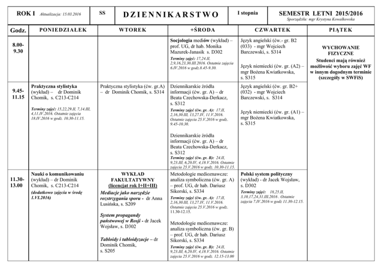 ROK I Godz. Aktualizacja: 15.03.2016 PONIEDZIAŁEK SS DZIENNIKARSTWO WTOREK +ŚRODA Socjologia mediów (wykład) – prof. UG, dr hab. Monika Mazurek-Janasik s. D302 8.009.30 Terminy zajęć: 17,24.II, 2,9,16,23,30.III.2016. Ostatnie zajęcia 6.IV.2016 w godz.8.45-9.30. 9.4511.15 Praktyczna stylistyka (wykład) – dr Dominik Chomik, s. C213-C214 Praktyczna stylistyka (ćw. gr.A) – dr Dominik Chomik, s. S314 Terminy zajęć: 15,22,29.II, 7,14.III, 4,11.IV.2016. Ostatnie zajęcia 18.IV.2016 w godz. 10.30-11.15. I stopnia SEMESTR LETNI 2015/2016 Sporządziła: mgr Krystyna Kowalkowska CZWARTEK Język angielski (ćw.- gr. B2 (033) - mgr Wojciech Barczewski, s. S314 Język niemiecki (ćw. gr. (A2) – mgr Bożena Kwiatkowska, s. S315 Dziennikarskie źródła informacji (ćw. gr. A) – dr Beata Czechowska-Derkacz, s. S312 Język angielski (ćw. gr. B2+ (032) - mgr Wojciech Barczewski, s. S314 Terminy zajęć (ćw. gr. A): 17.II, 2,16,30.III, 13,27.IV, 11.V.2016. Ostatnie zajęcia 25.V.2016 w godz. 9.45-10.30. Język niemiecki (ćw. gr. (A1) – mgr Bożena Kwiatkowska, s. S315 Dziennikarskie źródła informacji (ćw. gr. A) – dr Beata Czechowska-Derkacz, s. S312 Terminy zajęć (ćw. gr. B): 24.II, 9,23.III, 6,20.IV, 4,18.V.2016. Ostatnie zajęcia 25.V.2016 w godz. 10.30-11.15. 11.3013.00 Nauki o komunikowaniu (wykład) – dr Dominik Chomik, s. C213-C214 (dodatkowo zajęcia w środę 1.VI.2016) WYKŁAD FAKULTATYWNY (licencjat rok I+II+III) Mediacje jako narzędzie rozstrzygania sporu - dr Anna Lusińska, s. S209 System propagandy państwowej w Rosji - dr Jacek Wojsław, s. D302 Tabloidy i tabloidyzacje – dr Dominik Chomik, s. S205 Metodologie medioznawcze: analiza symboliczna (ćw. gr. A) – prof. UG, dr hab. Dariusz Sikorski, s. S334 Terminy zajęć (ćw. gr. A): 17.II, 2,16,30.III, 13,27.IV, 11.V.2016. Ostatnie zajęcia 25.V.2016 w godz. 11.30-12.15. Metodologie medioznawcze: analiza symboliczna (ćw. gr. B) – prof. UG, dr hab. Dariusz Sikorski, s. S334 Terminy zajęć (ćw. gr. B): 24.II, 9,23.III, 6,20.IV, 4,18.V.2016. Ostatnie zajęcia 25.V.2016 w godz. 12.15-13.00 Polski system polityczny (wykład) - dr Jacek Wojsław, s. D302 Terminy zajęć: 18,25.II, 3,10,17,24,31.III.2016 . Ostatnie zajęcia 7.IV.2016 w godz 11.30-12.15. PIĄTEK WYCHOWANIE FIZYCZNE Studenci mają również możliwość wyboru zajęć WF w innym dogodnym terminie (szczegóły w SWFiS) ---------------------------------------- Nauki o komunikowaniu (wykład) – dr Dominik Chomik, s. C211-C212 (Termin zajęć: tylko 1.VI.2016) 13.1514.45 Pracownia prasowa (ćw. gr. A) – prof. UG, dr hab. Józef Majewski, s. S312 Warsztaty dziennikarskie: Warsztat języka reklamy (gr. B) – dr Anna RyłkoKurpiewska, s. S460 (dodatkowo zajęcia gr. A i B w środę 1.VI.2016) Nauki o komunikowaniu (ćw. gr. A) – dr Dominik Chomik, s. S312 Terminy zajęć (gr. A): 16.II, 1,15.III, 5,19.IV, 10,24.V.2016. Ostatnie zajęcia 7.VI.2016 w godz 13.15-14.00. Nauki o komunikowaniu (ćw. gr. B) – dr Dominik Chomik, s. S312 Terminy zajęć (gr. B): 23.II, 8,22.III, 12,26.IV, 17,31.V.2016 Ostatnie zajęcia 7.VI.2016 w godz 14.00-14.45. Socjologia mediów (ćw. gr. A) – dr Michalina Rutka, s. S312 Terminy zajęć (ćw. gr. A): 17.II, 2,16,30.III, 13,27.IV, 11.V.2016. Ostatnie zajęcia 25.V.2016 w godz. 13.15-14.00. Polski system polityczny (ćw. gr. B) - dr Jacek Wojsław, s. D302 Terminy zajęć (gr. B): 18,25.II, 3,10,17,24,31.III.2016 . Ostatnie zajęcia 7.IV.2016 w godz.13.15-14.00. Socjologia mediów (ćw. gr. B) – dr Michalina Rutka, s. S312 Terminy zajęć (ćw. gr. B): 24.II, 9,23.III, 6,20.IV, 4,18.V.2016. Ostatnie zajęcia 25.V.2016 w godz. 14.00-14.45. ------------------------------------------- Pracownia prasowa (ćw. gr. A) – prof. UG, dr hab. Józef Majewski, s. S312 Warsztaty dziennikarskie: Warsztat języka reklamy (gr. B) – dr Anna RyłkoKurpiewska, s. S460 (Termin zajęć gr. A i B: tylko 1.VI.2016) 15.0016.30 Pracownia prasowa (ćw. gr. B – prof. UG, dr hab. Józef Majewski, s. S312 Warsztaty dziennikarskie: Warsztat języka reklamy (gr. A) – dr Anna RyłkoKurpiewska, s. S460 (dodatkowo zajęcia gr. A i B w środę 1.VI.2016) Praktyczna stylistyka (ćw. gr.B) – dr Dominik Chomik, s. S312 Metodologie medioznawcze: analiza obrazu (ćw. gr. A) – mgr Aleksandra Żukowska, s. C211-C212 Terminy zajęć (gr. A): 16.II, 1,15.III, 5,19.IV, 10,24.V.2016. Ostatnie zajęcia 7.VI.2016 w godz 15.45-16.30. Pracownia prasowa (ćw. gr. B – prof. UG, dr hab. Józef Majewski, s. S312 Warsztaty dziennikarskie: Warsztat języka reklamy (gr. A) – dr Anna RyłkoKurpiewska, s. S460 (Termin zajęć gr. A i B: tylko 1.VI.2016) Polski system polityczny (ćw. gr. A) - dr Jacek Wojsław, s. D302 Terminy zajęć (gr. A): 18,25.II, 3,10,17,24,31.III.2016 . Ostatnie zajęcia 7.IV.2016 w godz. 14.15-15.00. 16.4518.15 Metodologie medioznawcze: analiza obrazu (ćw. gr. B) – mgr Aleksandra Żukowska, s. C211-C212 Terminy zajęć (gr. B): 23.II, 8,22.III, 12,26.IV, 17,31.V.2016 Ostatnie zajęcia 7.VI.2016 w godz.16.45-17.30. 18.3020.00 + Środowe zajęcia kończą się 25 maja 2016r. W środę 01.06.206 są realizowane zajęcia dydaktyczne przypadające w dniu 21.03.2016 (poniedziałek).