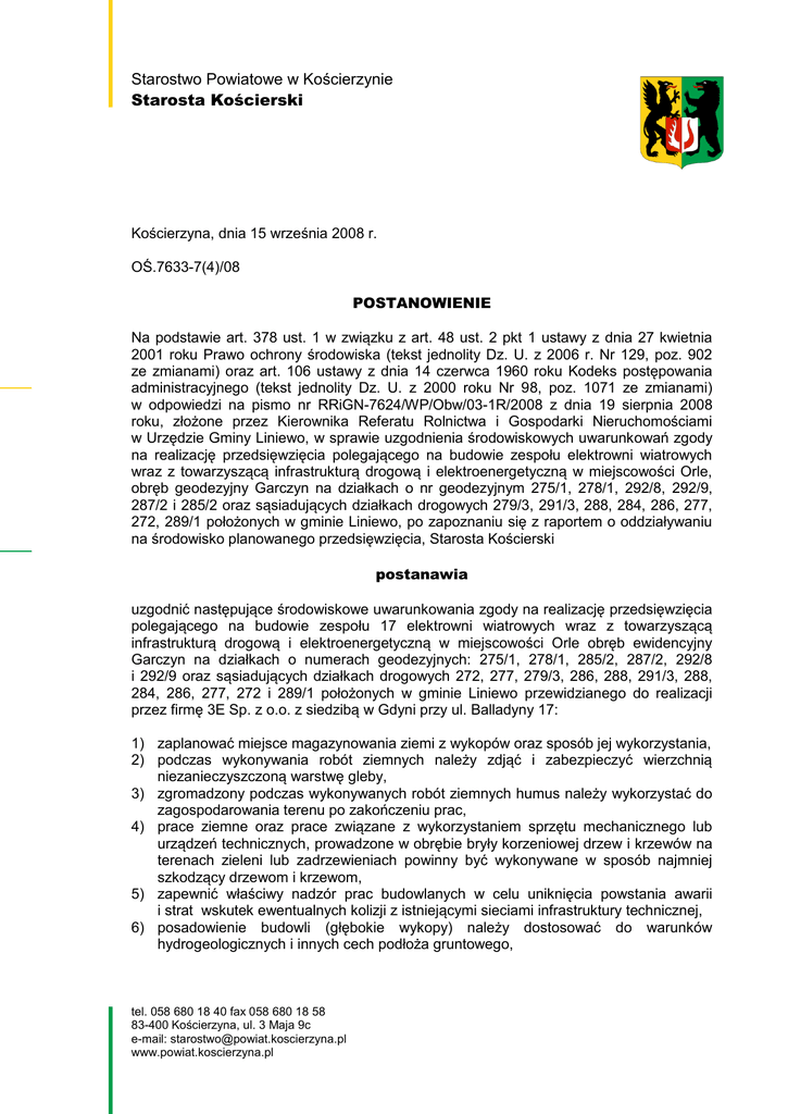 Starostwo Powiatowe w Kościerzynie Starosta Kościerski Kościerzyna, dnia 15 września 2008 r. OŚ.7633-7(4)/08 POSTANOWIENIE Na podstawie art. 378 ust. 1 w związku z art. 48 ust. 2 pkt 1 ustawy z dnia 27 kwietnia 2001 roku Prawo ochrony środowiska (tekst jednolity Dz. U. z 2006 r. Nr 129, poz. 902 ze zmianami) oraz art. 106 ustawy z dnia 14 czerwca 1960 roku Kodeks postępowania administracyjnego (tekst jednolity Dz. U. z 2000 roku Nr 98, poz. 1071 ze zmianami) w odpowiedzi na pismo nr RRiGN-7624/WP/Obw/03-1R/2008 z dnia 19 sierpnia 2008 roku, złożone przez Kierownika Referatu Rolnictwa i Gospodarki Nieruchomościami w Urzędzie Gminy Liniewo, w sprawie uzgodnienia środowiskowych uwarunkowań zgody na realizację przedsięwzięcia polegającego na budowie zespołu elektrowni wiatrowych wraz z towarzyszącą infrastrukturą drogową i elektroenergetyczną w miejscowości Orle, obręb geodezyjny Garczyn na działkach o nr geodezyjnym 275/1, 278/1, 292/8, 292/9, 287/2 i 285/2 oraz sąsiadujących działkach drogowych 279/3, 291/3, 288, 284, 286, 277, 272, 289/1 położonych w gminie Liniewo, po zapoznaniu się z raportem o oddziaływaniu na środowisko planowanego przedsięwzięcia, Starosta Kościerski postanawia uzgodnić następujące środowiskowe uwarunkowania zgody na realizację przedsięwzięcia polegającego na budowie zespołu 17 elektrowni wiatrowych wraz z towarzyszącą infrastrukturą drogową i elektroenergetyczną w miejscowości Orle obręb ewidencyjny Garczyn na działkach o numerach geodezyjnych: 275/1, 278/1, 285/2, 287/2, 292/8 i 292/9 oraz sąsiadujących działkach drogowych 272, 277, 279/3, 286, 288, 291/3, 288, 284, 286, 277, 272 i 289/1 położonych w gminie Liniewo przewidzianego do realizacji przez firmę 3E Sp. z o.o. z siedzibą w Gdyni przy ul. Balladyny 17: 1) zaplanować miejsce magazynowania ziemi z wykopów oraz sposób jej wykorzystania, 2) podczas wykonywania robót ziemnych należy zdjąć i zabezpieczyć wierzchnią niezanieczyszczoną warstwę gleby, 3) zgromadzony podczas wykonywanych robót ziemnych humus należy wykorzystać do zagospodarowania terenu po zakończeniu prac, 4) prace ziemne oraz prace związane z wykorzystaniem sprzętu mechanicznego lub urządzeń technicznych, prowadzone w obrębie bryły korzeniowej drzew i krzewów na terenach zieleni lub zadrzewieniach powinny być wykonywane w sposób najmniej szkodzący drzewom i krzewom, 5) zapewnić właściwy nadzór prac budowlanych w celu uniknięcia powstania awarii i strat wskutek ewentualnych kolizji z istniejącymi sieciami infrastruktury technicznej, 6) posadowienie budowli (głębokie wykopy) należy dostosować do warunków hydrogeologicznych i innych cech podłoża gruntowego, tel. 058 680 18 40 fax 058 680 18 58 83-400 Kościerzyna, ul. 3 Maja 9c e-mail: [email protected] www.powiat.koscierzyna.pl 7) podejmować działania zmierzające do zminimalizowania ilości powstających odpadów poprzez zastosowanie: segregacji odpadów, procedury minimalizacji odpadów, wdrażania technologii bez- i małoodpadowych, racjonalnego zużycia surowców itp., 8) odpady wytworzone na etapie realizacji przedsięwzięcia należy przechowywać w kontenerach lub pojemnikach dostosowanych do rodzaju odpadów, a następnie przekazywać do zagospodarowania podmiotom uprawnionym do gospodarowania odpadami, 9) odpady niebezpieczne należy gromadzić i przechowywać w opakowaniach lub pojemnikach odpornych na działanie składników tych odpadów, posiadających szczelne zamknięcie, uniemożliwiające przypadkowe przedostanie się odpadów do środowiska podczas ich zbierania, załadunku, transportu i rozładunku, 10) miejsce magazynowania odpadów niebezpiecznych powinno posiadać szczelną nawierzchnię oraz powinno być zabezpieczone przed oddziaływaniem czynników atmosferycznych, 11) miejsca magazynowania odpadów należy zabezpieczyć przed dostępem osób trzecich, 12) przy wyborze lokalizacji miejsc magazynowania odpadów należy uwzględnić konieczność zapewnienia swobodnego dostępu do kontenerów i pojemników pojazdom wywożącym odpady, 13) odpady powstające podczas funkcjonowania (wytwarzane w związku z wykonywanymi pracami konserwatorskimi i naprawczymi) przedsięwzięcia należy magazynować w sposób selektywny i bezpieczny dla środowiska, a następnie przekazywać podmiotom mającym odpowiednie zezwolenie na ich zbieranie, transport i unieszkodliwianie, 14) prace wykonywane na etapie budowy, które będą źródłem hałasu należy wykonywać wyłącznie w porze dziennej, 15) po zakończeniu prac teren gdzie były prowadzone prace budowlane należy doprowadzić do stanu możliwie najbardziej zbliżonego do pierwotnego, 16) w czasie eksploatacji zespołu elektrowni wiatrowych należy organizować prace w sposób powodujący najmniejszą uciążliwość dla klimatu akustycznego, 17) należy opracować plan przeglądów i konserwacji urządzeń wchodzących w skład elektrowni wiatrowych oraz na bieżąco usuwać wszelkie nieprawidłowości w pracy turbin, 18) podczas eksploatacji stacji transformatorowej należy zabezpieczyć ją tak, aby nie nastąpiło zanieczyszczenie środowiska gruntowo-wodnego olejem, 19) w celu ochrony awifauny należy rozwiązać sposób zwiększenia widoczności końcówek płatów wirnika przez przelatujące ptaki, 20) w celu przeciwdziałania powstawania refleksów świetlnych (tzw. efekt błysku) instalacja powinna być pokryta farbą matową, 21) turbiny należy usytuować w taki sposób aby zminimalizować kolizję ptaków w czasie ich wiosennej i jesiennej migracji, 22) urządzenia mechaniczne elektrowni, które podczas eksploatacji będą źródłem hałasu (m.in. wirnik, przekładnia), winny być izolowane akustycznie przy użyciu materiałów dźwiękochłonnych, 23) wprowadzić optymalne rozwiązania ekologiczne i technologiczne łagodzące niekorzystne efekty pracy elektrowni (np. hałas, krajobraz), 24) rozwiązania technologiczne nie p