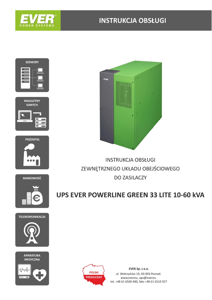 Instrukcja obsługi układu obejściowego do zasilaczy UPS POWERLINE GREEN 33 LITE 10-60 kVA SPIS TREŚCI SPIS TREŚCI ........................................................................................................................................................ 2 UWAGI DOTYCZĄCE BEZPIECZEŃSTWA ................................................................................................. 3 OBSŁUGA ZEWNĘTRZNEGO UKŁADU OBEJŚCIOWEGO ..................................................................... 3 PRZEŁĄCZENIE ZASILANIA GWARANTOWANEGO (Z UPS-A) NA ZASILANIE Z LINII PODSTAWOWEJ .............................................................................................................................................. 5 PRZEŁĄCZENIE ZASILANIA Z SIECI PODSTAWOWEJ ........................................................................... 6 NA ZASILANIE GWARANTOWANE (UPS) ................................................................................................. 6 PARAMETRY TECHNICZNE ........................................................................................................................... 7 DANE TECHNICZNE ....................................................................................................................................... 7 NOTATKI .............................................................................................................................................................. 7 2016-10-27 11:30 Pomoc Techniczna, tel.: +48 61 6500 400 www.ever.eu 2 Instrukcja obsługi układu obejściowego do zasilaczy UPS POWERLINE GREEN 33 LITE 10-60 kVA UWAGI DOTYCZĄCE BEZPIECZEŃSTWA Przed przystąpieniem do jakichkolwiek czynności łączeniowych konieczne jest zapoznanie się z wytycznymi i uwagami bezpieczeństwa zamieszczonymi w instrukcji obsługi (pełnej) zasilacza. UWAGA! Przełączenie zasilania na zewnętrzny układ obejściowy może być wykonane tylko przez przeszkolony personel. Wykonanie procedury przełączenia niezgodnie z opisaną procedurą może spowodować uszkodzenie zasilacza. UWAGA! Przed przystąpieniem do czynności przełączeniowych zapoznać się z instrukcją obsługi zasilacza UPS. OBSŁUGA ZEWNĘTRZNEGO UKŁADU OBEJŚCIOWEGO * W przypadku stosowania modułu innego niż fabryczny należy zainstalować w liniach bieguna dodatniego i ujemnego bezpiecznik 100 A / 440 V DC Rysunek 1. Schemat instalacyjny zasilacza POWERLINE GREEN 33 LITE 10-60 kVA. 3 www.ever.eu Pomoc Techniczna, tel.: +48 61 6500 400 2016-10-27 11:30 Instrukcja obsługi układu obejściowego do zasilaczy UPS POWERLINE GREEN 33 LITE 10-60 kVA Oznaczenia stosowane na schemacie instalacyjnym: Fm, Fb, Fsb – Rozłączniki bezpiecznikowe (bezpiecznik Fb jest wyposażeniem dodatkowym), Qout, Qsb – Rozłączniki izolacyjne, PP1, PP2, PP3 – Przyciski awaryjnego wyłączenia zasilania (EPO), A, B – Przewody połączeniowe. Rozłącznik bezpiecznikowy Fb instalowany jest tylko w przypadku wyposażenia zasilacza POWERLINE GREEN 33 LITE w opcjonalne wejście BYPASS. Wykaz zabezpieczeń wraz z przekrojem przewodów w zależności od modelu zasilacza znajduje się w osobnym dokumencie „Wytyczne instalacyjne do zasilaczy UPS POWERLINE GREEN 33 LITE 10-60kVA”. UPS zaprojektowany do pracy w instalacji typu TN Qsb – Zablokowany mechanicznie w pozycji otwartej podczas zasilania odbiorników z zasilania gwarantowanego (UPS) Podczas zasilania odbiorników z zasilania gwarantowanego (UPS) wkładki do Fsb przechowywać poza rozdzielnią UPS. Fsb, Qsb – Obsługa wyłącznie przez przeszkolony personel; Niewłaściwe użycie grozi uszkodzeniem UPS 2016-10-27 11:30 Pomoc Techniczna, tel.: +48 61 6500 400 www.ever.eu 4 Instrukcja obsługi układu obejściowego do zasilaczy UPS POWERLINE GREEN 33 LITE 10-60 kVA PRZEŁĄCZENIE ZASILANIA GWARANTOWANEGO (Z UPS-A) NA ZASILANIE Z LINII PODSTAWOWEJ W celu bezprzerwowego przełączenia wydzielonej sieci gwarantowanej na zasilanie podstawowe przy użyciu zewnętrznego układu obejściowego (Rys. 1) należy postępować zgodnie z poniższą procedurą: 1. Wyłączyć zasilacz. W tym celu należy wejść do: Menu -> kontrola -> UPS ->Wył (UPS zostaje logicznie wyłączony). 2. Odczekać aż zasilacz zostanie logicznie wyłączony i zacznie sygnalizować pracę odbiorników z wewnętrznego układu obejściowego (bypass) –Tryb pracy CZUWANIE. 3. Załączyć w torze obejściowym rozłącznik izolacyjny Qsb. 4. Załączyć rozłącznik bezpiecznikowy Fsb w torze obejściowym. 5. Rozłączyć w torze wyjściowym UPS-a rozłącznik izolacyjny Qout. 6. Rozłączyć w torze wejściowym UPS-a rozłącznik bezpiecznikowy Fm (dla zasilacza z opcją wydzielonej linii BYPASS również Fb). 5 www.ever.eu Pomoc Techniczna, tel.: +48 61 6500 400 2016-10-27 11:30 Instrukcja obsługi układu obejściowego do zasilaczy UPS POWERLINE GREEN 33 LITE 10-60 kVA PRZEŁĄCZENIE ZASILANIA Z SIECI PODSTAWOWEJ NA ZASILANIE GWARANTOWANE (UPS) W celu bezprzerwowego przełączenia zasilania (Rys. 1) z wydzielonej sieci podstawowej na źródło gwarantowane (UPS), należy wykonać poniższą procedurę: 1. Upewnić się, że zasilacz UPS jest logicznie wyłączony. 2. Załączyć w torze wejściowym UPS-a rozłącznik bezpiecznikowy Fm (dla zasilacza z opcją wydzielonej linii BYPASS również Fb). 3. Poczekać aż zasilacz zacznie sygnalizować pracę odbiorników z wewnętrznego układu obejściowego (bypass) –tryb pracy CZUWANIE. 4. Załączyć w torze wyjściowym UPS-a rozłącznik izolacyjny Qout. 5. Rozłączyć rozłącznik bezpiecznikowy Fsb w torze obejściowym. 6. Rozłączyć w torze obejściowym rozłącznik izolacyjny Qsb. 7. Włączyć zasilacz. W tym celu należy wejść do: Menu -> kontrola -> UPS ->Wł (UPS zostaje logicznie włączony) –Tryb pracy SIECIOWA. UWAGA! Po wykonaniu gwarantowanego należy i bezpiecznikowe w procedury zabezpieczyć zewnętrznym przywrócenia urządzenia torze zasilania rozłączające o