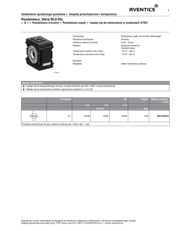 1 Uzdatnianie sprężonego powietrza ► Zespoły pneumatyczne i komponenty Rozdzielacz, Seria NL6-DIL ► G 1 ► Rozdzielacz 3-krotny ► Rozdzielacz wąski ► nadaje się do stosowania w systemach ATEX Konstrukcja Rozdzielacz wąski, do montażu blokowego Położenie montażowe Dowolny Ciśnienie robocze min/max 0 bar / 16 bar Medium Sprężone powietrze Neutralne gazy Temperatura medium min./maks. -10°C / +60°C Temperatura otoczenia min./maks. -10°C / +60°C Materiały: Obudowa odlew ciśnieniowy cynkowy 00106959 Uwagi Techniczne ■ Nadaje się do bezpośredniego montażu czujnika ciśnienia serii PE1 i PM1 w wersji kołnierzowej ■ Nadaje się do stosowania w strefach zagrożonych wybuchem 1,2,21,22 Przyłącze Qn 1▶2 G1 25000 1▶3 1▶5 10000 10000 [l/min] Przepływ znamionowy Qn przy ciśnieniu wtórnym p2 = 6 bar i Δp = 1 bar Pogrubione numery materiałowe są dostępne w centralnym magazynie w Niemczech, informacje szczegółowe patrz Koszyk Katalog elementów pneumatycznych, PDF online, stan 2017-02-01, © AVENTICS S.à r.l., zmiany zastrzeżone Ciężar Numer materiałowy [kg] 0,95 0821300978 2 Uzdatnianie sprężonego powietrza ► Zespoły pneumatyczne i komponenty Rozdzielacz, Seria NL6-DIL ► G 1 ► Rozdzielacz 3-krotny ► Rozdzielacz wąski ► nadaje się do stosowania w systemach ATEX Rozmiary 2 2 1 A5 T3 D E A2 A1 W C T5 1 A3 T1 B J B1 3 G F 00107311 1) Płyta przyłączeniowa G1, numer materiałowy 1827009591, należy zamówić osobno. 2) Bez gwintu króćca 3) schemat otworów tylko dla mechanicznego wyłącznika próżniowego / presostatu Zblokowanie przy użyciu zestawu do montażu blokowego, numer materiałowy 1827009593 A1 G1 A1 G1 A2 G1 A3 G 1/2 B 60 B1 53 C 52 D 50 E 102 F 20 G M5 J 103 T1 18 T3 14,5 W 74 Pogrubione numery materiałowe są dostępne w centralnym magazynie w Niemczech, informacje szczegółowe patrz Koszyk Katalog elementów pneumatycznych, PDF online, stan 2017-02-01, © AVENTICS S.à r.l., zmiany zastrzeżone T5 8