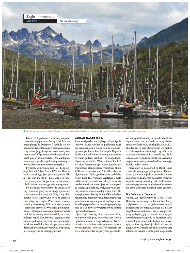 Żagle mo r ze sierpień 2011 Na krańcu mapy n „Selma” wyrusza w stronę Morza Weddella z argentyńskiego Puerto Williams i żegluje ku Kanałowi Beagle. To nasz start ku niezwykłej przegodzie Po czterech godzinach wracamy na jacht i wkrótce wypływamy z Deception I. Marzenie (wpłynąć do Decepion I) spełniło się, ale ponownie stwierdziłam, że wyspa zasługuje na taką nazwę (ang. deception – oszustwo, rozczarowanie). W przewodnikach piszą o koloniach pingwinów, uchatek... One występują na zewnętrznych brzegach wyspy, a wewnątrz wyspa sprawia wrażenie cmentarzyska. Płyniemy w kierunku NE – cel King George Island i Polska Stacja PAN im. Henryka Arctowskiego. Jest jasna noc, wiatr NE 4 – 5B, stan morza 1 – 2, ale dopiero rano stawiamy genuę. W południe odstawiamy silnik. Wiatr się wzmaga, refujemy genuę. Po południu wpływamy do Admiralty Bay. Kontaktujemy się ze stacją i jesteśmy tam zaproszeni na wieczór. Przy stacji zbyt mocno wieje, wpływamy więc do Ezcurra Inlet i stajemy w dryfie. Wieczorem rzucamy kotwicę przed stacją. Miła atmosfera, ciepłe i serdeczne przyjęcie, wycieczka po pingwinisku – olbrzymia kolonia pingwinów Adeli z młodymi, haremy słoni morskich, Internet, kolacja i kąpiel. Nad ranem 21 stycznia wiatr cichnie, podnosimy kotwicę i kierujemy jacht na Morze Weddella. Ktoś nieopacznie powiedział: JAK dotrzemy na Weddella… Neptunie, ja jestem pewna, że tam wpłyniemy! 64 062_67_08_11_Weddell.indd 64 Coraz dalej na S Zmienia się układ wacht, bo przed nami pola lodowe i każda wachta na pokładzie musi być wzmocniona o osobę na oku oraz osoby do odpychania kier lodowych. Kapitan dzieli nas na dwie wachty pięcioosobowe co osiem godzin, kambuz – co drugi dzień. Płyniemy na silniku. Wiatr z kierunku SSE 1 – 2B, w dzień wzmaga się do 3B, niebo zachmurzone, a temperatura w sterówce około 10ºC, wieczorem i w nocy S 1 – 2B – cały czas płyniemy na silniku, praktycznie pod słaby wiatr. Łagodne warunki wietrzne i małe zafalowanie pozwala nam złożyć życzenia urodzinowe kapitanowi. Jest tort i szampan! 22 stycznia po północy wpływamy do Cieśniny Antarktycznej, między wyspą Joinville a przylądkiem Trinity. Niewielkie zalodzenie, mijamy zatokę Hope, gdzie znajduje się antarktyczna stacja argentyńska Esperanza. Przed wyspą Andersson pojawiają się olbrzymie pola lodowe z wypiętrzonymi krami i górami lodowymi. Jest 0430. Zostaję obudzona przez Olę, bo widoki lodu przy wschodzącym słońcu i gładkim morzu są niepowtarzalne. Niesamowite światło i sceneria lodu o różnorodnych kształtach i kolorach. Ten niebieski ma wiele milionów lat! Gigantyczne góry lodo- we mają postać zamczysk, katedr, a te, które się niedawno oderwały od szelfu, są płaskie i mają wielkość kilku boisk piłkarskich. Michał ładnie to ujął: Opisywanie ich piękna to jak fotografowanie muzyki czy tańczenie w rytm architektury. Zatrzymaliśmy silnik, jedna osoba wchodzi na maszt, inne wsiadają do pontonu, krążąc wśród lodów i szukając kanału wolnej wody. Kierujemy się na zachód na Devil Island – maleńką wysepkę przy Vega Island. Po śniadaniu przy burcie jachtu pojawiła się para wielorybów, dla których nasz jacht wydawał się ciekawostką-zabawką. Podziwialiśmy niesamowitą sprawność humbaków. Oczywiście nie obyło się bez zrobienia zdjęć ich ogonów. Na Wyspie Diabła Około1400 dopływamy do Devil Island. Dokładne informacje od Henia Wolskiego o głębokościach i o tym, gdzie można dobić bezpiecznie do brzegu, kierują nasz jacht do północno-zachodniej części wyspy. Stajemy w dryfie, gdyż rzucenie kotwicy jest niewskazane ze względu na dużą ilość paku i małych gór lodowych. Lądujemy na wyspie, na której gniazduje około 20 000 par pingwinów. Dorosłe osobniki opiekują się młodzieżą mającą jeszcze puch na piórach. Żagle | www.zagle.com.pl 2011-07-06 11:06:35