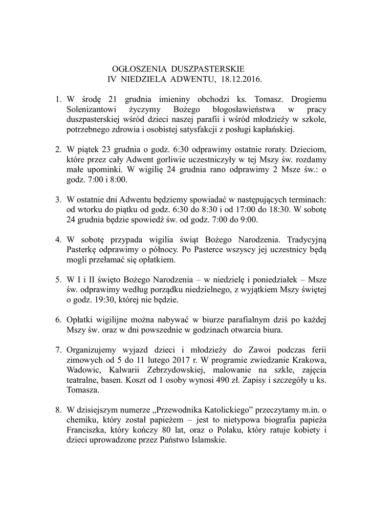 OGŁOSZENIA DUSZPASTERSKIE IV NIEDZIELA ADWENTU, 18.12.2016. 1. W środę 21 grudnia imieniny obchodzi ks. Tomasz. Drogiemu Solenizantowi życzymy Bożego błogosławieństwa w pracy duszpasterskiej wśród dzieci naszej parafii i wśród młodzieży w szkole, potrzebnego zdrowia i osobistej satysfakcji z posługi kapłańskiej. 2. W piątek 23 grudnia o godz. 6:30 odprawimy ostatnie roraty. Dzieciom, które przez cały Adwent gorliwie uczestniczyły w tej Mszy św. rozdamy małe upominki. W wigilię 24 grudnia rano odprawimy 2 Msze św.: o godz. 7:00 i 8:00. 3. W ostatnie dni Adwentu będziemy spowiadać w następujących terminach: od wtorku do piątku od godz. 6:30 do 8:30 i od 17:00 do 18:30. W sobotę 24 grudnia będzie spowiedź św. od godz. 7:00 do 9:00. 4. W sobotę przypada wigilia świąt Bożego Narodzenia. Tradycyjną Pasterkę odprawimy o północy. Po Pasterce wszyscy jej uczestnicy będą mogli przełamać się opłatkiem. 5. W I i II święto Bożego Narodzenia – w niedzielę i poniedziałek – Msze św. odprawimy według porządku niedzielnego, z wyjątkiem Mszy świętej o godz. 19:30, której nie będzie. 6. Opłatki wigilijne można nabywać w biurze parafialnym dziś po każdej Mszy św. oraz w dni powszednie w godzinach otwarcia biura. 7. Organizujemy wyjazd dzieci i młodzieży do Zawoi podczas ferii zimowych od 5 do 11 lutego 2017 r. W programie zwiedzanie Krakowa, Wadowic, Kalwarii Zebrzydowskiej, malowanie na szkle, zajęcia teatralne, basen. Koszt od 1 osoby wynosi 490 zł. Zapisy i szczegóły u ks. Tomasza. 8. W dzisiejszym numerze „Przewodnika Katolickiego” przeczytamy m.in. o chemiku, który został papieżem – jest to nietypowa biografia papieża Franciszka, który kończy 80 lat, oraz o Polaku, który ratuje kobiety i dzieci uprowadzone przez Państwo Islamskie.