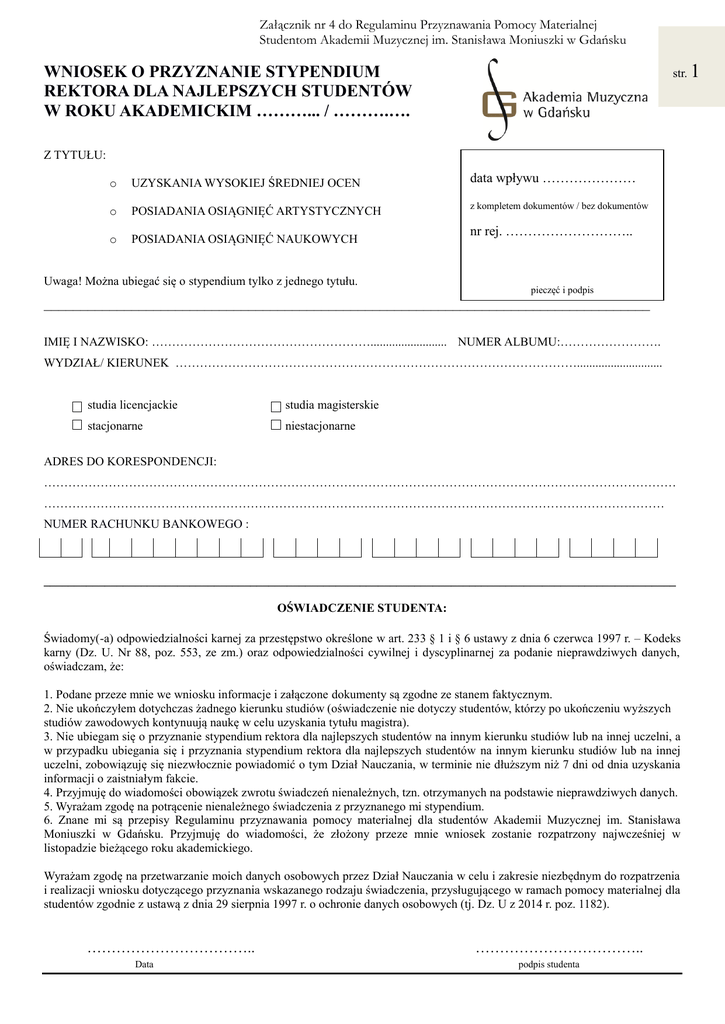 Załącznik nr 4 do Regulaminu Przyznawania Pomocy Materialnej Studentom Akademii Muzycznej im. Stanisława Moniuszki w Gdańsku WNIOSEK O PRZYZNANIE STYPENDIUM REKTORA DLA NAJLEPSZYCH STUDENTÓW W ROKU AKADEMICKIM ………... / ……….…. str. Z TYTUŁU: o UZYSKANIA WYSOKIEJ ŚREDNIEJ OCEN o POSIADANIA OSIĄGNIĘĆ ARTYSTYCZNYCH o POSIADANIA OSIĄGNIĘĆ NAUKOWYCH Uwaga! Można ubiegać się o stypendium tylko z jednego tytułu. data wpływu ………………… z kompletem dokumentów / bez dokumentów nr rej. ……………………….. pieczęć i podpis ___________________________________________________________________________________ IMIĘ I NAZWISKO: ………………………………………………......................... NUMER ALBUMU:……………………. WYDZIAŁ/ KIERUNEK ………………………………………………………………………………………............................ studia licencjackie studia magisterskie stacjonarne niestacjonarne ADRES DO KORESPONDENCJI: ………………………………………………………………………………………………………………………………………… ……………………………………………………………………………………………………………………………………… NUMER RACHUNKU BANKOWEGO : ________________________________________________________________________________________________________ OŚWIADCZENIE STUDENTA: Świadomy(-a) odpowiedzialności karnej za przestępstwo określone w art. 233 § 1 i § 6 ustawy z dnia 6 czerwca 1997 r. – Kodeks karny (Dz. U. Nr 88, poz. 553, ze zm.) oraz odpowiedzialności cywilnej i dyscyplinarnej za podanie nieprawdziwych danych, oświadczam, że: 1. Podane przeze mnie we wniosku informacje i załączone dokumenty są zgodne ze stanem faktycznym. 2. Nie ukończyłem dotychczas żadnego kierunku studiów (oświadczenie nie dotyczy studentów, którzy po ukończeniu wyższych studiów zawodowych kontynuują naukę w celu uzyskania tytułu magistra). 3. Nie ubiegam się o przyznanie stypendium rektora dla najlepszych studentów na innym kierunku studiów lub na innej uczelni, a w przypadku ubiegania się i przyznania stypendium rektora dla najlepszych studentów na innym kierunku studiów lub na innej uczelni, zobowiązuję się niezwłocznie powiadomić o tym Dział Nauczania, w terminie nie dłuższym niż 7 dni od dnia uzyskania informacji o zaistniałym fakcie. 4. Przyjmuję do wiadomości obowiązek zwrotu świadczeń nienależnych, tzn. otrzymanych na podstawie nieprawdziwych danych. 5. Wyrażam zgodę na potrącenie nienależnego świadczenia z przyznanego mi stypendium. 6. Znane mi są przepisy Regulaminu przyznawania pomocy materialnej dla studentów Akademii Muzycznej im. Stanisława Moniuszki w Gdańsku. Przyjmuję do wiadomości, że złożony przeze mnie wniosek zostanie rozpatrzony najwcześniej w listopadzie bieżącego roku akademickiego. Wyrażam zgodę na przetwarzanie moich danych osobowych przez Dział Nauczania w celu i zakresie niezbędnym do rozpatrzenia i realizacji wniosku dotyczącego przyznania wskazanego rodzaju świadczenia, przysługującego w ramach pomocy materialnej dla studentów zgodnie z ustawą z dnia 29 sierpnia 1997 r. o ochronie danych osobowych (tj. Dz. U z 2014 r. poz. 1182). …………………………….. Data …………………………….. podpis studenta 1 Załącznik nr 4 do Regulaminu Przyznawania Pomocy Materialnej Studentom Akademii Muzycznej im. Stanisława Moniuszki w Gdańsku WNIOSEK O PRZYZNANIE STYPENDIUM REKTORA DLA NAJLEPSZYCH STUDENTÓW W ROKU AKADEMICKIM ………... / ……….…. str. Wypełnia Dziekanat: ŚREDNIA OCEN W ROKU AKADEMICKIM …………. / …………… z przedmiotu głównego z pozostałych przedmiotów średnia arytmetyczna Student złożył / nie złożył z wynikiem pozytywnym wszystkie egzaminy i zaliczenia przewidziane w panie studiów na dany rok, zgodnie z harmonogramem sesji Student złożył / nie złożył indeks/u w terminie 2 dni od zakończenia poprawkowej sesji egzaminacyjnej. Gdańsk, dnia ………………….……… …………………….……………….……………… Pieczęć imienna i podpis pracownika Dziekanatu ________________________________________________________________________________________________________________ Wykaz szczegółowych osiągnieć uprawniających do ubiegania się o stypendium Rektora dla najlepszych studentów (w przypadku ubiegania się o stypendium z tytułu wysokiej średniej ocen nie należy wypełniać osiągnięć) Osiągnięcia uzyskane przez studenta w zakończonym roku akademickim: I. udział w konkursach krajowych i zagranicznych, udział w festiwalach krajowych i zagranicznych, ważniejsze koncerty z orkiestrami, solowe itp., publikacje, wydawnictwa ………………………………………………………………………………………….…………………………………… ………………………………………………………………………………………….…………………………………… ………………………………………………………………………………………….…………………………………… ………………………………………………………………………………………………………………….…………… ………………………………………………………………………………………………………………….…………… II. działalność na rzecz uczelni (udział w pracach Rady Wydziału, Senacie, Samorządzie, działalność organizacyjna itp.) ………………………………………………………………………………………….…………………………………… …………………………………………………………………………………………