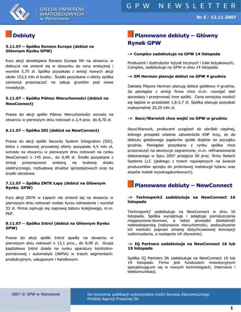 Nr 5 - 12.11.2007 Debiuty 5.11.07 – Spółka Ronson Europe (debiut na Głównym Rynku GPW) Kurs akcji dewelopera Ronson Europe NV na otwarciu w debiucie nie zmienił się w stosunku do ceny emisyjnej i wyniósł 5,75 zł. Spółka pozyskała z emisji nowych akcji około 153,5 mln zł brutto. Środki pozyskane z oferty spółka zamierza przeznaczyć na zakup gruntów pod nowe inwestycje. 5.11.07 – Spółka Północ Nieruchomości (debiut na NewConnect) Prawa do akcji spółki Północ Nieruchomości wzrosły na otwarciu w pierwszym dniu notowań o 2,4 proc. do 8,70 zł. 6.11.07 – Spółka SSI (debiut na NewConnect) Prawa do akcji spółki Security System Integration (SSI), która z niedawnej prywatnej oferty pozyskała 4,5 mln zł, wzrosły na otwarciu w pierwszym dniu notowań na rynku NewConnect o 145 proc., do 0,49 zł. Środki pozyskane z emisji przeznaczone zostaną na budowę działu elektrycznego, rozbudowę struktur sprzedaŜowych oraz na środki obrotowe. 7.11.07 – Spółka ZNTK Łapy (debiut na Głównym Rynku GPW) Kurs akcji ZNTK w Łapach nie zmienił się na otwarciu w pierwszym dniu notowań wobec kursu odniesienia i wyniósł 33 zł. Firma zajmuje się naprawą taboru kolejowego, m.in. PKP. 8.11.07 – Spółka Introl (debiut na Głównym Rynku GPW) Prawa do akcji spółki Introl spadły na otwarciu w pierwszym dniu notowań o 13,1 proc., do 9,99 zł. Grupa kapitałowa Introl działa na rynku aparatury kontrolnopomiarowej i automatyki (AKPiA) w trzech segmentach: produkcyjnym, usługowym i handlowym. 2007 © GPW w Warszawie Planowane debiuty – Główny Rynek GPW -> Complex zadebiutuje na GPW 14 listopada Producent i dystrybutor łoŜysk tocznych i tulei łoŜyskowych, Complex, zadebiutuje na GPW w dniu 14 listopada. -> ZM Herman planuje debiut na GPW 4 grudnia Zakłady Mięsne Herman planują debiut giełdowy 4 grudnia. Za pieniądze z emisji firma chce m.in. rozwijać sieć sprzedaŜy i przejmować inne spółki. Cena emisyjna mieścić się będzie w przedziale 1,8-2,7 zł. Spółka planuje pozyskać maksymalnie 20,25 mln zł. -> Seco/Warwick chce wejść na GPW w grudniu Seco/Warwick, producent urządzeń do obróbki cieplnej, którego prospekt właśnie zatwierdziła KNF liczy, Ŝe do debiutu giełdowego papierów spółki dojdzie na początku grudnia. Pieniądze pozyskane z rynku spółka chce przeznaczyć na akwizycje zagraniczne, m.in. refinansowanie dokonanego w lipcu 2007 przejęcia 50 proc. firmy Retech Systems LLC (jednego z trzech największych na świecie producentów sprzętu do próŜniowej metalurgii tytanu oraz stopów metali wysokogatunkowych). Planowane debiuty – NewConnect -> Technopark2 zadebiutuje na NewConnect 16 listopada Technopark2 zadebiutuje na NewConnect w dniu 16 listopada. Spółka wynajmuje i adaptuje pomieszczenia magazynowo-biurowe, a takŜe prowadzi działalność redeweloperską (nabywanie nieruchomości, podwyŜszanie ich wartości poprzez zmianę dotychczasowej koncepcji wykorzystania, a następnie ich zbywanie). -> IQ Partners zadebiutuje na NewConnect 16 lub 19 listopada Spółka IQ Partners SA zadebiutuje na NewConnect 16 lub 19 listopada. Firma jest funduszem inwestycyjnym specjalizującym się w nowych technologiach, Internecie i telekomunikacji. Do tworzenia publikacji wykorzystano treści Serwisu Ekonomicznego Polskiej Agencji Prasowej SA 1 Nr 5 - 12.11.2007 -> FW Baildon chce wejść na NewConnect NajwyŜsze tygodniowe zmiany kursów : Akcje Fabryka Wierteł Baildon chce przeprowadzić ofertę prywatną i zadebiutować na NewConnect. Spółka planuje pozyskać 16 mln zł. QUANTUM 13FORTUNA EFEKT MEWA WSIP -> MoŜliwy debiut freeFund w połowie 2008 WDM objął 100 proc. udziałów w spółce Centrum Funduszy Inwestycyjnych freeFUND, planuje wprowadzić ją na NewConnect w połowie 2008 roku. WDM planuje przeprowadzenie pre-IPO spółki freeFUND jeszcze w grudniu 2007 roku. Głównym źródłem dochodu dla freeFUND będą opłaty za zarządzanie funduszami, jakimi dzielą się z dystrybutorami Towarzystwa Funduszy Inwestycyjnych. Tydzień na rynku W tygodniu 5.11-9.11.2007 indeksy: • • • • • • • • • WIG20 osiągnął na koniec tygodnia poziom 3.606,62 pkt (spadek w porównaniu z poprzednim tygodniem o 5,40 proc.); średnia wartość obrotów (na sesję) wyniosła 1.231 mln zł; zawarto przeciętnie (na sesję) 14.478 transakcji - średnia wartość 1 transakcji to 42.511 zł; mWIG40 osiągnął na koniec tygodnia poziom 4.257,47 pkt (spadek w porównaniu z poprzednim tygodniem o 7,40 proc.); średnia wartość obrotów (na sesję) wyniosła 200 mln zł; zawarto przeciętnie (na sesję) 8.551 transakcji – średnia wartość 1 transakcji to 11.702 zł; sWIG80 osiągnął na koniec tygodnia poziom 16.590,53 pkt (spadek w porównaniu z poprzednim tygodniem o 8,47 proc.); średnia wartość obrotów (na sesję) wyniosła 189 mln zł; zawarto przeciętnie (na sesję) 15.733 transakcji – średnia wartość 1 transakcji to 6.017 zł; Kurs z 05-11-07 18,61 2,36 34 7,32 15 Kurs z 09-11-07 20,00 2,50 36 7,69 15,75 Zmiana (%) 7,47 5,93 5,88 5,05 5 Wśród branŜ, wszystkie branŜe osiągnęły ujemną stopę zwrotu. Najmniej traciły spółki z branŜy bankowej (spadek o 2,99%), najwięcej - spółki z branŜy budowlanej (spadek o 12,35%). Zgodnie z oczekiwaniami 36% analityków ankietowanych przez Giełdę, wartość indeksu WIG20 w ciągu tygodnia wzrośnie, zaś 55% z nich oczekuje spadku indeksu największych spółek w tym okresie. Tym samym wartość wskaźnika WIGOMETR wynosi -19 pkt. Członkowie GPW 6.11.2007 – DekaBank dopuszczony do działania na GPW Niemiecki bank DekaBank Deutsche Girozentrale, z siedzibą w Frankfurcie, został w dniu 6 listopada 2007 dopuszczony do działania na Giełdzie w charakterze członka giełdy. DekaBank jest centralną instytucją grupy German Savings Banks Finance Group i działa na rynku finansowym w sektorze bankowości detalicznej i funduszy inwestycyjnych. Jest 