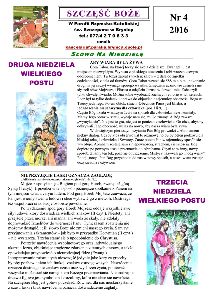 SZCZĘŚĆ BOŻE W Parafii Rzymsko-Katolickiej św. Szczepana w Brynicy tel.: 077/4 2 7 0 6 3 3 Nr 4 2016 email: [email protected] SŁOWO NA NIEDZIELĘ =========================================================================================================================================================================== DRUGA NIEDZIELA WIELKIEGO POSTU ABY WIARA BYŁA ŻYWA Góra Tabor, na której toczy się akcja dzisiejszej Ewangelii, jest miejscem niezwykłym. Wyrasta z płaskiego otoczenia i robi wrażenie swym odosobnieniem. Tu Jezus zabrał swych uczniów – z dala od zgiełku codzienności, z dala od tłumów. Góra Tabor wznosi się 588 m n.p.m., pokonanie drogi na jej szczyt wymaga sporego wysiłku. Zmęczeni uczniowie zasnęli i nie słyszeli słów Mojżesza i Eliasza o odejściu Jezusa w Jerozolimie. Zobaczyli tylko chwałę, światło. Można sobie wyobrazić zachwyt i euforię w ich sercach. Lecz był to tylko dodatek i oprawa do objawienia tajemnicy obecności Boga w Trójcy jedynego. Potem obłok, strach. Obecność Pana jest bliska, a jednocześnie nieuchwytna dla człowieka (por. Hi 9,11). Często Bóg działa w naszym życiu na sposób dla człowieka niezrozumiały. Mamy Jego obraz w sercu, wydaje nam się, że Go znamy. A Bóg zawsze „wymyka się”. Nie jest to gra, nie jest to poniżanie człowieka. On chce, abyśmy odkrywali Jego obecność, wciąż na nowo, aby nasza wiara była żywa. W dzisiejszym pierwszym czytaniu Pan Bóg prowadzi z Abrahamem piękny dialog. Gdyby ktoś obserwował tę rozmowę, to byłby pełen podziwu dla bliskiej relacji człowieka i Stwórcy. Zaraz potem Pan w tajemniczy sposób się wycofuje. Abraham zostaje sam z niepewnością, strachem, ciemnością. Bóg dopiero po pewnym czasie przemawia do Abrahama. Czyni to w inny, nowy sposób. Znamy ten lęk, pozorne opuszczenie. Mistycy nazywali go „nocą wiary”. Po tej „nocy” Pan Bóg przychodzi do nas w nowy sposób, a nasza wiara zostaje oczyszczona i ożywiona. =============================================================================================================================================================================== NIEPRZYJĘCIE ŁASKI OZNACZA ZAGŁADĘ „Jeśli się nie nawrócicie, wszyscy tak samo zginiecie”. (Łk 13,5) Mojżesz spotyka się z Bogiem pod górą Horeb, zwaną też górą Synaj (I czyt.). Uprzedza w ten sposób późniejsze spotkanie z Panem na tym miejscu wraz z całym ludem. Pod górą Horeb Mojżesz zauważa, że Pan jest wierny swemu ludowi i chce wybawić go z niewoli. Dostrzega też współbraci oraz swoje osobiste powołanie. Po wydarzeniu spod góry Horeb Mojżesz oddaje wszystkie swe siły ludowi, który doświadcza wielkich znaków (II czyt.). Niestety, ani przejście przez morze, ani manna, ani woda ze skały, nie zdołały doprowadzić Izraelitów do wierności Panu. Tymczasem zbawienia nie możemy dostąpić, jeśli słowo Boże nie zmieni naszego życia. Sam ryt przyjmowania sakramentów – jak było w przypadku Koryntian (II czyt.) – nie wystarcza. Trzeba starać się o upodobnienie do Chrystusa. Potrzebę nawrócenia wspólnotowego oraz indywidualnego ukazuje Jezus, objaśniając tragiczne zdarzenia z tamtych czasów, a także opowiadając przypowieść o nieurodzajnej fidze (Ewang.). Interpretowanie zaistniałych nieszczęść jedynie jako kary za grzechy byłoby pozbawianiem ich funkcji znaków ostrzegawczych. Nawrócenie oznacza dostrzeganie znaków czasu oraz wydarzeń życia, ponieważ wszystko może stać się narzędziem Bożego przemawiania. Nieurodzajne drzewo figowe jest symbolem Jerozolimy, która nie chce się nawrócić. Na szczęście Bóg jest gotów poczekać. Również dla nas nieskorzystanie z czasu łaski i brak nawrócenia oznacza doświadczenie zagłady. TRZECIA NIEDZIELA WIELKIEGO POSTU INTENCJE MSZALNE – PORZĄDEK NABOŻEŃSTW od 21 do 28 lutego 2016 roku. Niedziela 7.30 9.15 10.30 15.00 16.45 21.02 DRUGA NIEDZIELA WIELKIEGO POSTU. Za †† rodziców Małgorzatę i Antoniego oraz wszystkich z pokrewieństwa. Grabczok Za †† ojca Józefa Świtala w rocz. śm., jego żonę Zofię, synową Elizabeth, Marię i Rocha Kroll oraz z pokrewieństwa. Do Miłosierdzia Bożego †† matkę Julię w rocz. śm., 2 ojców, dziadków z 3 stron, 2 braci, 3 szwagrów, teściów Józefa i Emilię, ich rodziców oraz z całego pokrewieństwa i dusze w czyśćcu cierpiące. Gorzkie Żale z kazaniem pasyjnym. Grabczok Gorzkie Żale – nabożeństwo z biskupem wizytacja biskupia Poniedziałek 22.02 Święto Katedry Św. Piotra. Adoracja Grabczok 18.00 Grabczok Za †† rodziców Łucję i Piotra Kurtz, Martę i Ryszarda Emmerling, męża Wilhelma, brata Huberta, 3 szwagrów oraz z pokrewieństwa z obu stron. Wtorek 23.02 7.00 Za † ciotkę Annę z ok. ur. Środa 24.02 7.00 W intencji róży różańcowej Jezusa Miłosiernego – przełożona p. Bernadeta Sówka, o zdrowie, opiekę i bł. Boże w rodzinach oraz za †† z tej róży. Czwartek 25.02 7.00 Z podziękowaniem za otrzymane łaski z prośbą o bł. Boże w rodzinie oraz rodzinach dzieci z ok. ur. Urszuli. 17.00 Za †† ojca Jana w rocz. śm., matkę Albinę i z pokrewieństwa. Piątek 26.02 7.00 Do MBNP z podziękowaniem za otrzymane łaski z prośbą o zdrowie i bł. Boże z ok. ur. Hildegardy oraz o zdrowie i bł. Boże w naszych rodzinach. 17.00 Grabczok Za †† rodziców Franciszka i Julię Świec, Franciszka i Małgorzatę Filip, zięcia Bertolda, brata Jerzego i z pokrewieństwa. 18.00 Droga Krzyżowa. Sobota 27.02 18.00 Za †† męża i ojca Konrada Sowa, syna Alfreda, córkę Marię, rodziców z obu stron i dusze w czyśćcu cierpiące. Niedziela 28.02 TRZECIA NIEDZIELA WIELKIEGO POSTU. 7.30 Za † Jadwigę Marsolek od róży różańcowej św. Faustyny – p. Weronika Kansy. 9.15 Grabczok Za †† Józefa Kotula w 4 rocz. śm. oraz za z pokrewieństwa. 10.30 Za † Edmunda Polok o spokój duszy od rodziny Klimek z dziećmi. 14.00 Grabc