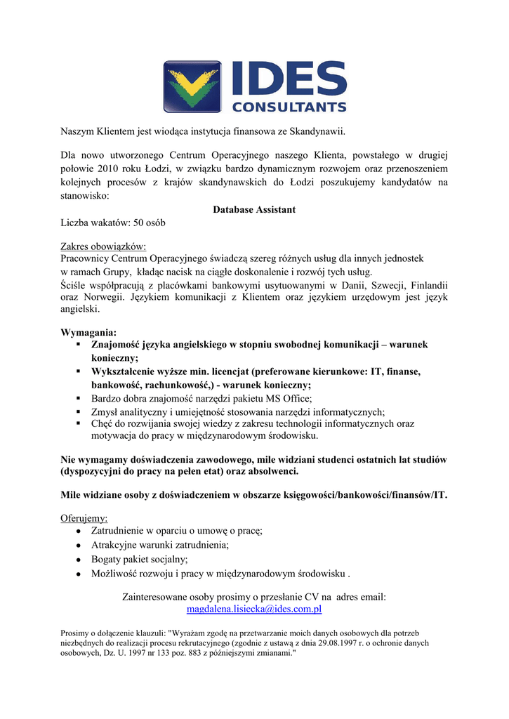 Naszym Klientem jest wiodąca instytucja finansowa ze Skandynawii. Dla nowo utworzonego Centrum Operacyjnego naszego Klienta, powstałego w drugiej połowie 2010 roku Łodzi, w związku bardzo dynamicznym rozwojem oraz przenoszeniem kolejnych procesów z krajów skandynawskich do Łodzi poszukujemy kandydatów na stanowisko: Database Assistant Liczba wakatów: 50 osób Zakres obowiązków: Pracownicy Centrum Operacyjnego świadczą szereg różnych usług dla innych jednostek w ramach Grupy, kładąc nacisk na ciągłe doskonalenie i rozwój tych usług. Ściśle współpracują z placówkami bankowymi usytuowanymi w Danii, Szwecji, Finlandii oraz Norwegii. Językiem komunikacji z Klientem oraz językiem urzędowym jest język angielski. Wymagania: Znajomość języka angielskiego w stopniu swobodnej komunikacji – warunek konieczny; Wykształcenie wyższe min. licencjat (preferowane kierunkowe: IT, finanse, bankowość, rachunkowość,) - warunek konieczny; Bardzo dobra znajomość narzędzi pakietu MS Office; Zmysł analityczny i umiejętność stosowania narzędzi informatycznych; Chęć do rozwijania swojej wiedzy z zakresu technologii informatycznych oraz motywacja do pracy w międzynarodowym środowisku. Nie wymagamy doświadczenia zawodowego, mile widziani studenci ostatnich lat studiów (dyspozycyjni do pracy na pełen etat) oraz absolwenci. Mile widziane osoby z doświadczeniem w obszarze księgowości/bankowości/finansów/IT. Oferujemy: Zatrudnienie w oparciu o umowę o pracę; Atrakcyjne warunki zatrudnienia; Bogaty pakiet socjalny; Możliwość rozwoju i pracy w międzynarodowym środowisku . Zainteresowane osoby prosimy o przesłanie CV na adres email: [email protected] Prosimy o dołączenie klauzuli: "Wyrażam zgodę na przetwarzanie moich danych osobowych dla potrzeb niezbędnych do realizacji procesu rekrutacyjnego (zgodnie z ustawą z dnia 29.08.1997 r. o ochronie danych osobowych, Dz. U. 1997 nr 133 poz. 883 z późniejszymi zmianami."