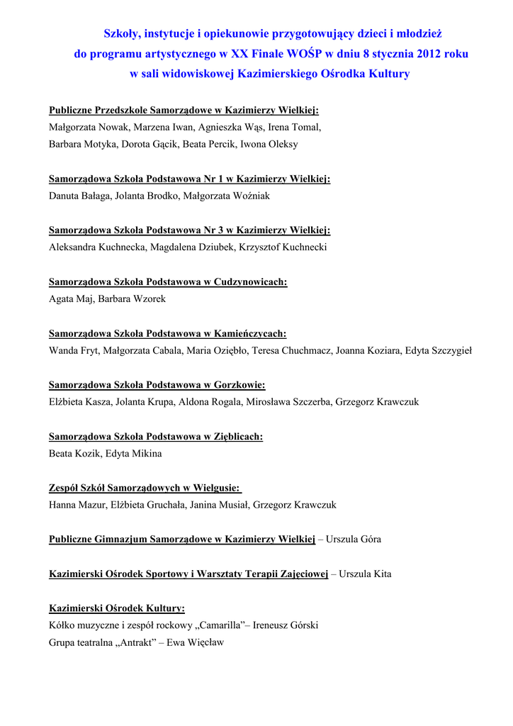 Szkoły, instytucje i opiekunowie przygotowujący dzieci i młodzieŜ do programu artystycznego w XX Finale WOŚP w dniu 8 stycznia 2012 roku w sali widowiskowej Kazimierskiego Ośrodka Kultury Publiczne Przedszkole Samorządowe w Kazimierzy Wielkiej: Małgorzata Nowak, Marzena Iwan, Agnieszka Wąs, Irena Tomal, Barbara Motyka, Dorota Gącik, Beata Percik, Iwona Oleksy Samorządowa Szkoła Podstawowa Nr 1 w Kazimierzy Wielkiej: Danuta Bałaga, Jolanta Brodko, Małgorzata Woźniak Samorządowa Szkoła Podstawowa Nr 3 w Kazimierzy Wielkiej: Aleksandra Kuchnecka, Magdalena Dziubek, Krzysztof Kuchnecki Samorządowa Szkoła Podstawowa w Cudzynowicach: Agata Maj, Barbara Wzorek Samorządowa Szkoła Podstawowa w Kamieńczycach: Wanda Fryt, Małgorzata Cabala, Maria Oziębło, Teresa Chuchmacz, Joanna Koziara, Edyta Szczygieł Samorządowa Szkoła Podstawowa w Gorzkowie: ElŜbieta Kasza, Jolanta Krupa, Aldona Rogala, Mirosława Szczerba, Grzegorz Krawczuk Samorządowa Szkoła Podstawowa w Zięblicach: Beata Kozik, Edyta Mikina Zespół Szkół Samorządowych w Wielgusie: Hanna Mazur, ElŜbieta Gruchała, Janina Musiał, Grzegorz Krawczuk Publiczne Gimnazjum Samorządowe w Kazimierzy Wielkiej – Urszula Góra Kazimierski Ośrodek Sportowy i Warsztaty Terapii Zajęciowej – Urszula Kita Kazimierski Ośrodek Kultury: Kółko muzyczne i zespół rockowy „Camarilla”– Ireneusz Górski Grupa teatralna „Antrakt” – Ewa Więcław Występy laureatów II Powiatowego Przeglądu Artystycznego „Łowimy talenty” Klaudia Kozioł z Gimnazjum w Opatowcu (opiekun Wiesław Tomal) Grupa „Antrakt” z Kazimierskiego Ośrodka Kultury (opiekun Ewa Więcław) Emilia Kozioł z Szkoły Podstawowej w Opatowcu (opiekun Wiesław Tomal) Grupa taneczna „Sokolinki” ze Szkoły Podstawowej w Sokolinie (opiekun Agnieszka Mirewska) Alicja Paczkowska ze Szkoły Podstawowej w Czarnocinie (opiekun Paweł Paczkowski) Grupa taneczna „Sokolinki” ze Szkoły Podstawowej w Sokolinie (opiekun Barbara Wiązania) Gabriela Adamska z Gimnazjum w CzyŜowicach (opiekun Ireneusz Górski) Kamil Kwiecień ze Szkoły Podstawowej w Czarnocinie (opiekun Edyta Kot) Aleksandra Pobiega ze Szkoły Podstawowej w Sokolinie (opiekun ElŜbieta Bielecka) Szymon Szczęsny z Gimnazjum w Opatowcu (opiekun Ireneusz Górski) Nela Nocoń z Publicznego Gimnazjum Samorządowego w Kazimierzy Wielkiej (opiekun Urszula Góra)