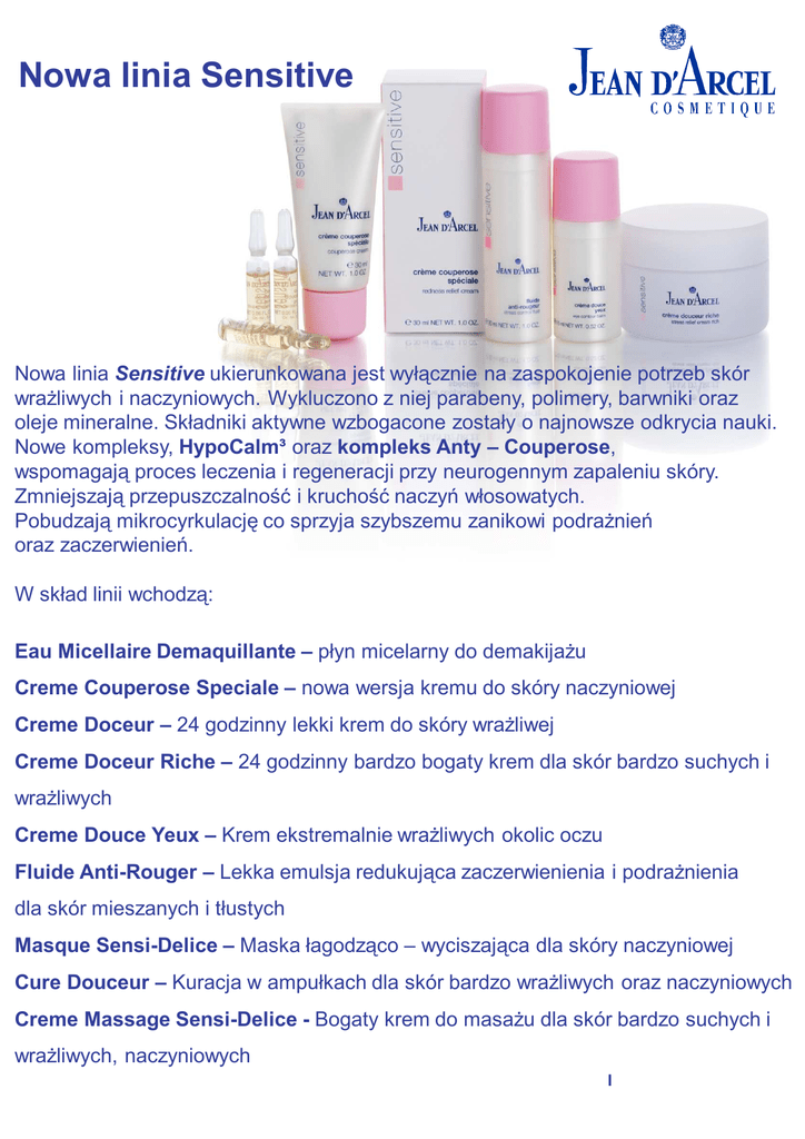 Nowa linia Sensitive Nowa linia Sensitive ukierunkowana jest wyłącznie na zaspokojenie potrzeb skór wrażliwych i naczyniowych. Wykluczono z niej parabeny, polimery, barwniki oraz oleje mineralne. Składniki aktywne wzbogacone zostały o najnowsze odkrycia nauki. Nowe kompleksy, HypoCalm³ oraz kompleks Anty – Couperose, wspomagają proces leczenia i regeneracji przy neurogennym zapaleniu skóry. Zmniejszają przepuszczalność i kruchość naczyń włosowatych. Pobudzają mikrocyrkulację co sprzyja szybszemu zanikowi podrażnień oraz zaczerwienień. W skład linii wchodzą: Eau Micellaire Demaquillante – płyn micelarny do demakijażu Creme Couperose Speciale – nowa wersja kremu do skóry naczyniowej Creme Doceur – 24 godzinny lekki krem do skóry wrażliwej Creme Doceur Riche – 24 godzinny bardzo bogaty krem dla skór bardzo suchych i wrażliwych Creme Douce Yeux – Krem ekstremalnie wrażliwych okolic oczu Fluide Anti-Rouger – Lekka emulsja redukująca zaczerwienienia i podrażnienia dla skór mieszanych i tłustych Masque Sensi-Delice – Maska łagodząco – wyciszająca dla skóry naczyniowej Cure Douceur – Kuracja w ampułkach dla skór bardzo wrażliwych oraz naczyniowych Creme Massage Sensi-Delice - Bogaty krem do masażu dla skór bardzo suchych i wrażliwych, naczyniowych I