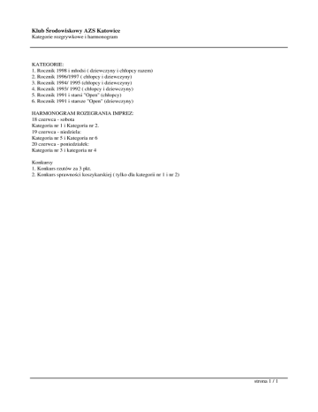 Klub Środowiskowy AZS Katowice Kategorie rozgrywkowe i harmonogram KATEGORIE: 1. Rocznik 1998 i młodsi ( dziewczyny i chłopcy razem) 2. Rocznik 1996/1997 ( chłopcy i dziewczyny) 3. Rocznik 1994/ 1995 (chłopcy i dziewczyny) 4. Rocznik 1993/ 1992 ( chłopcy i dziewczyny) 5. Rocznik 1991 i starsi "Open" (chłopcy) 6. Rocznik 1991 i starsze "Open" (dziewczyny) HARMONOGRAM ROZEGRANIA IMPREZ: 18 czerwca - sobota Kategoria nr 1 i Kategoria nr 2. 19 czerwca - niedziela: Kategoria nr 5 i Kategoria nr 6 20 czerwca - poniedziałek: Kategoria nr 3 i kategoria nr 4 Konkursy 1. Konkurs rzutów za 3 pkt. 2. Konkurs sprawności koszykarskiej ( tylko dla kategorii nr 1 i nr 2) strona 1 / 1