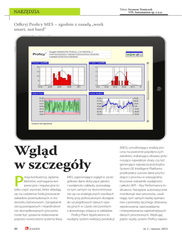 Tekst: Szymon Tomiczek VIX Automation sp. z o.o. NARZĘDZIA Odkryj Proficy MES – zgodnie z zasadą „work smart, not hard” Wgląd w szczegóły P resja konkurencji, żądania klientów, wymagania korporacyjne i regulacyjne to tylko część wyzwań, które składają się na codzienne funkcjonowanie zakładów przemysłowych w środowisku biznesowym. Zarządzanie siecią powiązanych i niejednokrotnie skomplikowanych procesów może być sprawnie realizowanie poprzez nowoczesne systemy klasy 46 KAIZEN MES, zapewniające wgląd w szczegółowe dane dotyczące jakości i wydajności zakładu, pozwalające tym samym na skoncentrowanie się na strategicznych wynikach firmy przy jednoczesnym dostępie do szczegółowych danych operacyjnych w czasie rzeczywistym z dowolnego miejsca w zakładzie. Proficy Plant Applications to wydajny system realizacji produkcji (MES), umożliwiający analizę procesu na poziomie pojedynczych zasobów, wskazujący obszary przynoszące największe straty czy też generujące najwięcej przestojów. System GE Intelligent Platforms przekształca surowe dane pochodzące z procesu w wiarygodne, kluczowe wskaźniki wydajności i jakości (KPI – Key Performance Indicators). Narzędzie automatycznie monitoruje stan procesów, uwalniając tym samym kadrę operatorów z potrzeby ręcznego zbierania, rejestrowania, wprowadzania i interpretowania najistotniejszych danych procesowych. Wędrując piętro wyżej, system Proficy zapewnr 1 / marzec 2013 nia kierownikom produkcji pełny wgląd oraz możliwość bieżącego śledzenia i zrozumienia zdarzeń produkcyjnych. Otwartość oprogramowania umożliwia swobodną wymianę danych z systemami klasy ERP/MRP na poziomie wertykalnym przy jednoczesnej współpracy z narzędziami CMMS na płaszczyźnie horyzontalnej. Modułowa budowa programu pozwala na elastyczne dopasowanie funkcjonalności systemu do potrzeb konkretnego użytkownika. Poszczególne moduły oprogramowania pozwalają skupić się na istotnych aspektach produkcji, jakimi są wydajność, jakość, genealogia i analiza produkcji wsadowej. Dowolny wybór konkretnych modułów przynoszących największe korzyści dla danego zakładu pozwala na znaczne skrócenie okresu zwrotu z inwestycji (ROI). Moduł „wydajnościowy” umożliwia lepsze wykorzystanie kapitału przedsiębiorstwa poprzez zastosowanie analiz porównawczych, wykorzystujących dane o wydajności całego procesu. Moduł jest idealnym rozwiązaniem dla kierowników produkcji dążących do zwiększenia efektywności poprzez eliminację przestojów oraz mikroprzestojów – bez potrzeby dodatkowych inwestycji w sprzęt, nowych pracowników czy też zwiększenia materiałochłonności procesu. Moduł „jakościowy” pomaga w poprawie parametrów dotyczących jakości produktów finalnych przy jednoczesnym zmniejszeniu liczby odpadów produkcyjnych oraz innych strat w procesie. Moduł w znaczący sposób poprawia wydajność produkcji, przynosząc tym samym korzyści finansowe oraz większe zadowolenie klientów. Moduł „produkcyjny” optymalizuje procesy dzięki możliwości szczegółowego wglądu w drogę produktu w całym cyklu wytwarzania. Moduł generuje raporty i certyfikaty przy jednoczesnej możliwości wprowadzania zmian w harmonogramie produkcji. Umożliwia generowanie większych przychodów dla firmy poprzez lepsze spełnianie oczekiwań klientów, zapewniając jednocześnie zgodność z wymaganiami określonymi w normach. Możliwości funkcjonalne systemu oraz jego architektura wydajności i zapewniające pełny wgląd w dane w dowolnym czasie. Rozwiązania Proficy to nie tylko możliwości monitorowania i optymalizacji wskaźników wydajnościowych w systemach MES, ale również techniki statystycznej kontroli jakości procesu (SPC). Rozbudowane opcje pozwalają wydajnie badać zgodność produkcji z zadanymi specyfikacjami, a także alarmować obsługę nadzorującą system, gdy tylko proces zaczyna pracować niestabilnie. Jest to kluczowy aspekt, który pozwala na reakcję, zanim produkcja wykroczy poza zdefiniowane limity. Możliwości monitorowania i raportowania Proficy Plant Applications to wydajny system realizacji produkcji (MES), umożliwiający analizę procesu na poziomie pojedynczych zasobów, wskazujący obszary przynoszące największe straty czy też generujące najwięcej przestojów. wspierają wykorzystanie metod oceny ogólnej wydajności procesu produkcji. Dzięki możliwości automatycznego wyznaczania wskaźnika OEE (Overall Equipment Effectiveness) możemy w prosty sposób ocenić, w jakim stopniu zmiana konkretnego parametru wpływa na całość procesów w zakładzie. Warto podkreślić, iż ręczny pomiar wskaźnika OEE prowadziłby do przekłamań, a informacje dotyczące wydajności produkcji odbiegałyby od wartości rzeczywistych. Trudno sobie wyobrazić analizę danych produkcyjnych na poziomie sekund przy wykorzystaniu metod ręcznych. W te potrzeby wpisują się rozwiązania Proficy automatyzujące pomiar wskaźników jakości produkcji w kontekście konkretnych partii czy poszczególnych produktów znacznie usprawnia proces zarządzania jakością w zakładzie. Uzyskanie przedstawionych powyżej korzyści w postaci zwiększonej wydajności i jakości procesu jest możliwie jedynie poprzez poniesienie określonych kosztów wdrożenia. Aby obniżyć ryzyko związane z wyborem konkretnych rozwiązań, firma VIX Automation zapewnia w ramach swojej oferty instalacje pilotażowe oraz bezpłatne konsultacje w zakładach produkcyjnych, oferując swoim klientom optymalizację pracy przedsiębiorstwa – zgodnie z zasadą „work smart, not hard”. KAIZEN 47