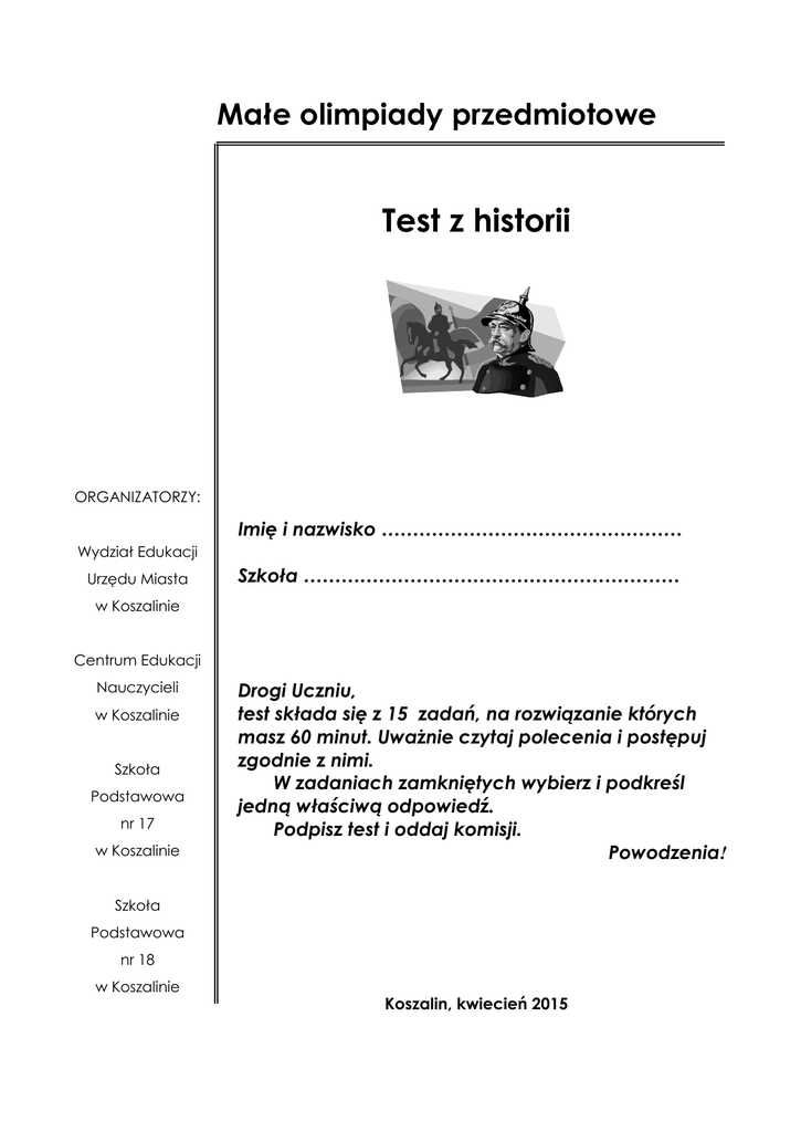 Małe olimpiady przedmiotowe Test z historii ORGANIZATORZY: Imię i nazwisko ………………………………………… Wydział Edukacji Urzędu Miasta Szkoła …………………………………………………… w Koszalinie Centrum Edukacji Nauczycieli w Koszalinie Szkoła Podstawowa nr 17 w Koszalinie Drogi Uczniu, test składa się z 15 zadań, na rozwiązanie których masz 60 minut. Uważnie czytaj polecenia i postępuj zgodnie z nimi. W zadaniach zamkniętych wybierz i podkreśl jedną właściwą odpowiedź. Podpisz test i oddaj komisji. Powodzenia! Szkoła Podstawowa nr 18 w Koszalinie Koszalin, kwiecień 2015 1. Wpisz podane daty do odpowiedniego wieku na taśmie chronologicznej. 776 r. p.n.e. , 476 r. p.n.e. , 44 r., 395 r. , 1320 r. XIV XIII XII XI X IX VIII VII VI V IV III II I Era starożytna I II III IV V VI VII VIII IX X XI XII XIII XIV Era nowożytna 2. Podkreśl zdania prawdziwe. a) Najważniejszymi filozofami grackimi byli Sokrates, Platon i Arystoteles. b) Rzym został założony zanim doszło do panowania Bolesława Chrobrego. c) Kolejnymi formami ustrojowymi państwa rzymskiego były: królestwo, republika, cesarstwo. d) Państwo rzymskie kilkakrotnie było widownią buntów niewolniczych, spośród których największy zasięg miało powstanie Spartakusa. 3. Z jakimi dziedzinami nauki i kultury kojarzą się podane osoby? a) Mikołaj Kopernik ....................................................................................... b) Mikołaj Rej ................................................................................................. c) Jan Kochanowski ......................................................................................... 4. Najważniejszym szlakiem transportowym Rzeczypospolitej XVI i XVII wieku była rzeka a) San. b) Odra. c) Wisła. d) Warta. 2 5. Uzupełnij wyjaśnienia właściwymi terminami historycznymi. a) ........................................... – wyższa izba sejmu walnego. b) ........................................... – przedstawiciel szlachty zasiadający w izbie poselskiej. c) ........................................... – urzędnik odpowiedzialny za finanse państwa. d) ............................................ – uprzywilejowany stan w społeczeństwie polskim XV – XVI w. e) ............................................. – ziemie dawane urzędnikom państwowym w czasowe użytkowanie jako wynagrodzenie. 6. Uzupełnij tabelę podanymi niżej wyrażeniami. Państwo, z którym Polska prowadziła wojnę Miejsce bitwy Rok Szwecja ................... 1605 ............... Kłuszyn 1610 Turcja .............. ................ Szwecja Dowódca wojsk polskich Jan Karol Chodkiewicz Rezultat walki ................... ................... .......... ....................... Stanisław Żółkiewski Chocim 1673 ........................ zwycięstwo Częstochowa ........... Augustyn Kordecki obrona twierdzy klęska 1655, zwycięstwo, 1620, Kircholm, Stanisław Żółkiewski, Jan Sobieski, Cecora, klęska, Rosja, Turcja. 3 7. Które z podanych wydarzeń jest właściwie zestawione z postacią? a) hołd pruski - Zygmunt II August, b) powstanie listopadowe - Romuald Traugutt, c) chrzest Polski - Jan III Sobieski, d) obrona Warszawy w 1939 roku - Stefan Starzyński. 8. Połącz pojęcie z jego znaczeniem, wpisując w wykropkowane miejsca odpowiednie cyfry. Jednego znaczenia nie wykorzystasz. a) ( ....) sejm konwokacyjny 1. Spisek magnatów w celu obalenia Konstytucji 3 maja, oficjalnie pod patronatem Katarzyny II. b) ( ....) targowica 2. Związek zbrojny organizowany w dawnej Polsce przez rycerstwo, szlachtę lub wojsko dla osiągnięcia ważnych celów politycznych. c) ( ....) konfederacja 3. Od XVII w. zjazd zbrojny szlachty w obronie ich przywilejów. 4.Zwoływany przez prymasa podczas bezkrólewia, zajmował się sprawami państwa i przygotowywał elekcję nowego władcy. 9. Niepodległość utraconą w 1795 roku Polska odzyskała w wyniku a) Wiosny Ludów. b) II wojny światowej. c) wojny krymskiej. d) I wojny światowej. 4 10. Na poniższej mapce: a) zakreskuj ziemie, jakie utraciła Polska w I rozbiorze, b) podkreśl nazwy państw biorących udział w II rozbiorze Polski c) zakreśl owalem nazwę miejscowości znanej z bohaterskiego zdobycia rosyjskiej armaty przez chłopa Wojciecha Bartosa (Bartosza). Po tej bitwie zyskał nazwisko Głowacki. 5 11. Poniższa mapka dotyczy wydarzeń związanych z II wojną światową. Podaj: a) miejsce prezentowanych działań wojennych ……………………………………………………………………………… b) datę rozpoczęcia prezentowanej bitwy ……………………………………………………………………………… c) nazwisko dowódcy wojsk broniących się ……………………………………………………………………………… 12. Ważnym osiągnięciem gospodarczym II Rzeczypospolitej była a) budowa linii metra w Warszawie. b) budowa portu dalekomorskiego w Gdyni. c) budowa portu w Gdańsku. d) budowa autostrady Warszawa – Kielce. 6 13. Największa bitwa wojny obronnej Polski w 1939 roku rozegrała się a) na Westerplatte. b) pod Kockiem. c) pod Warszawą. d) nad Bzurą. 14. Totalitaryzm to system rządów polegający na całkowitej kontroli obywateli przez państwo. W jakich krajach występował w okresie międzywojennym XX wieku? a) We Francji i Szwecji. b) W Hiszpanii i Wielkiej Brytanii. c) W Japonii i Czechosłowacji. d) W Niemczech i Związku Radzieckim. 15. Rozwiąż krzyżówkę i wyjaśnij hasło. 1. 2. 3. 4. 5. 6. 7. …………………………………………………………………………………………………... 1. Państwo, przeciw któremu Polacy wznieśli powstanie listopadowe i styczniowe. 2. Nazwisko współzałożyciela spisku Podchorążych. 3. Pobór do wojska, który stał się bezpośrednią przyczyną wybuchu powstania styczniowego. 4. Zespół kar, prześladowania wymierzon