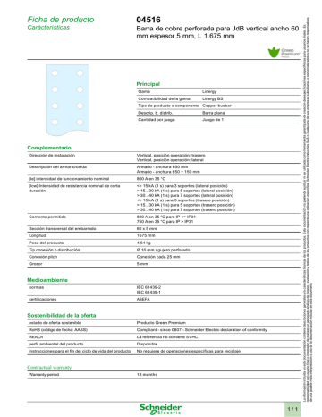 04516 Carácterísticas Barra de cobre perforada para JdB vertical ancho 60 mm espesor 5 mm, L 1.675 mm Principal Gama Linergy Compatibilidad de la gama Linergy BS Tipo de producto o componente Copper busbar Descrip. b. distrib. Barra plana Cantidad por juego Juego de 1 Complementario Dirección de instalación Vertical, posición operación: trasero Vertical, posición operación: lateral Descripción del armario/celda Armario - anchura 650 mm Armario - anchura 650 + 150 mm [Ie] intensidad de funcionamiento nominal 800 A en 35 °C [Icw] Intensidad de resistencia nominal de corta duración <= 15 kA (1 s) para 3 soportes (lateral posición) > 15...30 kA (1 s) para 5 soportes (lateral posición) > 30...40 kA (1 s) para 7 soportes (lateral posición) <= 15 kA (1 s) para 3 soportes (trasero posición) > 15...30 kA (1 s) para 5 soportes (trasero posición) > 30...40 kA (1 s) para 7 soportes (trasero posición) Corriente permitida 800 A en 35 °C para IP <= IP31 750 A en 35 °C para IP > IP31 Sección transversal del embarrado 60 x 5 mm Longitud 1675 mm Peso del producto 4.54 kg Tip conexión b distribución Ø 10 mm agujero perforado Conexión pitch Conexión cada 25 mm Grosor 5 mm Medioambiente normas IEC 61439-2 IEC 61439-1 certificaciones ASEFA Sostenibilidad de la oferta estado de oferta sostenible Producto Green Premium RoHS (código de fecha: AASS) Compliant - since 0807 - Schneider Electric declaration of conformity REACh La referencia no contiene SVHC perfil ambiental del producto Disponible instrucciones para el fin del ciclo de vida del producto No requiere de operaciones específicas para reciclaje Contractual warranty Warranty period 18 months 1/1 La información incluída en esta documentación contiene descripciones generales y/o características técnicas de los productos. Esta documentación no pretende sustituir ni ser utilizada como herramienta garantizada de creación de especificaciones específicicas para usuarios finales. Es responsabilidad del usuario final o integrador de realizar un apropiado análisis de riesgos, evaluación y testeo de los productos con respecto una aplicación específica. Schneider Electric Industries SAS o cualquiera de sus empresas subsidiarias o comercializadoras no se hacen responsables de una posible mala interpretación o uso de la documentación incluída en este documento Ficha de producto