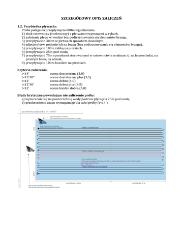 SZCZEGÓŁOWY OPIS ZALICZEŃ 1.2. Przebieżka pływacka Próba polega na przepłynięciu 600m wg schematu: 1) skok ratowniczy (rozkroczny) z płetwami trzymanymi w rękach, 2) założenie płetw w wodzie bez podtrzymywania się elementów brzegu, 3) przepłyniecie 300m w płetwach sposobem dowolnym, 4) zdjęcie płetw, podanie ich na brzeg (bez podtrzymywania się elementów brzegu), 5) przepłynięcie 100m żabką na piersiach, 6) przepłynięcie 25m pod wodą, 7) przepłynięcie 75m sposobami stosowanymi w ratownictwie wodnym: tj. na lewym boku, na prawym boku, na wznak, 8) przepłynięcie 100m kraulem na piersiach. Kryteria zaliczenia: t<14' t<13'30'' t<13' t<12'30' t<12' ocena dostateczna (3,0) ocena dostateczna plus (3,5) ocena dobra (4,0) ocena dobra plus (4,5) ocena bardzo dobra (5,0) Błędy krytyczne powodujące nie zaliczenie próby: a) wynurzenie się na powierzchnię wody podczas płynięcia 25m pod wodą, b) przekroczenie czasu wymaganego dla całej próby (t<14'). 2.1. 100m kombinacja Ratownik wykonuje start z brzegu pływalni (lub pomostu), pokonuje dystans 50m dowolnym sposobem, następnie przepływa 15m pod wodą, podejmuje leżącego na dnie manekina zgodnie z zasadami sztuki ratowniczej (głębokość min. 0,8m), holuje go sposobem oburącz za doły pachowe lub za głowę na dystansie 35m. Po zakończeniu holowania ratownik natychmiast wychodzi na brzeg, gdzie na przygotowanym fantomie prezentuje schemat czynności WBLS. Błędy krytyczne powodujące nie zaliczenie próby: a) brak kontaktu wzrokowego z tonącym podczas skoku, b) wynurzenie się na powierzchnię wody podczas płynięcia 15m pod wodą, c) niezgodne ze sztukę ratowniczą podjęcie z dna manekina, d) przytapianie manekina podczas holowania, e) przekroczenie czasu wymaganego dla całej próby (t<3'), f) popełnienie jakiegokolwiek błędu w algorytmie WBLS. 2.2. 100m w ubraniu Ratownik ubrany w koszulkę (t-shirt) oraz szorty wykonuje start z brzegu pływalni (skok wykroczny), pokonuje dystans 45m dowolnym sposobem, schodzi pod wodę na głębokość co najmniej 1,8m do leżącego na dnie manekina, podejmuje go na powierzchnię wody, holuje 50m na boku, pracując nogami skrzyżnie (praca nożycowa). Po zakończeniu holowania ratownik natychmiast wychodzi na brzeg, gdzie na przygotowanym fantomie prezentuje schemat czynności WBLS. Błędy krytyczne powodujące nie zaliczenie próby: a) brak kontaktu wzrokowego z tonącym podczas skoku, b) niezgodne ze sztukę ratowniczą podjęcie z dna manekina, c) przytapianie manekina podczas holowania, d) przekroczenie czasu wymaganego dla całej próby (t<3'), e) popełnienie jakiegokolwiek błędu w algorytmie WBLS. 2.3. 75m ze sprzętem Ratownik wyposażony w boję "SP" lub pas ratunkowy "węgorz" wykonuje start z brzegu pływalni (skok ratowniczy), pokonuje dystans 10m dowolnym sposobem, schodzi pod wodę po czym przepływa odległość 15m pod wodą, następnie przepływa dowolnym sposobem dystans 20m w kierunku tonącego (osoby markującej tonącego), opanowuje tonącego, podaje sprzęt, holuje na dystansie 25m na dowolnym sposobem. Po zakończeniu holowania ratownik w zależności od warunków wybiera sposób ewakuacji poszkodowanego na brzeg, gdzie następnie prezentuje schemat czynności WBLS. Błędy krytyczne powodujące nie zaliczenie próby: a) brak kontaktu wzrokowego z tonącym podczas skoku, b) pozostawienie sprzętu na brzegu podczas rozpoczynania akcji, c) wynurzenie się na powierzchnię wody podczas płynięcia 15m pod wodą, d) niewłaściwe opanowanie tonącego (zezwolenie na kontakt z tonącym przed jego opanowaniem, e) przytapianie tonącego podczas holowania, f) przekroczenie czasu wymaganego dla całej próby (t<2'), g) popełnienie jakiegokolwiek błędu w algorytmie WBLS. 2.4. 100m z użyciem łodzi wiosłowej: Na torze wytyczonym w ten sposób, że w linii prostopadłej od pomostu znajdują się dwie boje oddalone od pomostu o 25 i 50 m, ratownik wykonuje start z pomostu poprzez wskoczenie do łodzi ustawionej dziobem w kierunku boji (wiosła nie mogą być umieszczone w dulkach). Poruszając się z pomocą dwóch wioseł należy opłynąć dookoła pierwszą boję, natomiast przed drugą należy się zatrzymać i odwrócić do niej rufą, po czym dotknąć ją ręką imitując w ten sposób podjęcie człowieka na pokład. Po dotknięciu ręką boji, należy przy pomocy tylko jednego wiosła wrócić do pomostu po drodze opływając dookoła pierwszą boję. Czas zatrzymywany jest na wysokości pomostu. Błędy krytyczne powodujące nie zaliczenie próby: a) brak pełnego opłynięcia pierwszej boji, b) dotknięcie jakąkolwiek częścią łodzi lub wioseł drugiej boji (dotyczy zdarzeń przed „podjęciem” tonącego na pokład), c) brak imitacji podjęcia tonącego na pokład (należy z części ruchowej dotknąć boji dłonią), c) przekroczenie czasu wymaganego dla całej próby (t<4'). 2.5. Rzut kołem ratunkowym na odległość 10m oraz rzutką rękawową na odległość 10m: Zadaniem ratownika jest wykonanie dowolną techniką celnego rzutu na odległość 10 m, tak aby koło upadło pomiędzy dwie boje wyznaczające tor o szerokości 2 m, a następnie za pomocą rzutki rękawowej wykonaniu dowolną techniką rzutu do koła ratunkowego. Celny rzut będzie wówczas, gdy rzutka lub jej linka osiągnie kontakt z korpusem koła ratunkowego. Dopuszczalna jest korekta rzutu polegająca na właściwym ściągnięciu rzutki. Ratownik może wykonać łącznie co najwyżej pięć rzutów. Błędy krytyczne powodujące nie zaliczenie próby: a) brak celności (zarówno dla koła jak i rzutki), b) przekroczenie dopuszczalnej ilości podejść, c) utrata stałego kontaktu z kołem lub rzutką.