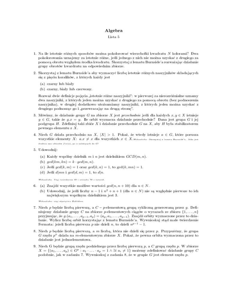 ªanie. Wylicz liczb¦ orbit korzystaj¡c z lematu Burnside'a. Wywnioskuj st¡d maªe twierdzenie